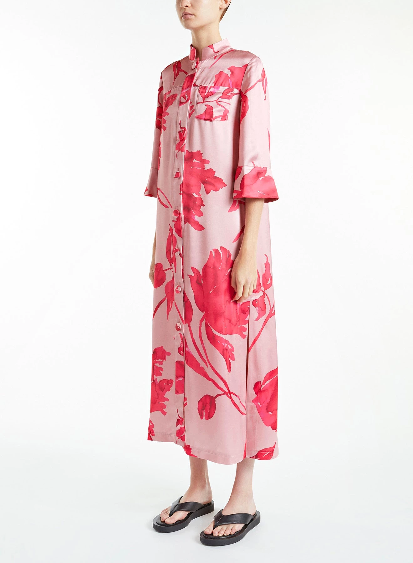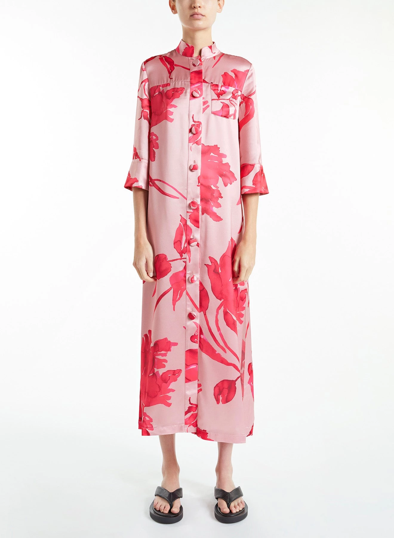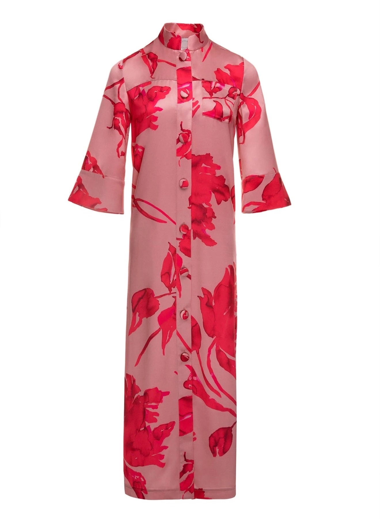 The Amber is a ¾ sleeved, ankle-length dress, made from a ballerina pink satin in a watercolour fuchsia floral print, developed in house. It has a Korean-style neckline, flouncy sleeves and self-fabric buttons throughout the front.