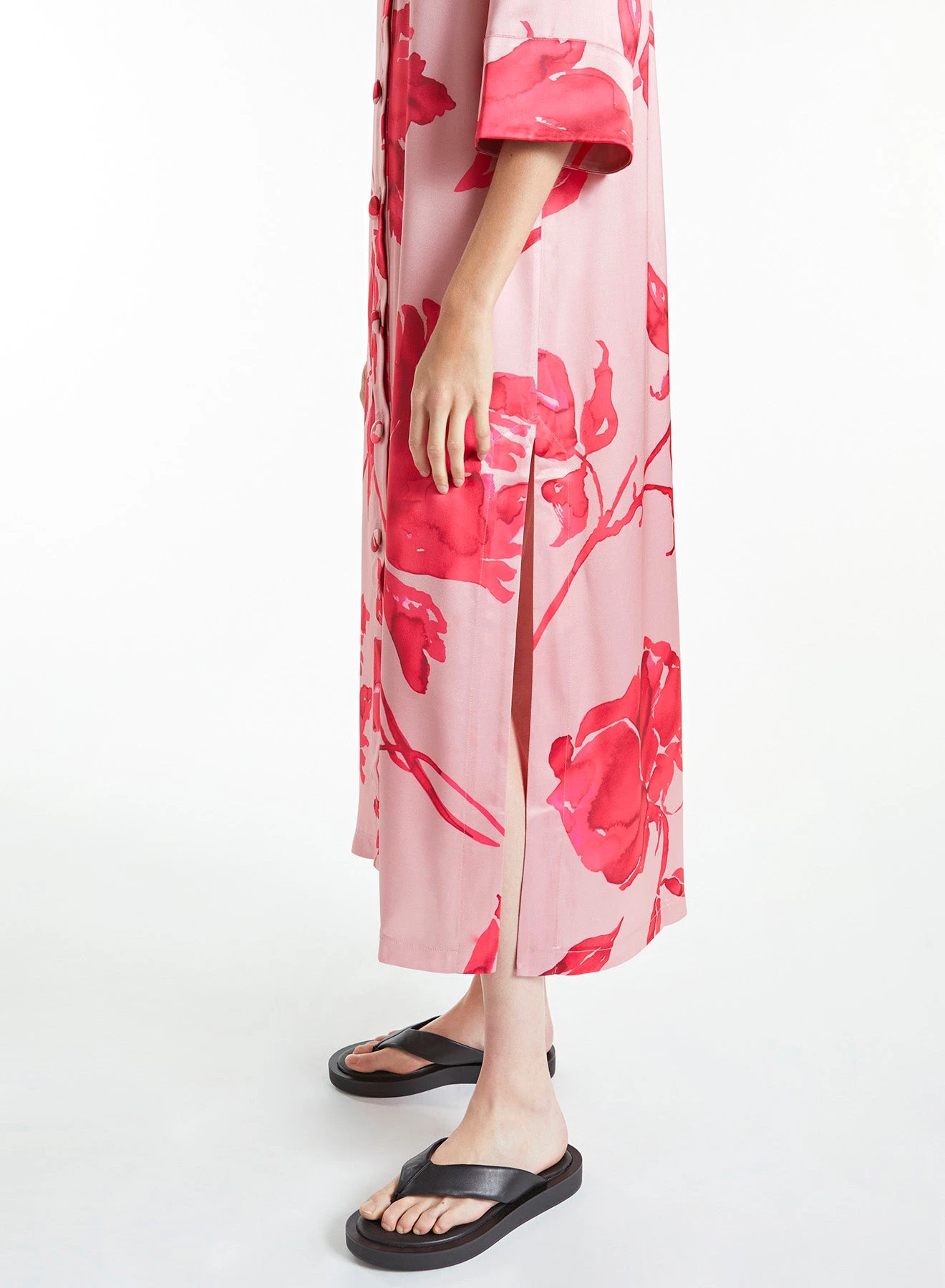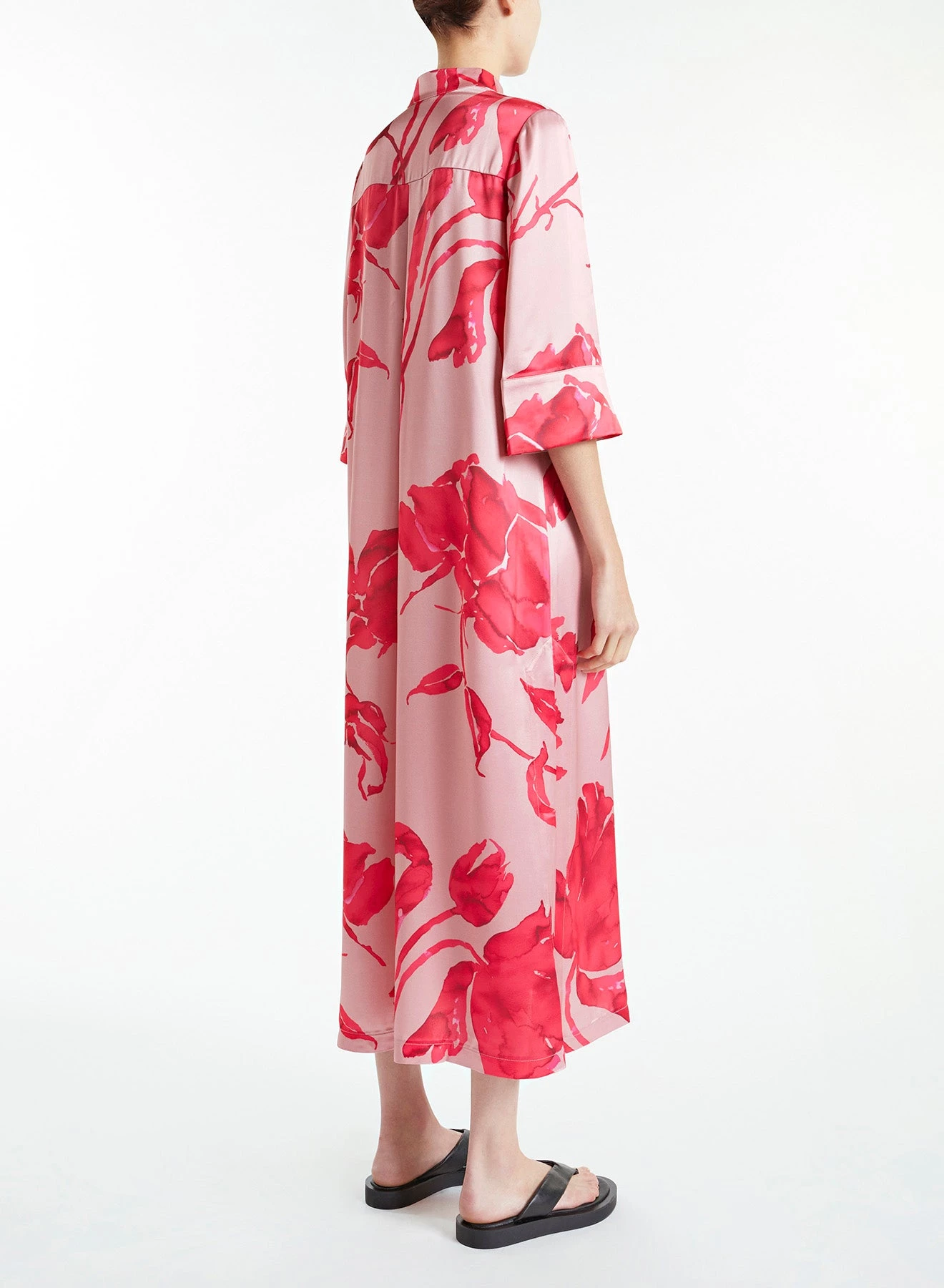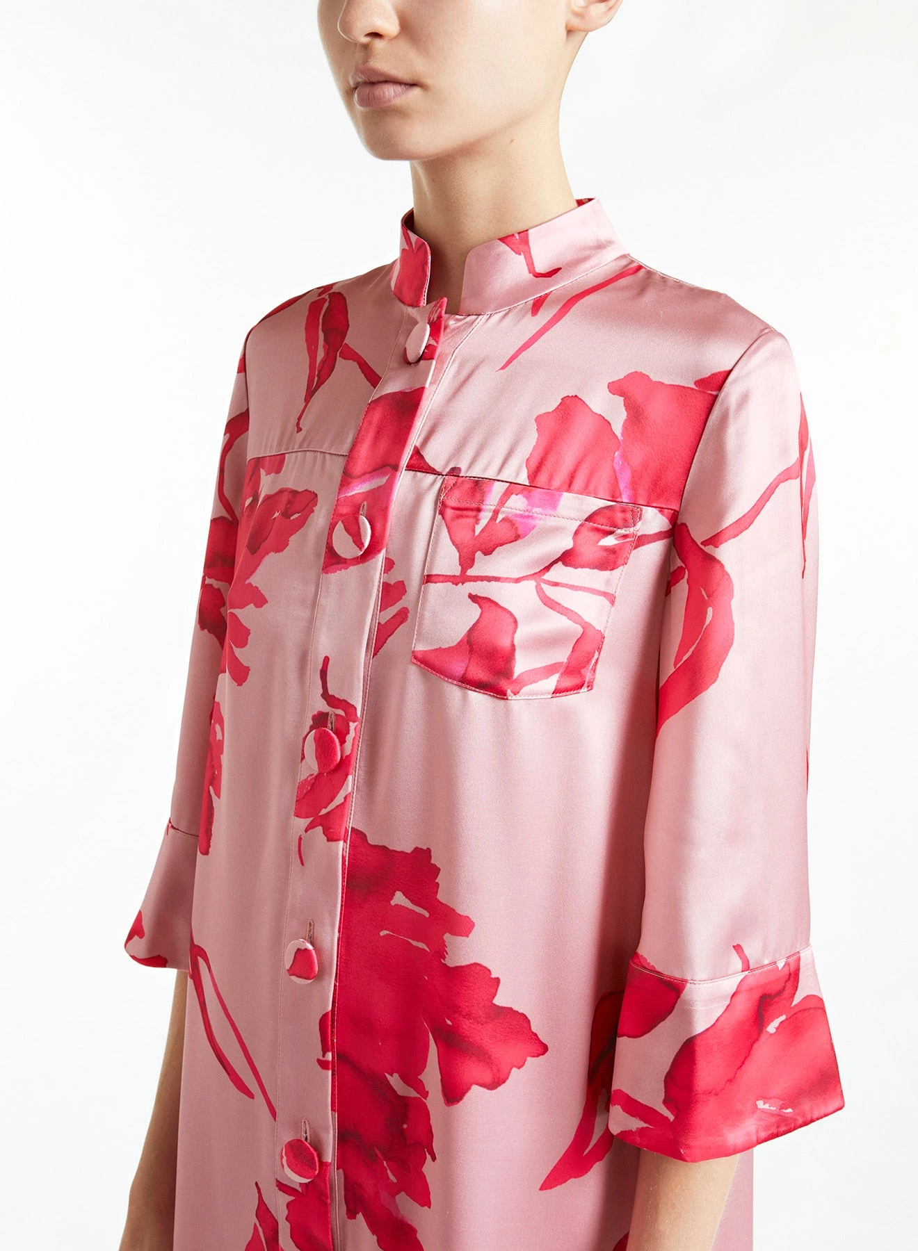 The Amber is a ¾ sleeved, ankle-length dress, made from a ballerina pink satin in a watercolour fuchsia floral print, developed in house. It has a Korean-style neckline, flouncy sleeves and self-fabric buttons throughout the front.