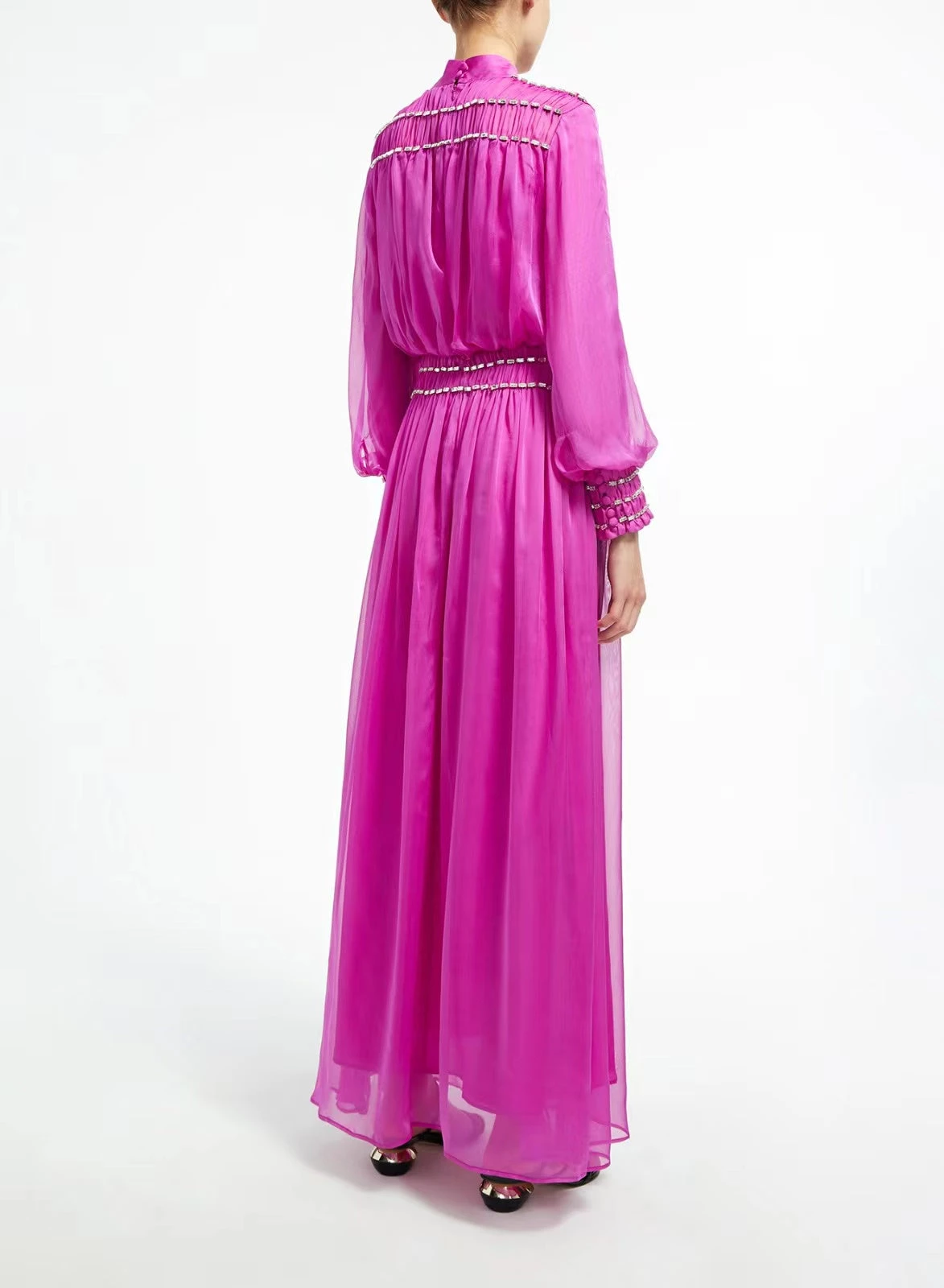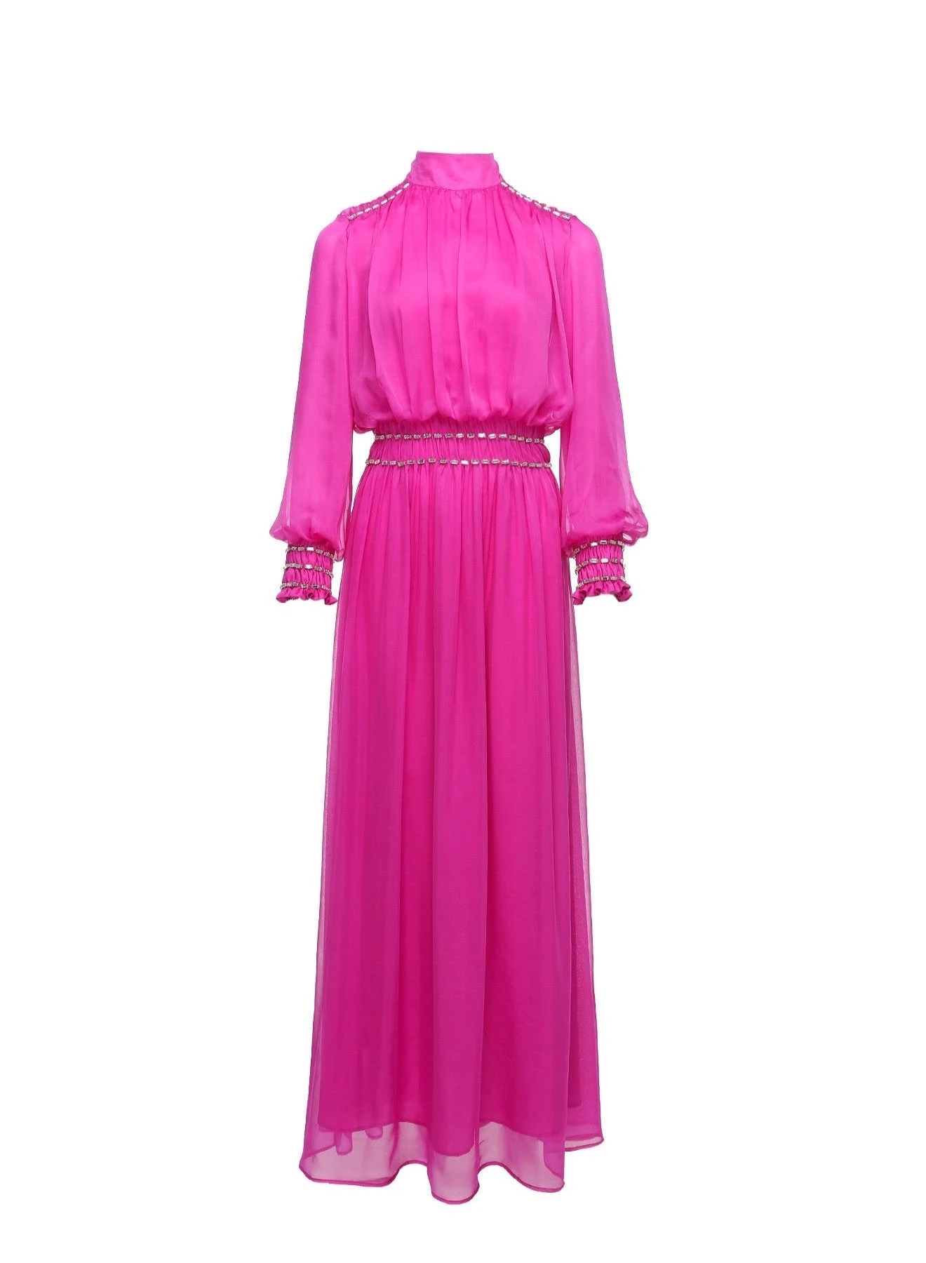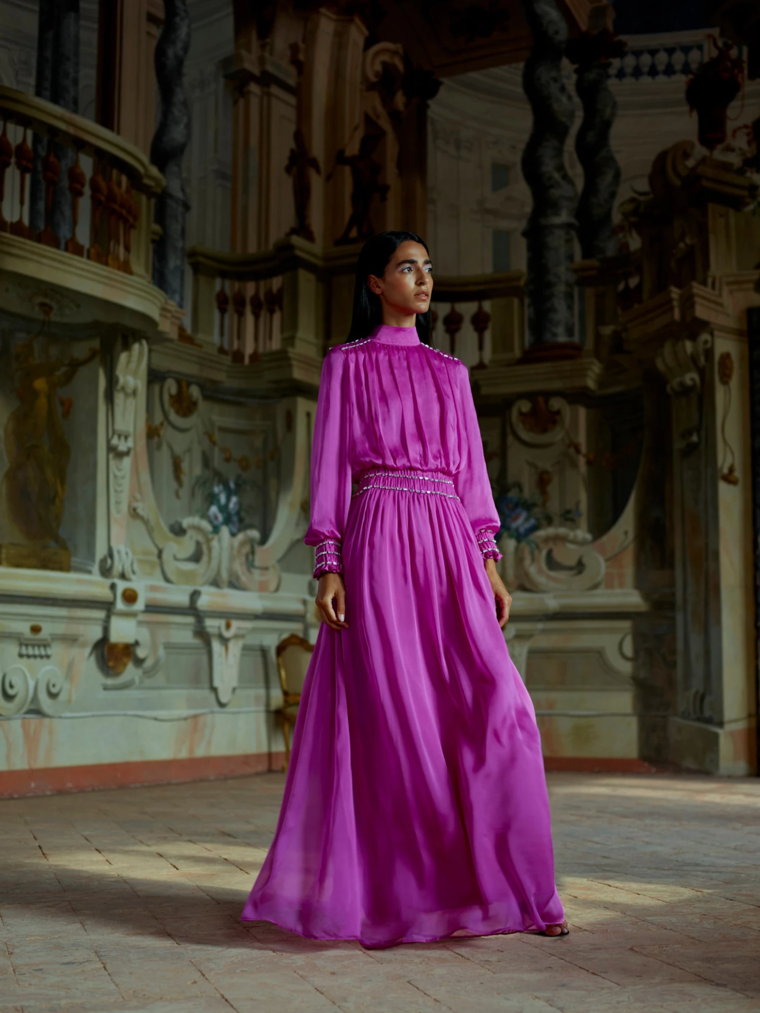 The Athena Gown is a long-sleeved flounce dress made from fuchsia voile. It has a loose fit and it cinches at the waistline for a more feminine silhouette. The halter neck, pleats and crystal embellishment make this look unique for every event, either if it is day time or evening.