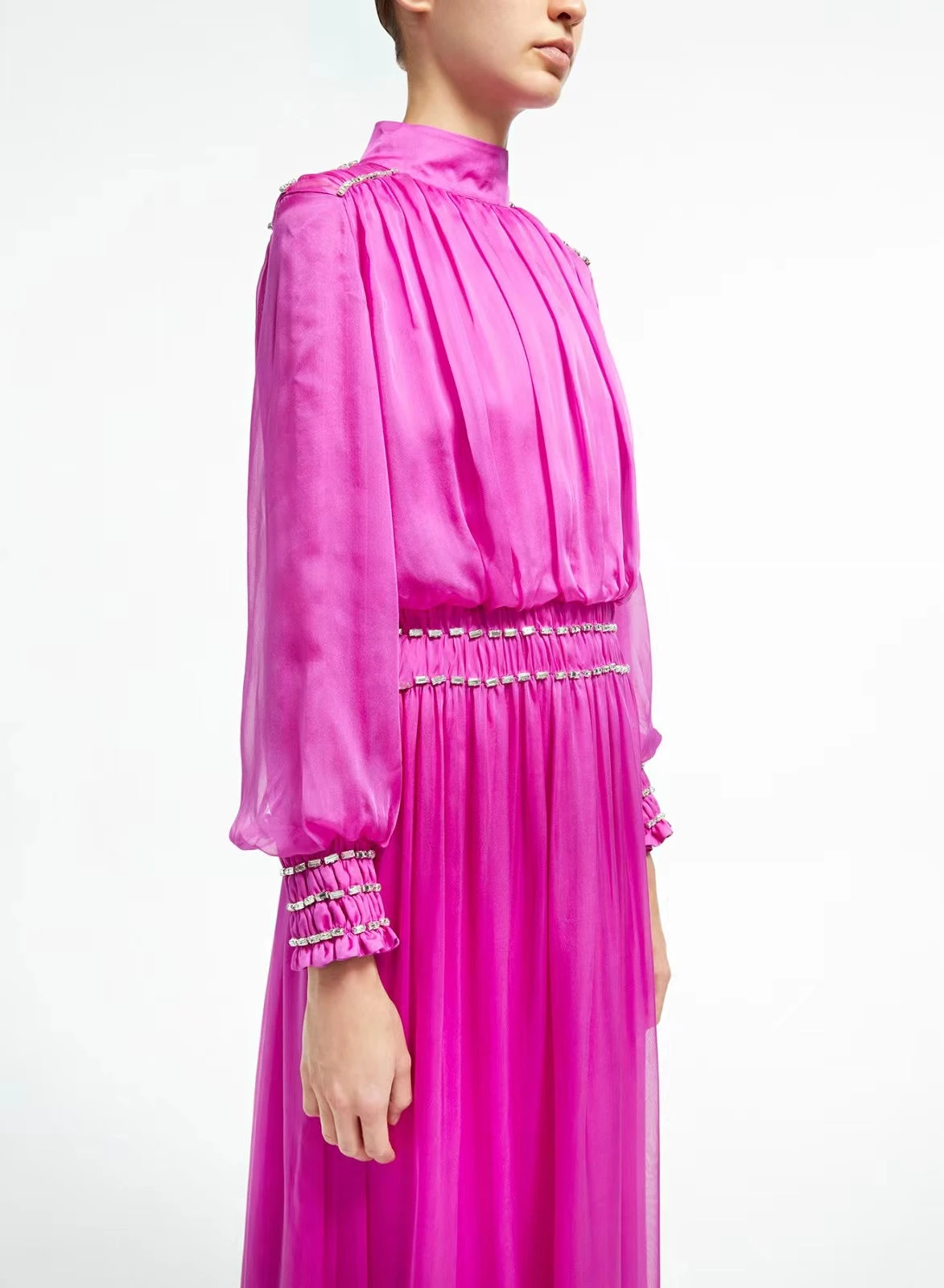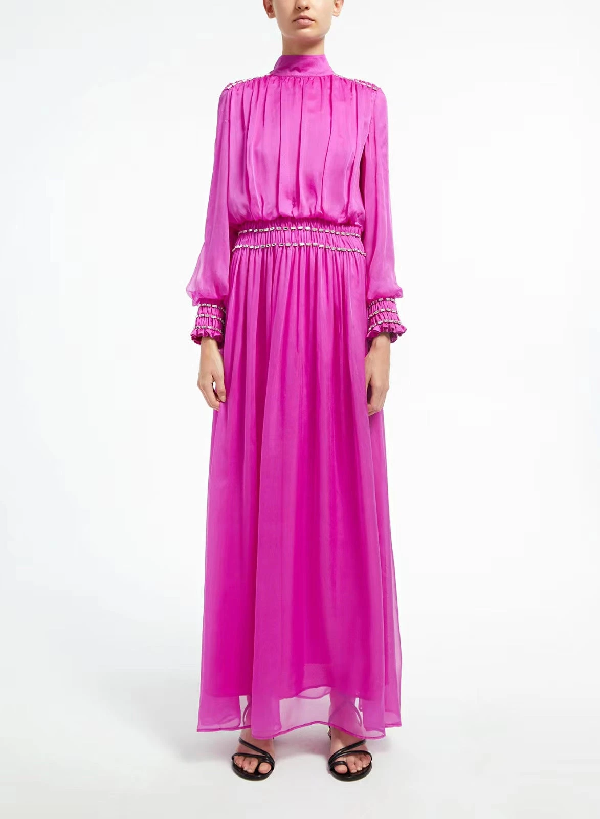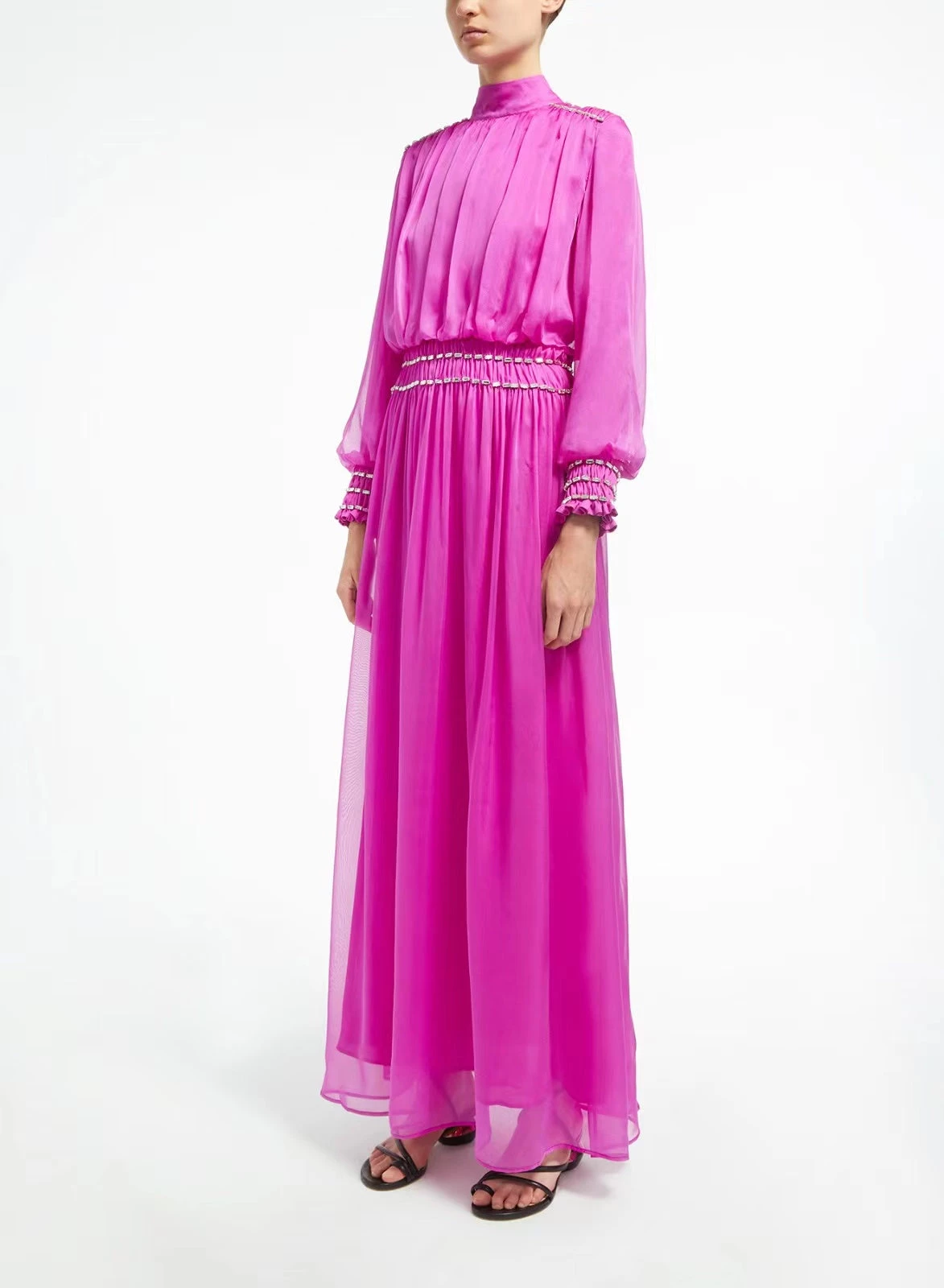 The Athena Gown is a long-sleeved flounce dress made from fuchsia voile. It has a loose fit and it cinches at the waistline for a more feminine silhouette. The halter neck, pleats and crystal embellishment make this look unique for every event, either if it is day time or evening.