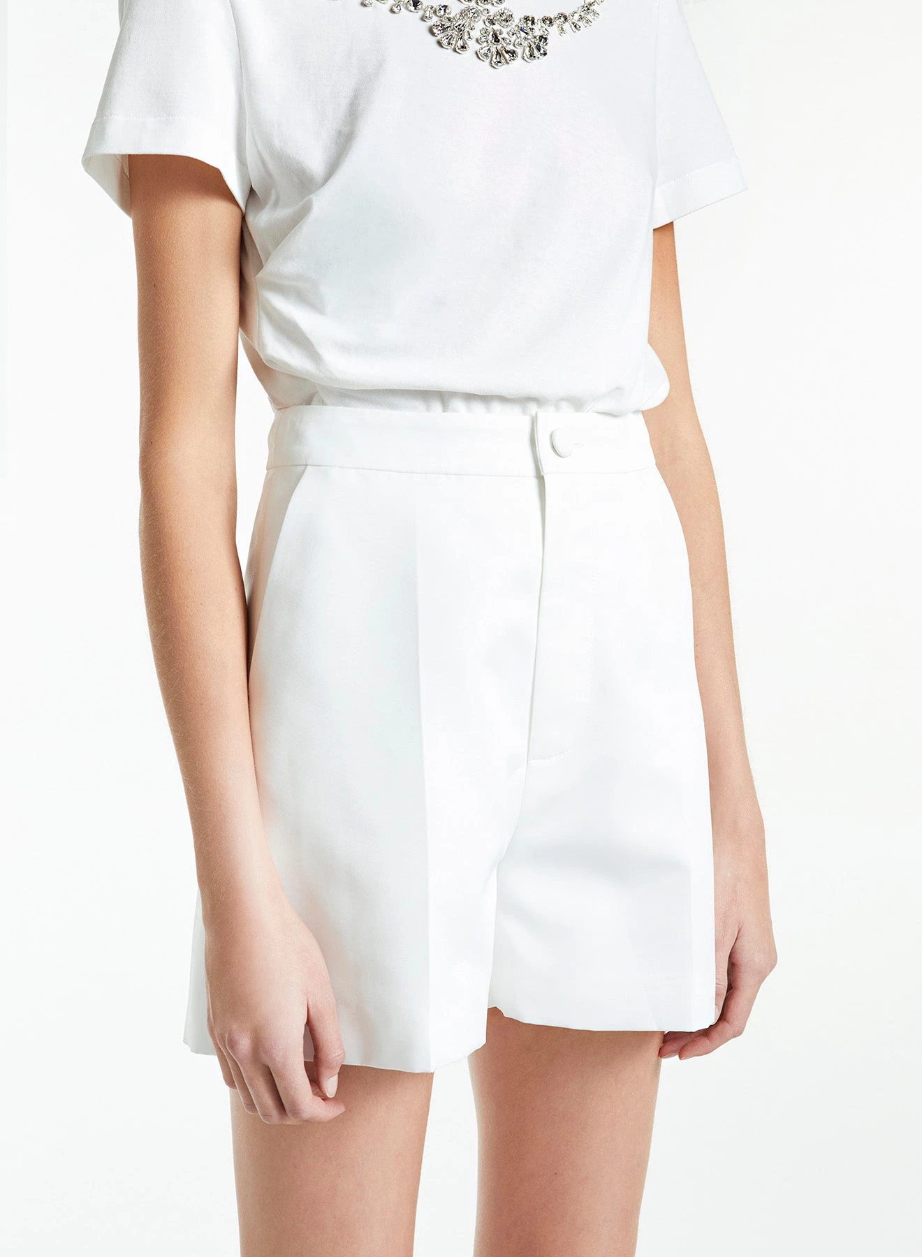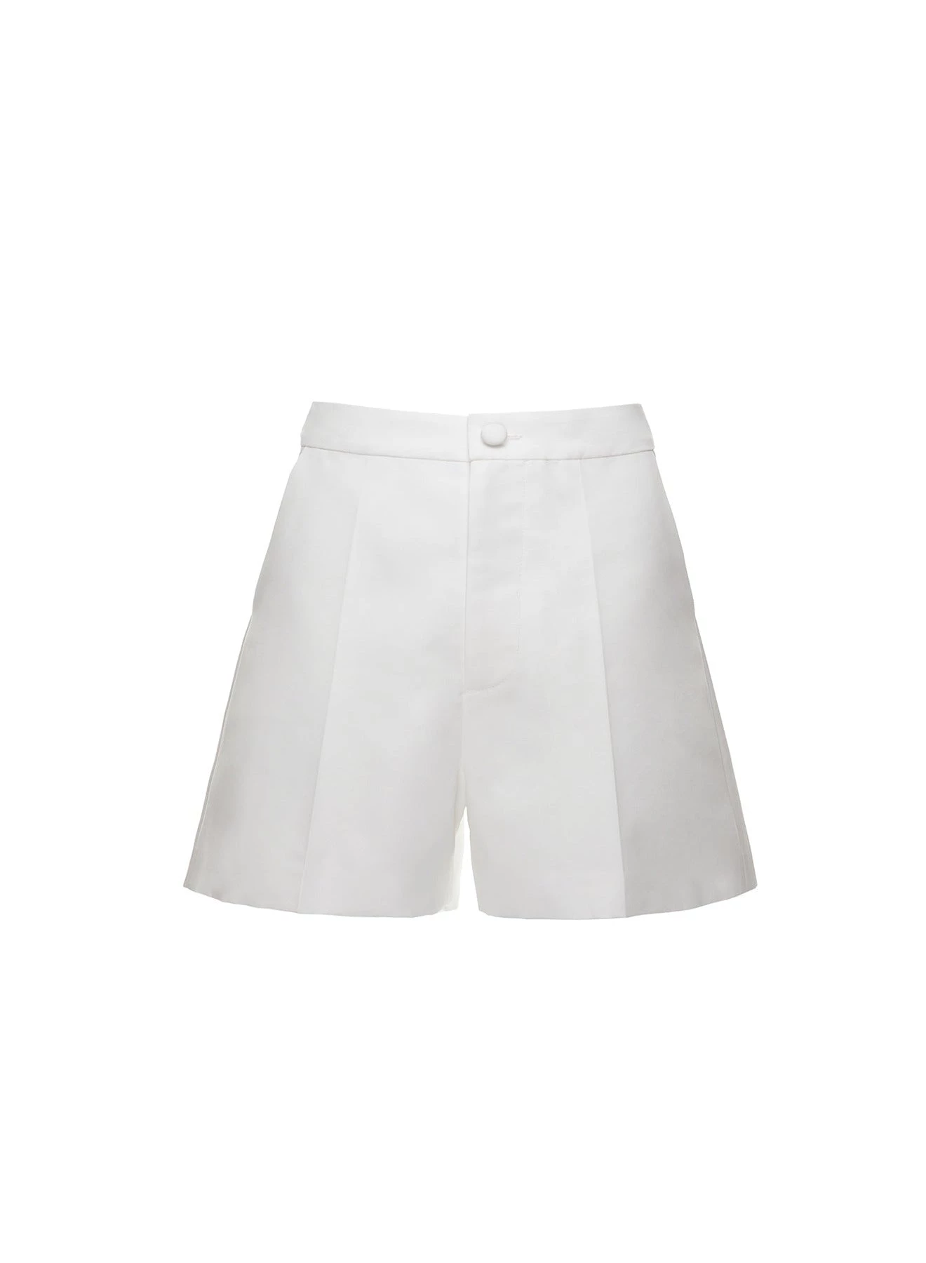 The Belle are high waisted structured shorts made from midweight white cotton with front button and zip fastening.