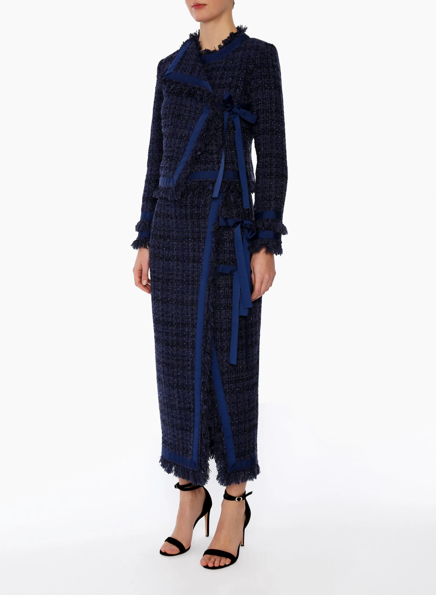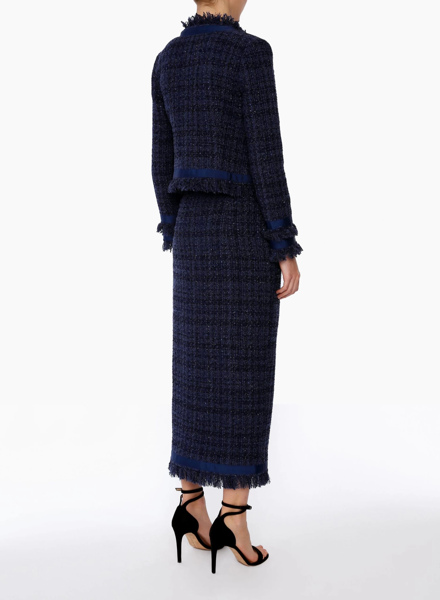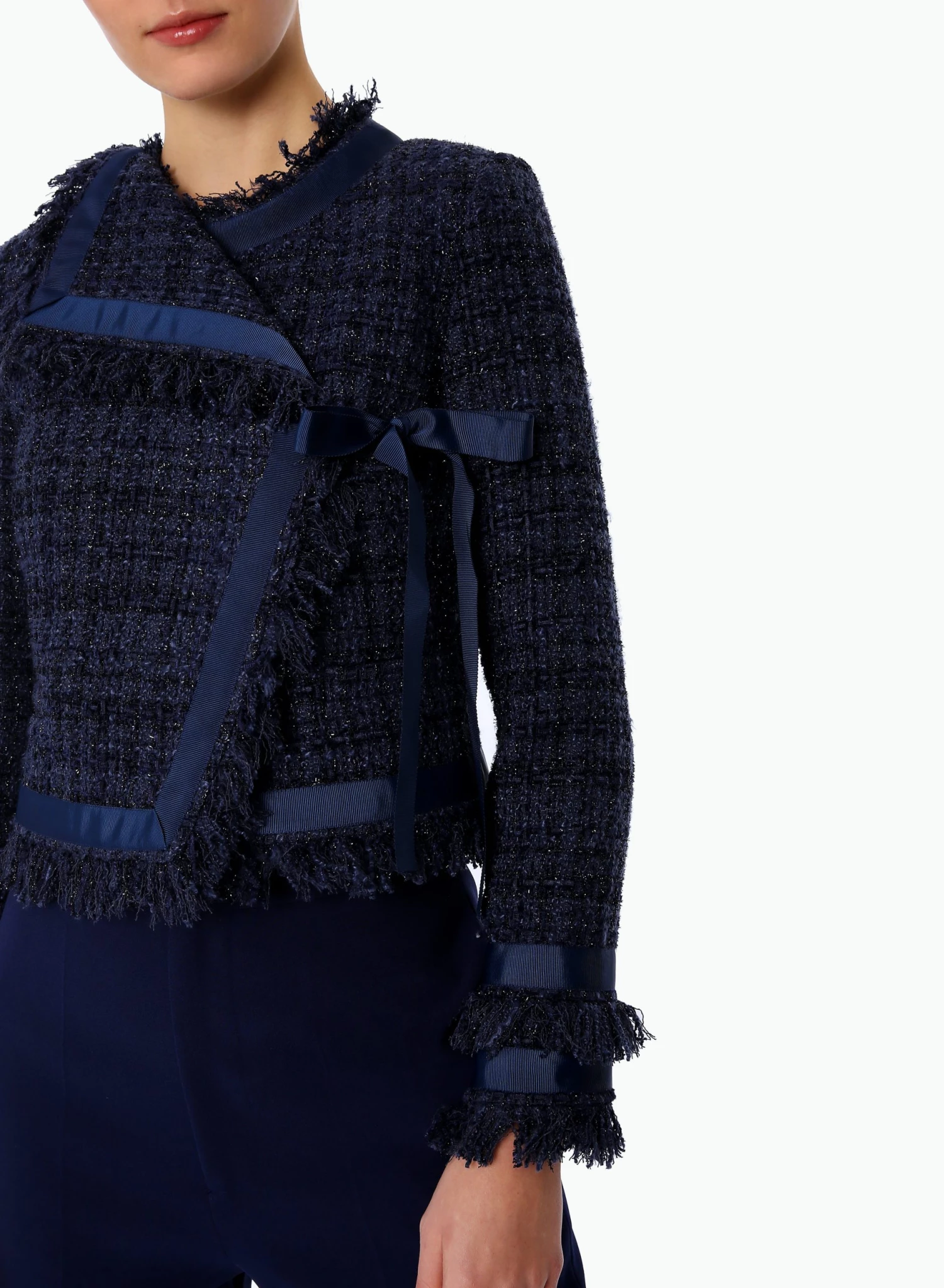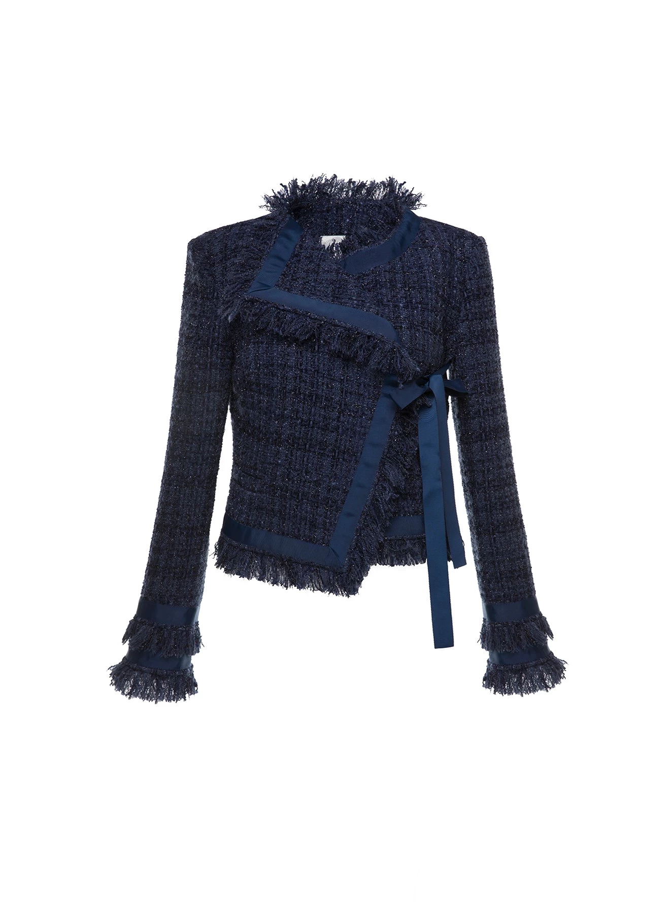 The Brea Jacket is an asymmetric blazer cut from metallic, checked navy tweed with self-fringe hems. It features tonal grosgrain ribbon trims that functions as a tie closure at the front and an interior button closure. Paired with the Dauphine Skirt.