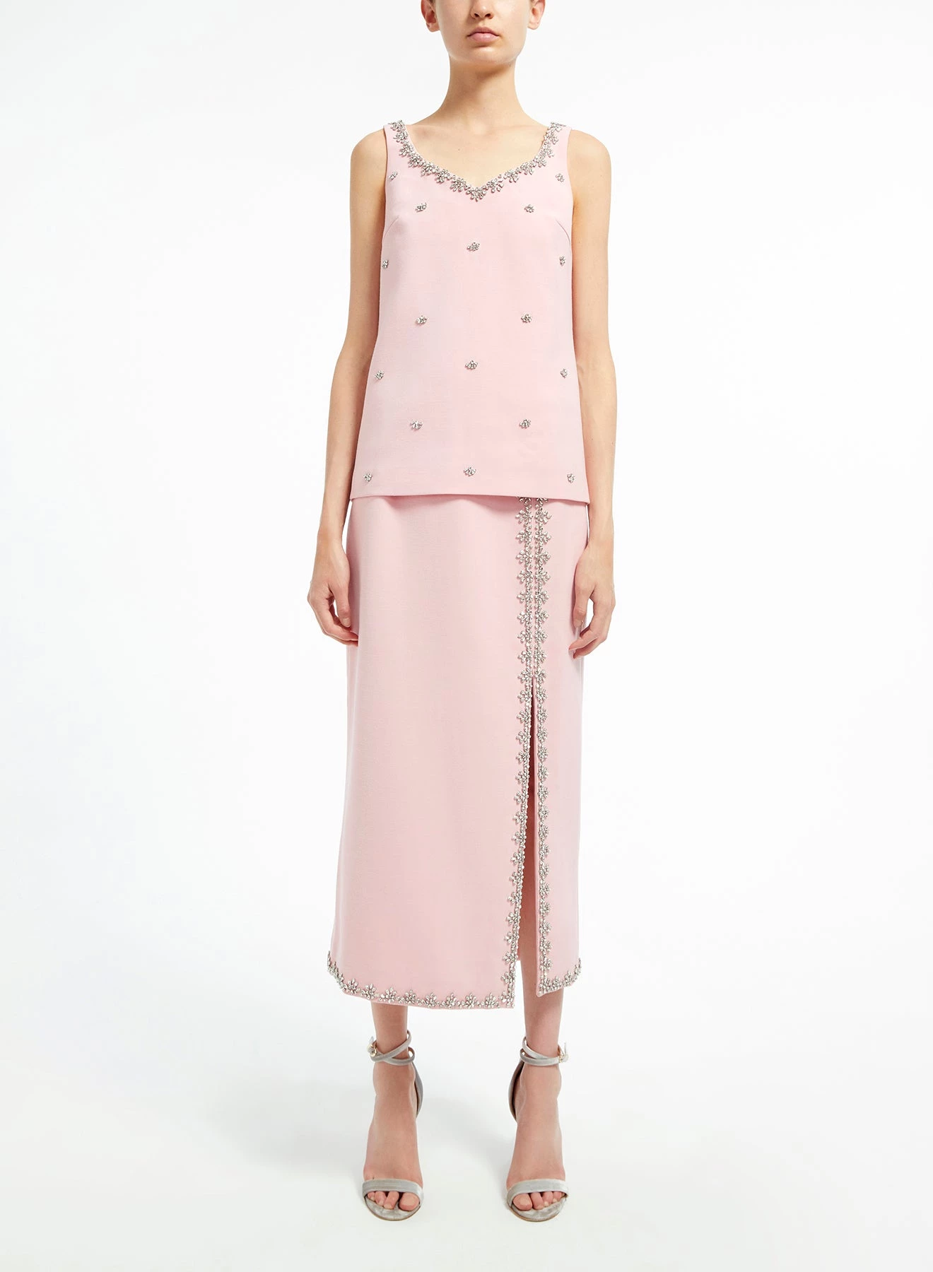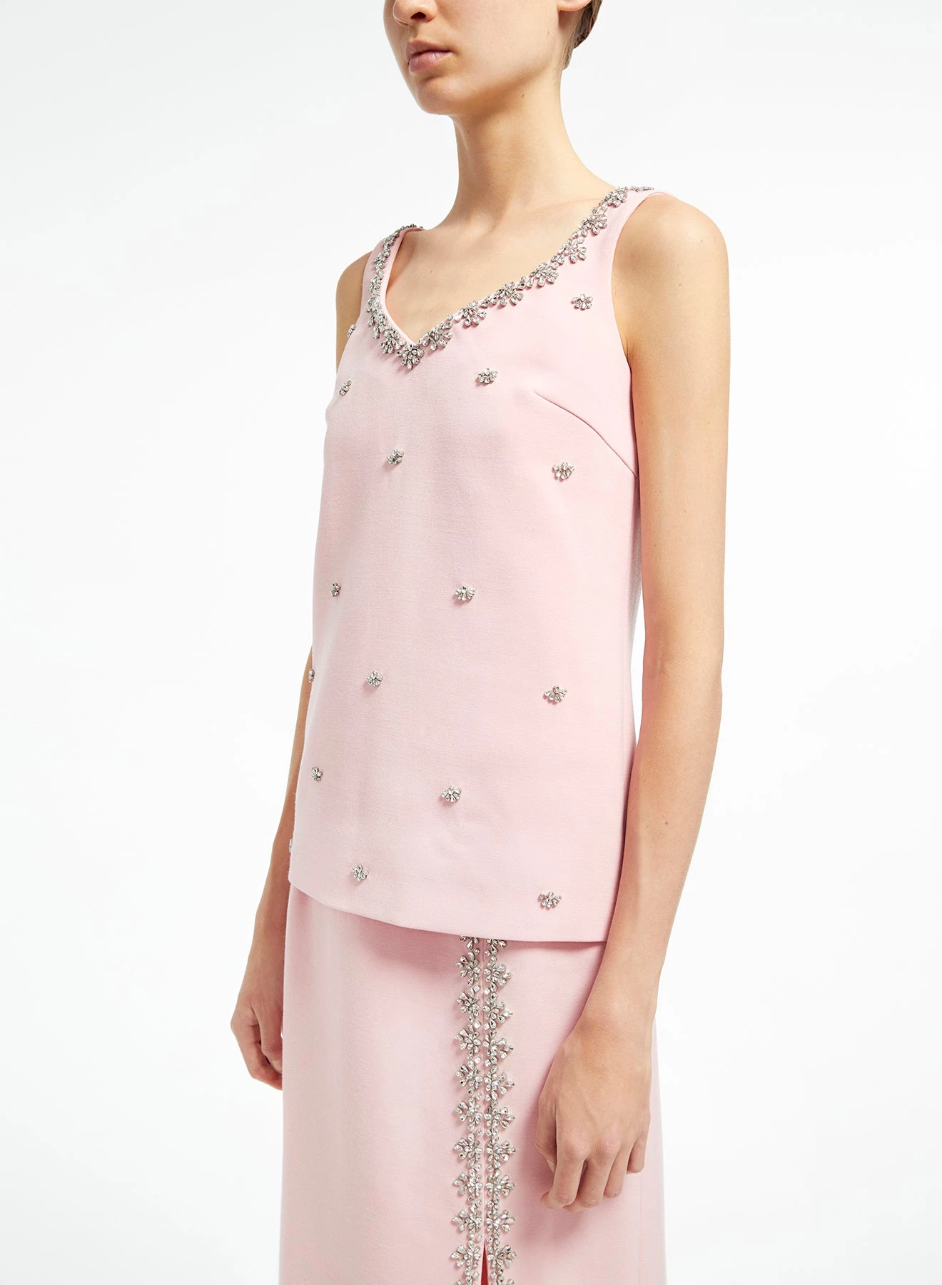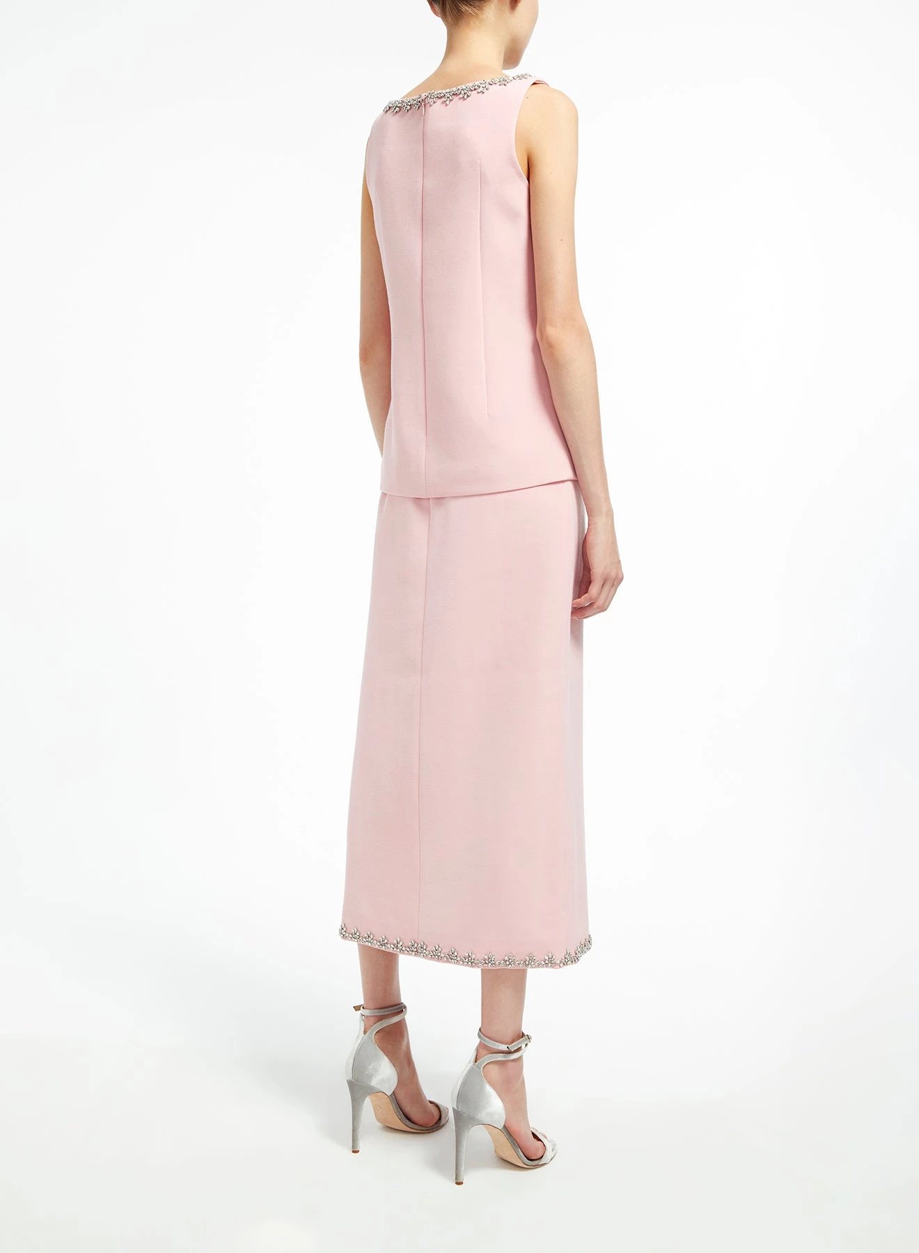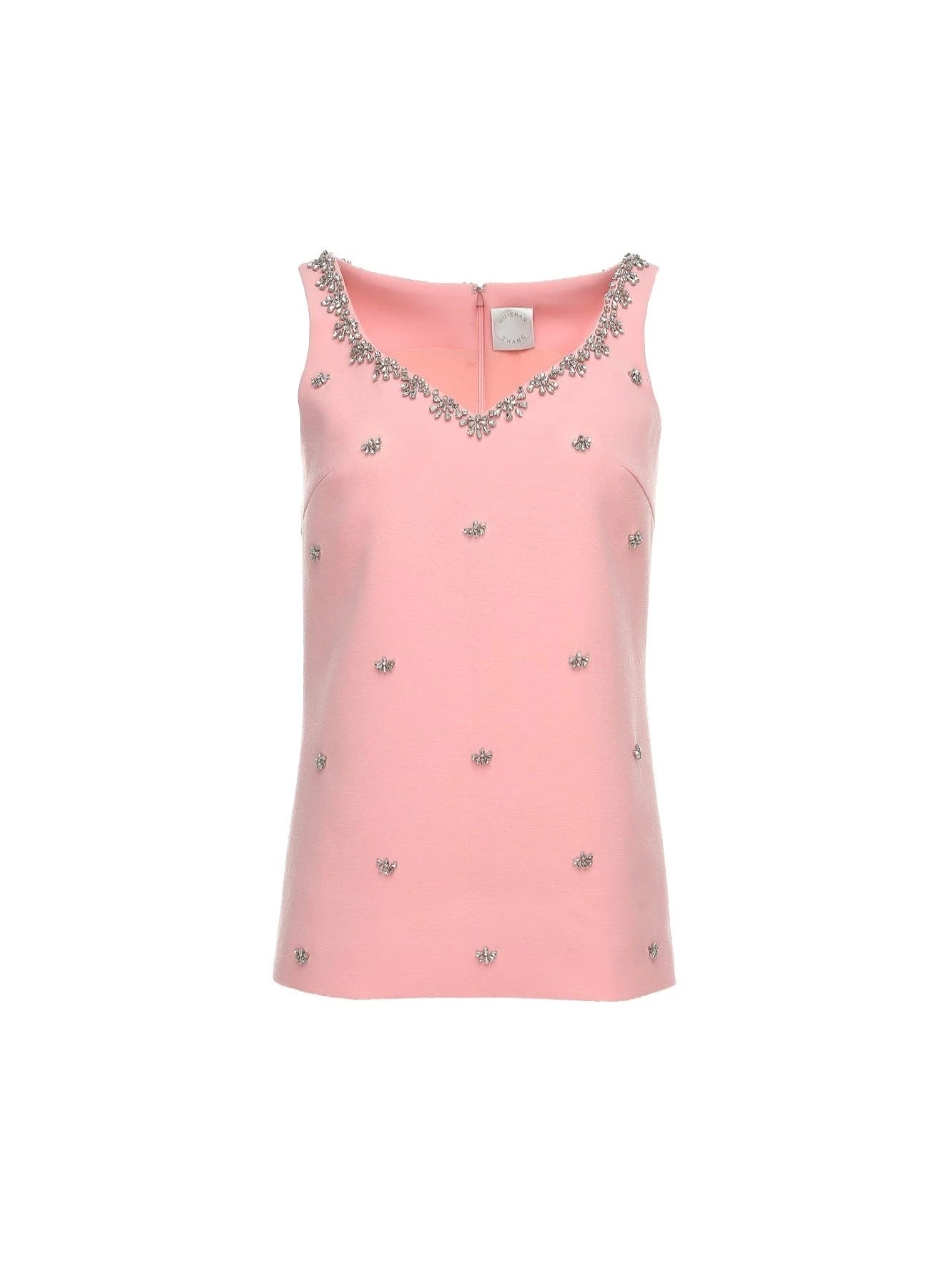 The Cordelia Top is a sleeveless top tailored from ballerina-pink Italian Crepe Cady embellished with crystals. It has a heart-shaped neckline and Watteau back.