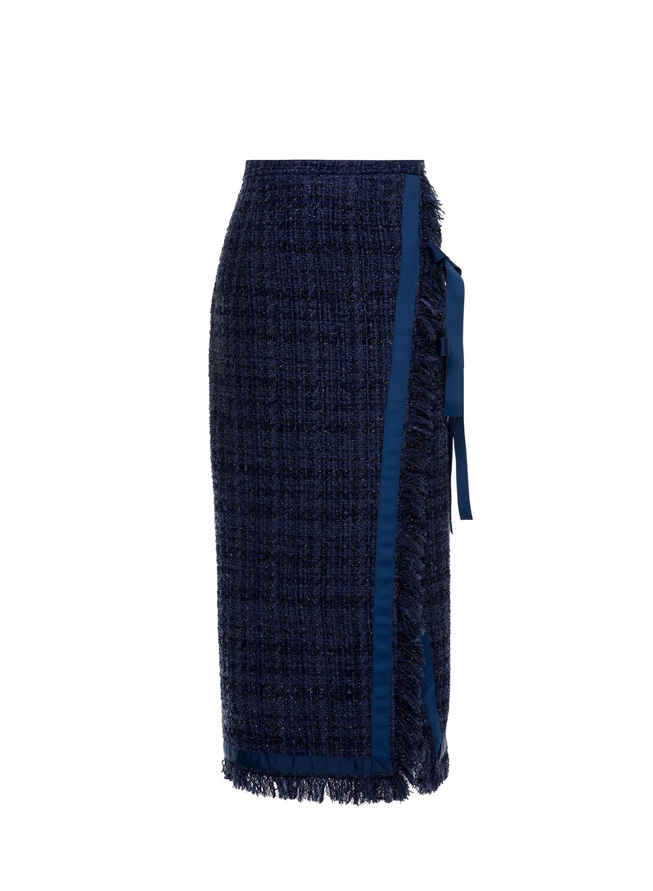 The Dauphine Skirt is a midi length wrap-skirt cut from metallic, checked navy tweed with self-fringe hems. It features tonal grosgrain ribbon trims and two self-tie closures. Paired with the Brea Jacket.