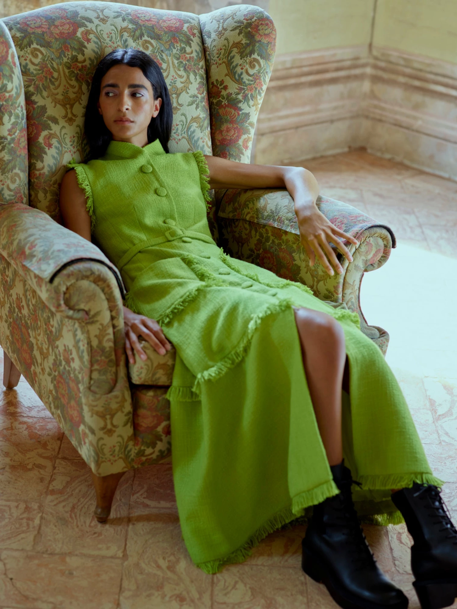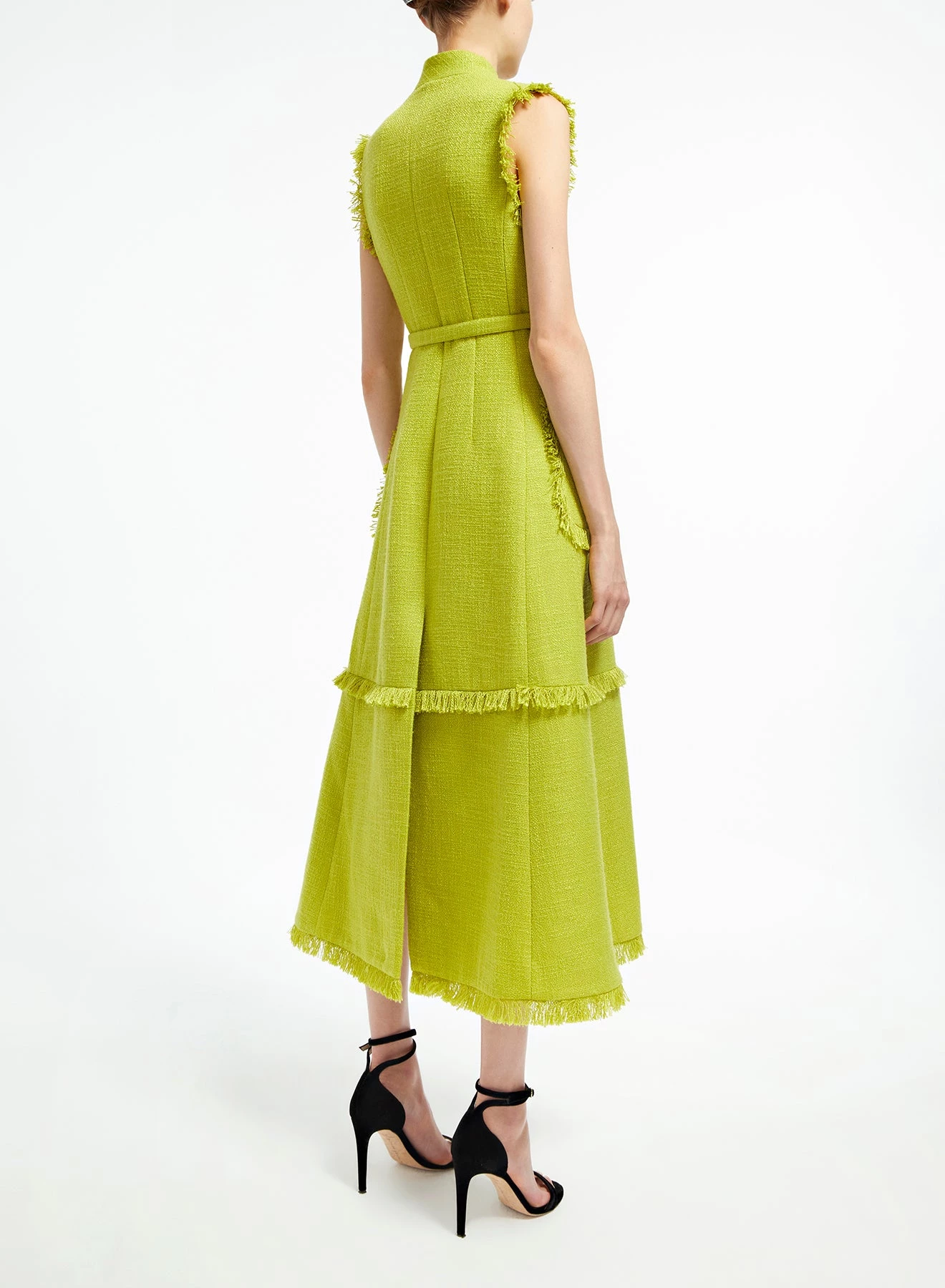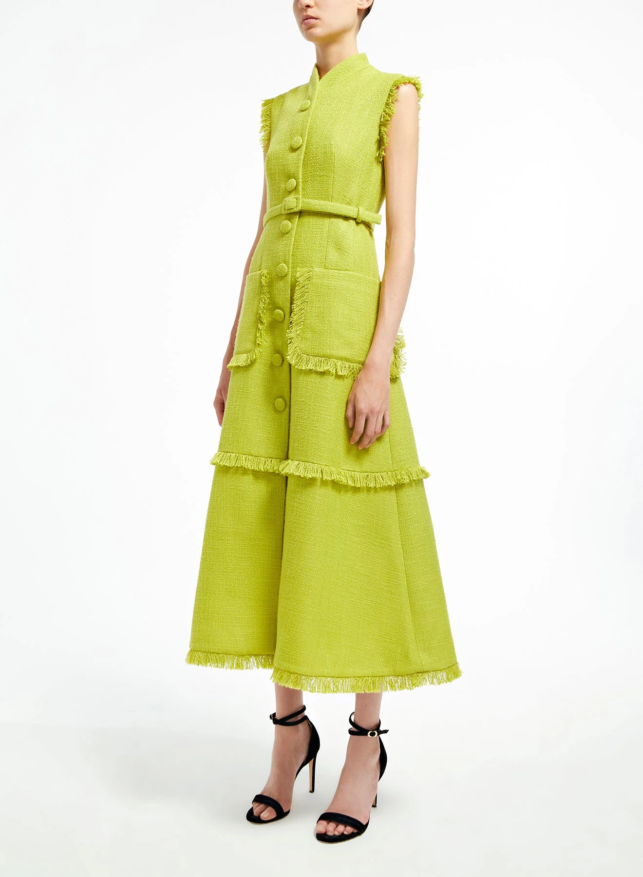 The Felicity dress is a sleeveless gilet-dress tailored from mid-weight lime-green tweed, embellished with self-fabric fringed hems. It has a mandarin-style collar, full skirt, large squared pockets and a defining waist belt.