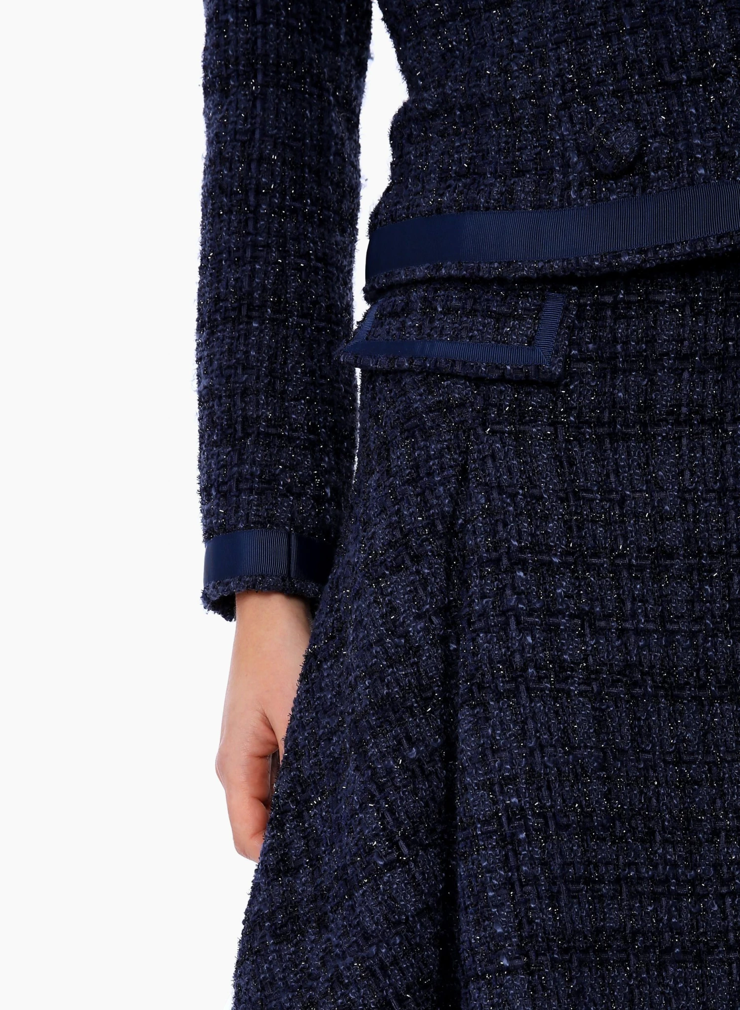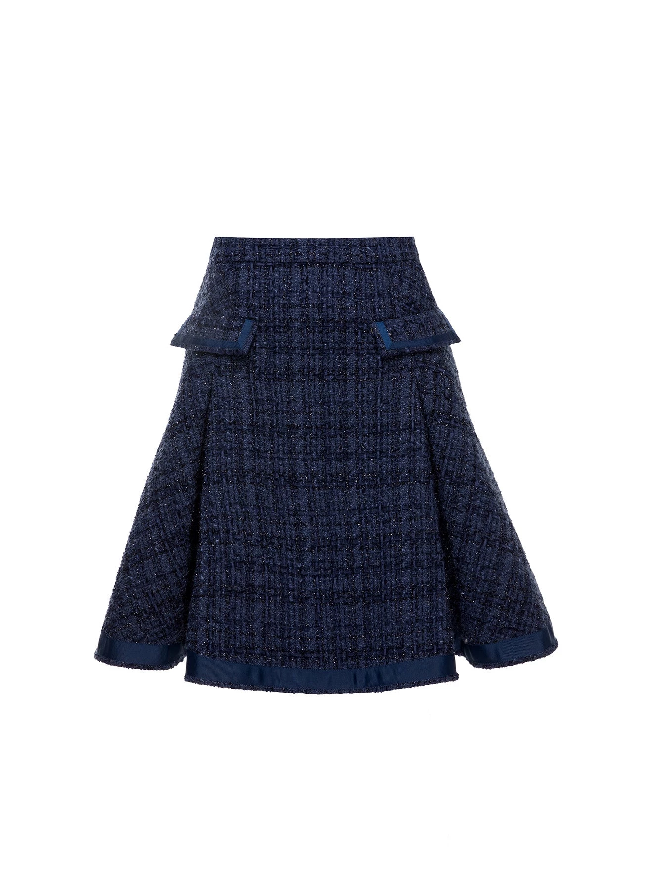 The Erica Skirt is an A-Line short skirt cut from the season’s soft, tactile tweed, woven with metallic threads. The Erica sits on the waist, has flap pockets, wide box pleats at the front and is trimmed with tonal grosgrain ribbon. Can be paired with the Milena Jacket.
