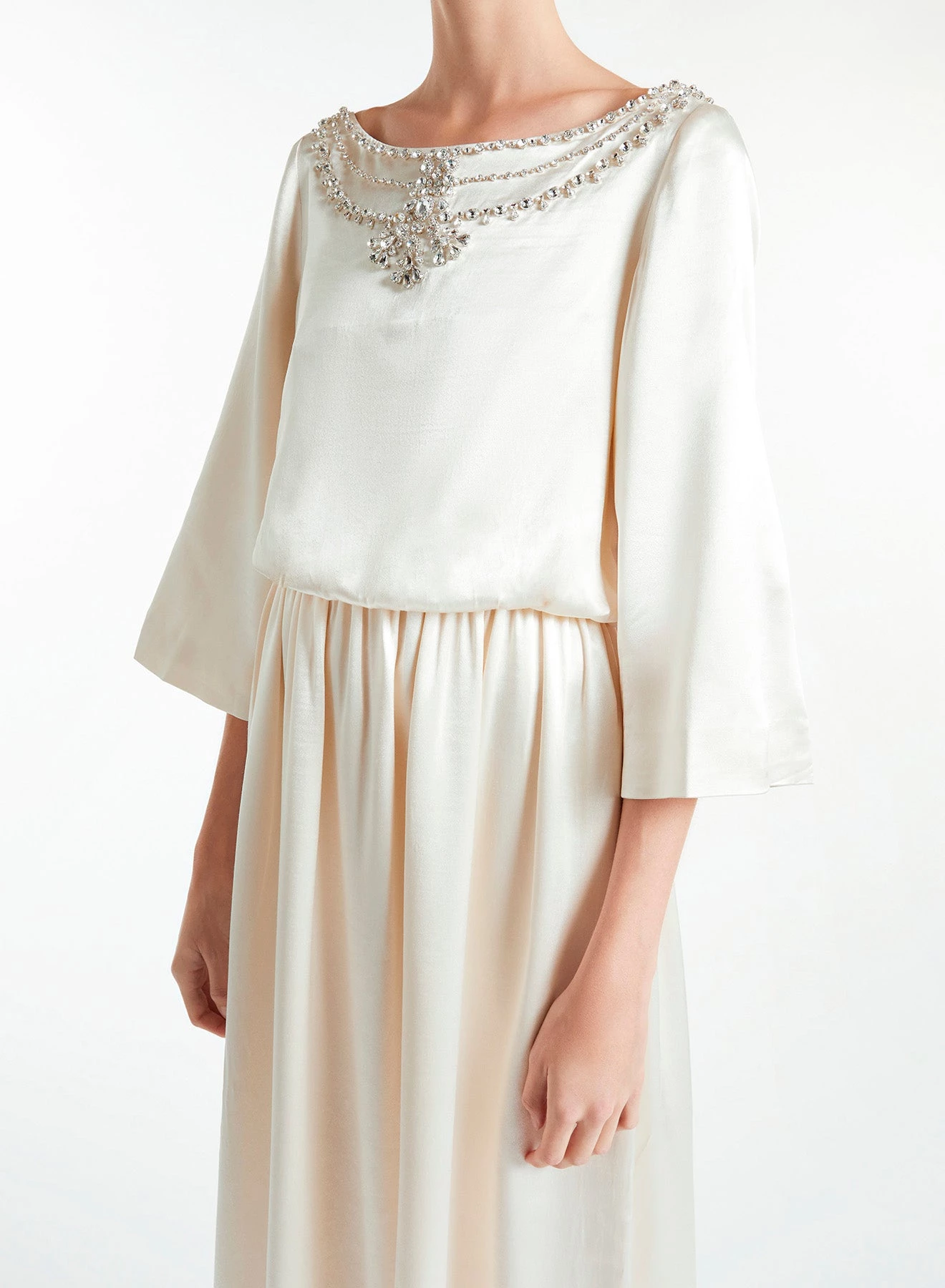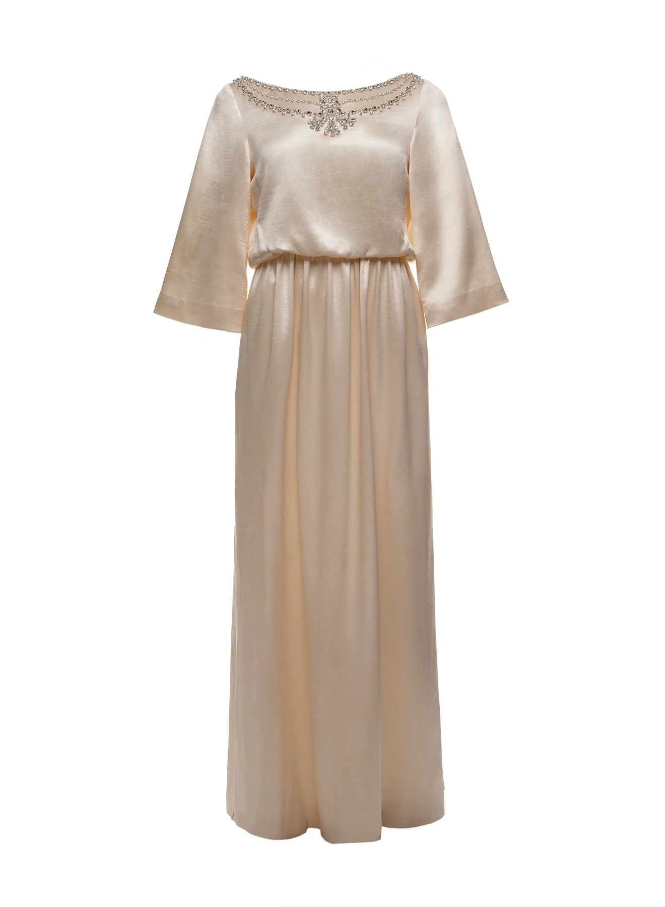 The Etta is a ¾ sleeved full length gown, made from lightweight ivory satin. It has boat neckline crystal embellishment, full skirt and gathered waist.
