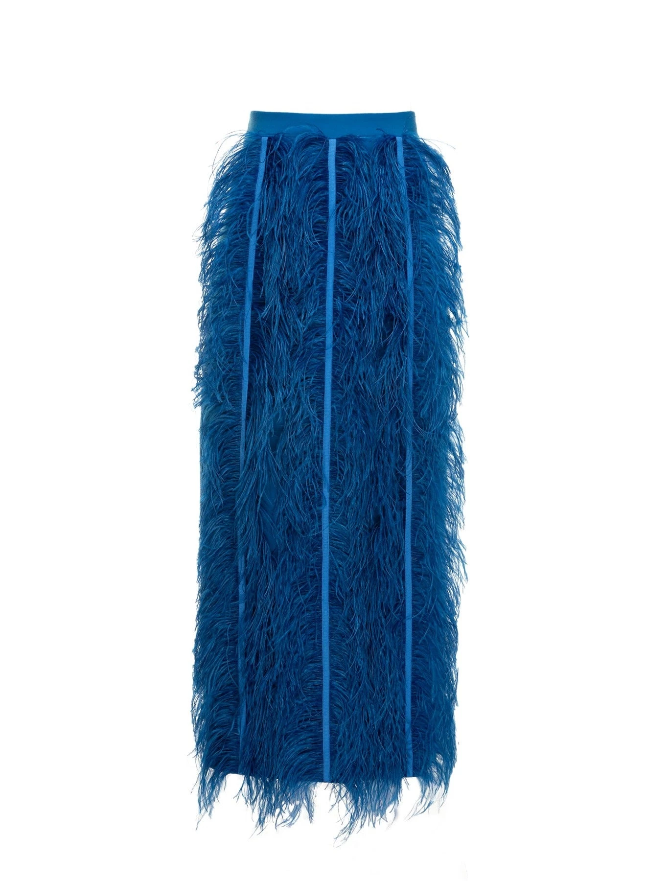 The Federica is an ankle length, straight leg, midi skirt, made from electric blue Italian Crepe Cady with ostrich feathers all over the front.