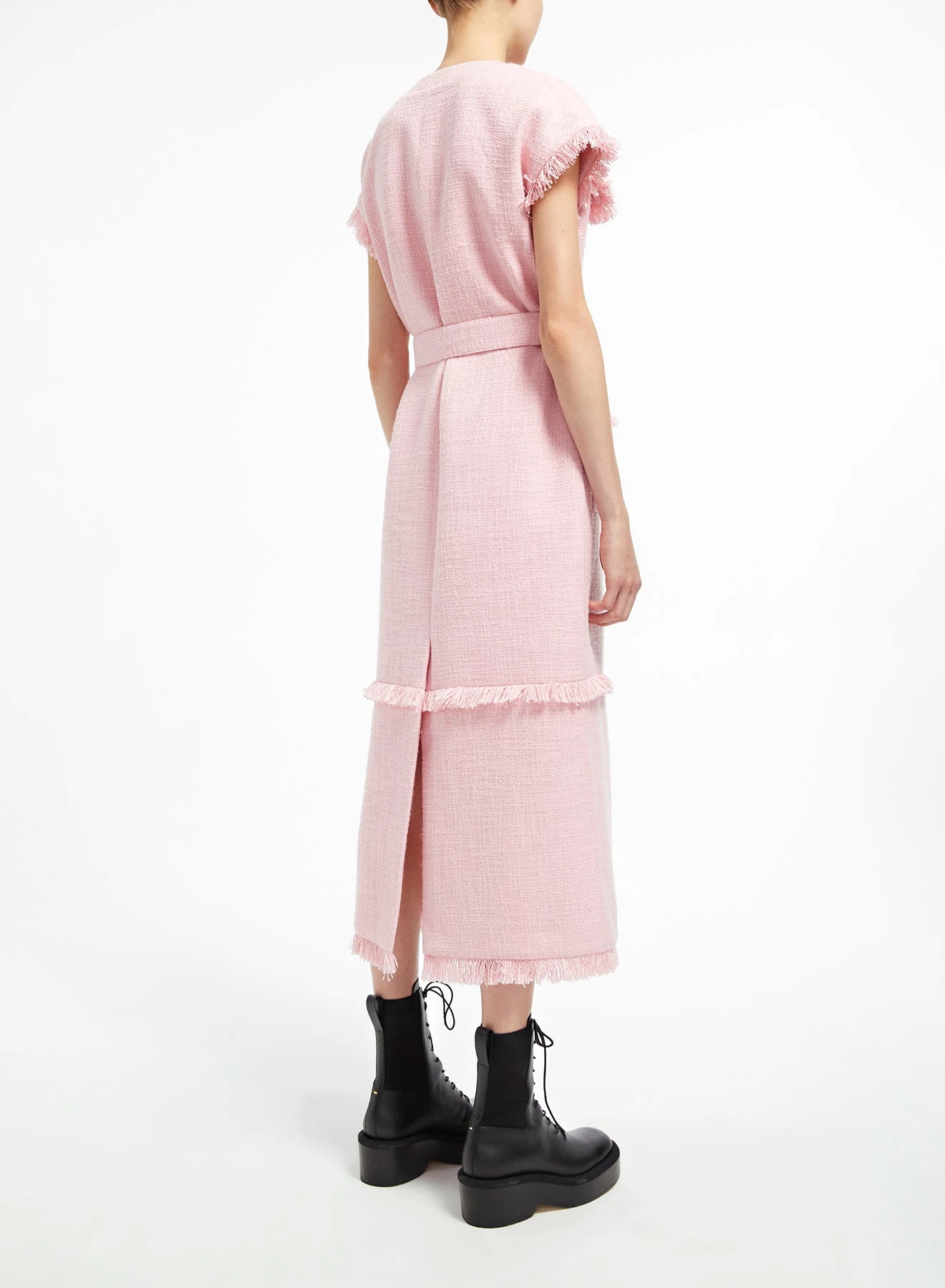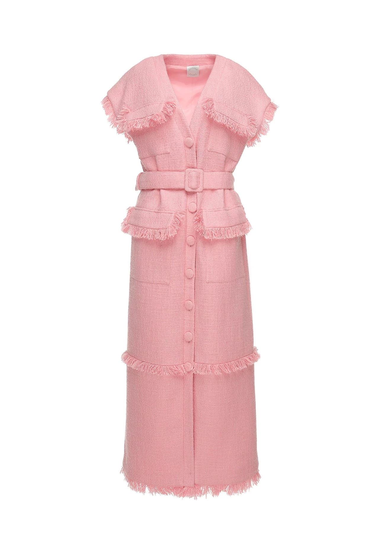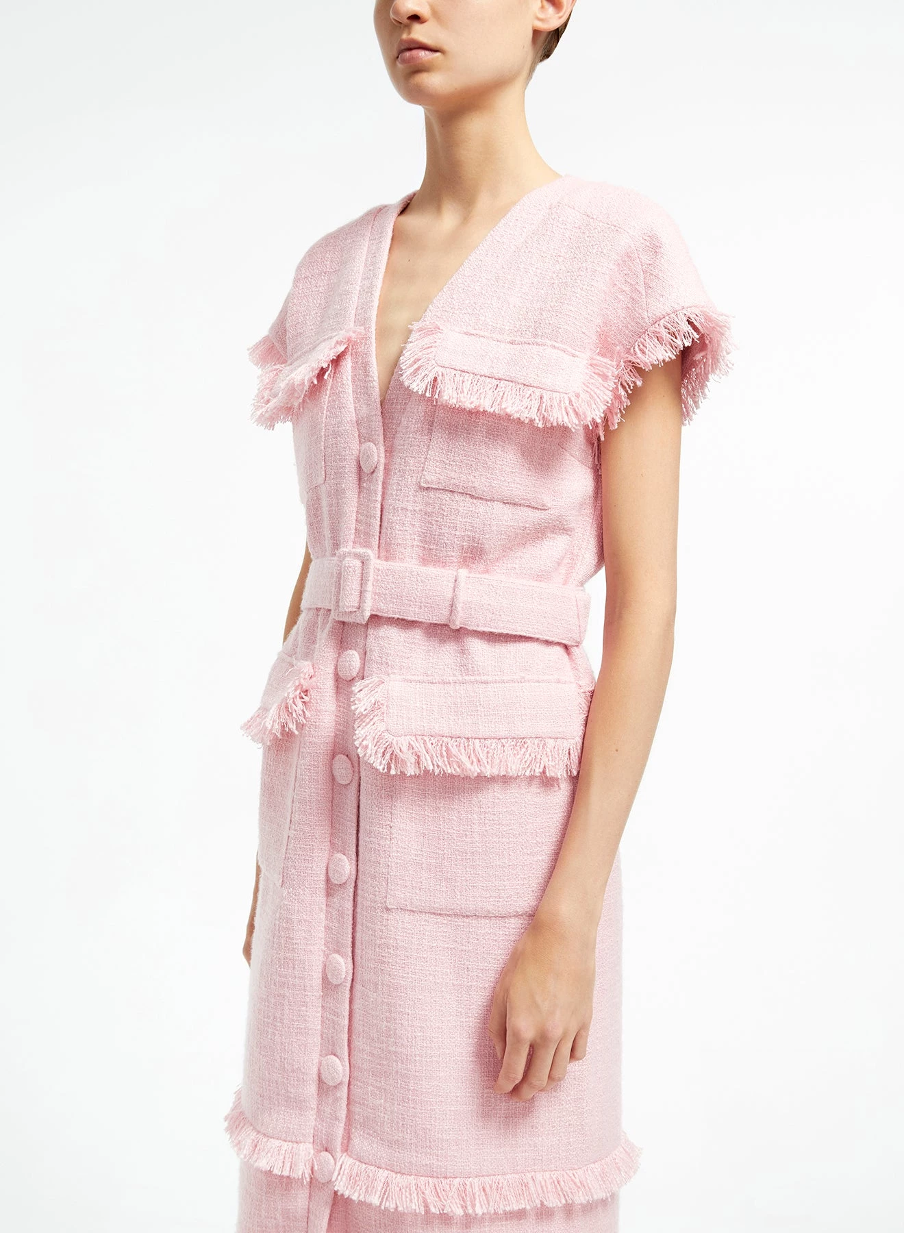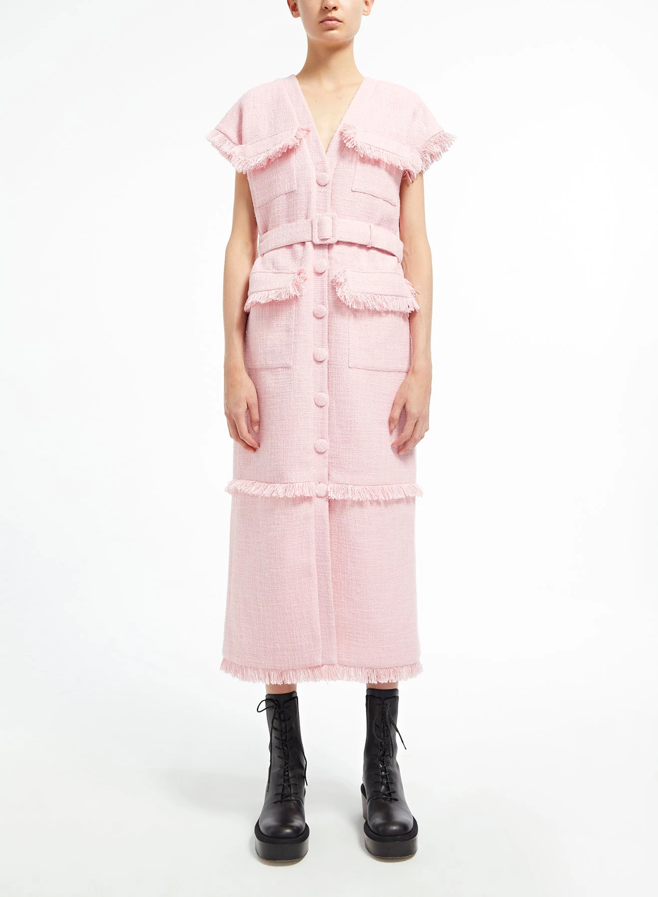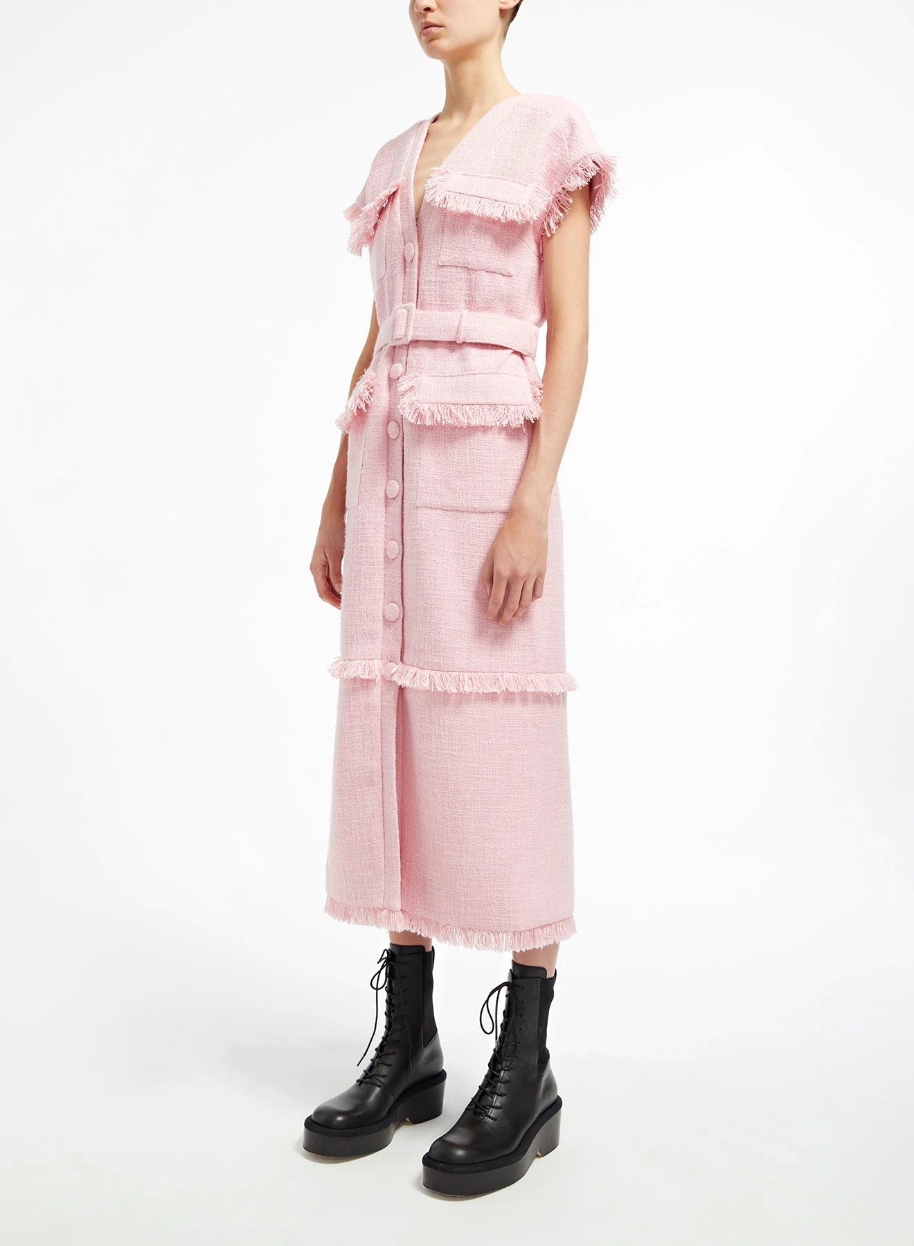 The Lea dress is a sleeveless gilet-dress, tailored from mid-weight, ballerina-pink tweed, embellished with self-fabric fringed hems. It has a V-Shape neckline, full skirt, large squared fringed pockets and a defining waist belt.