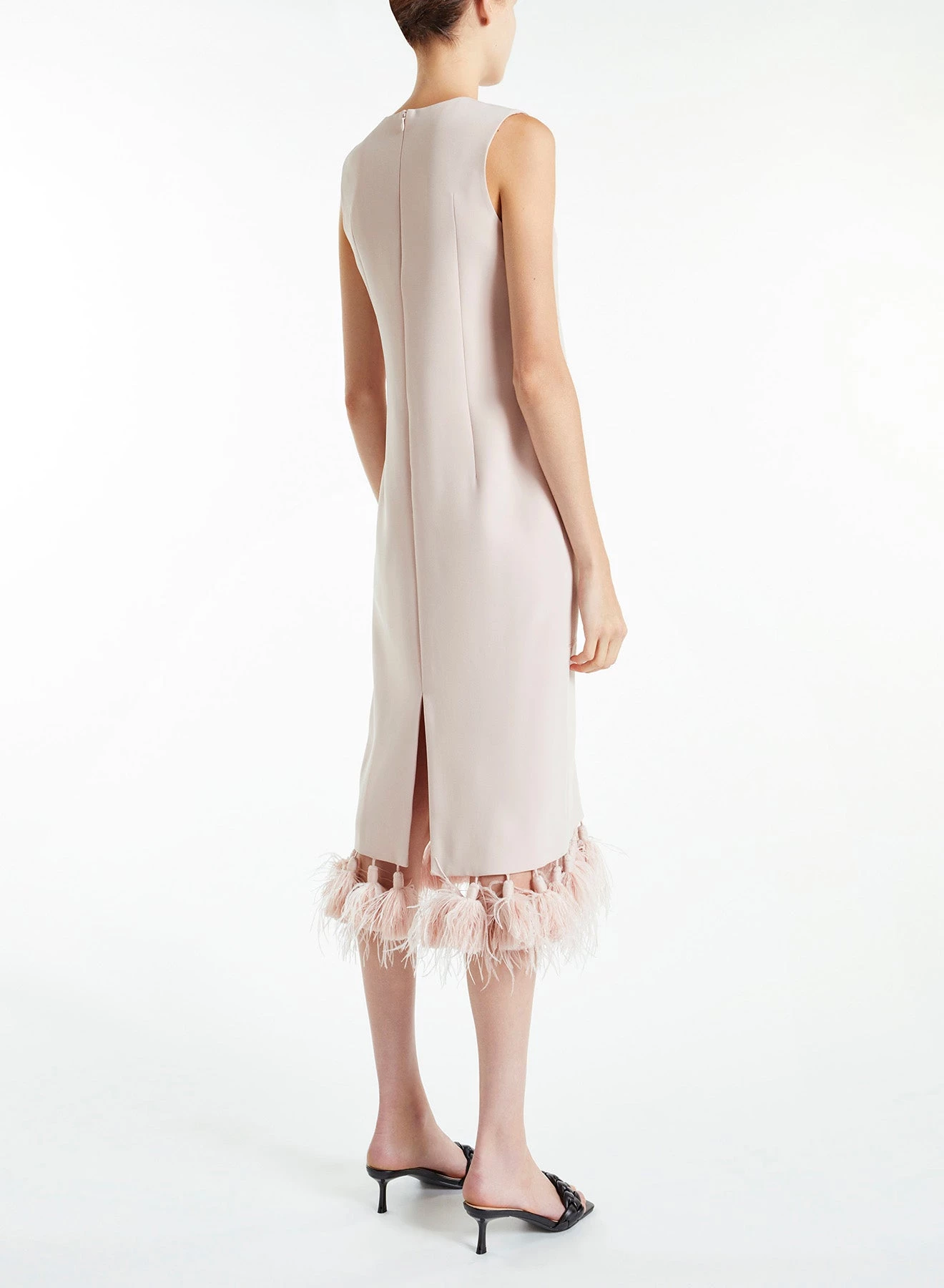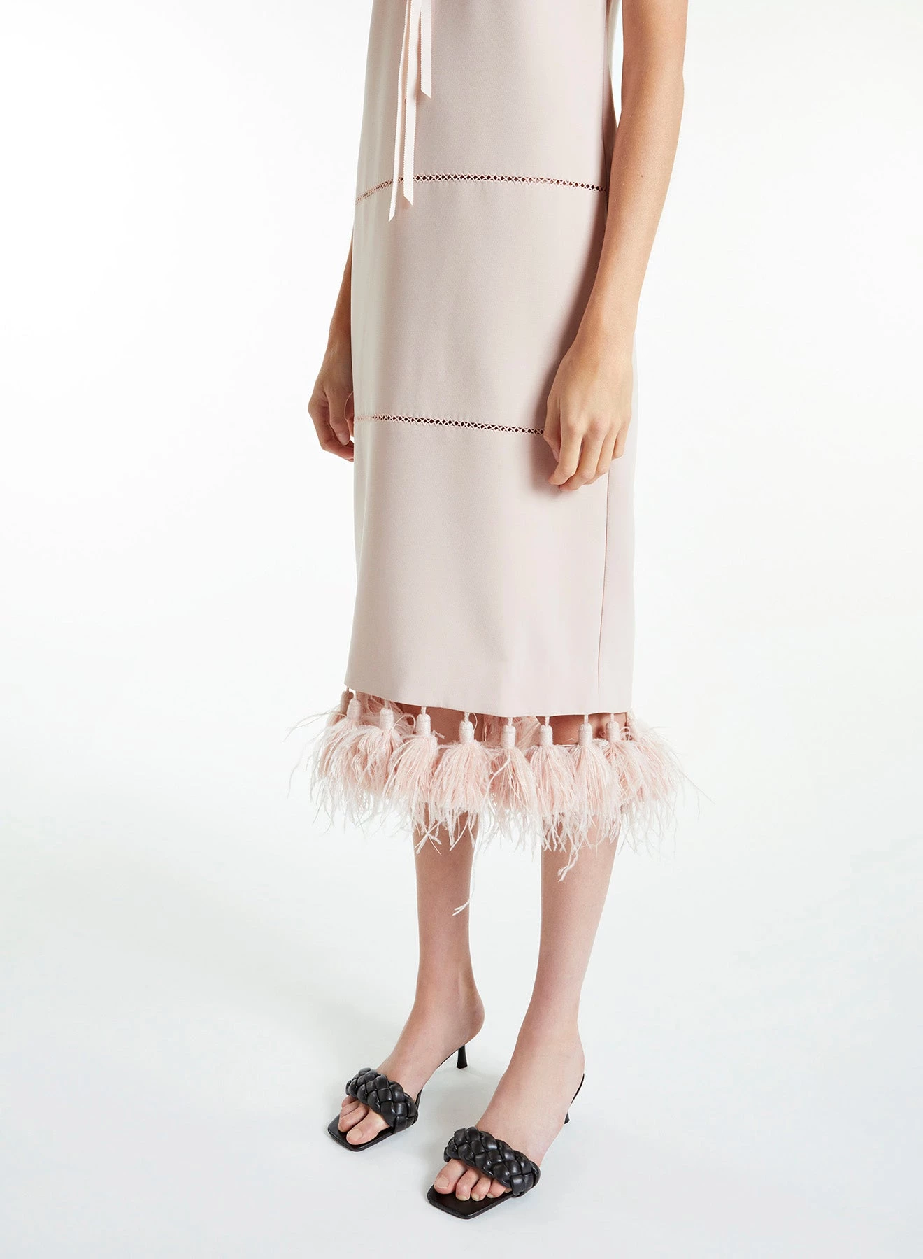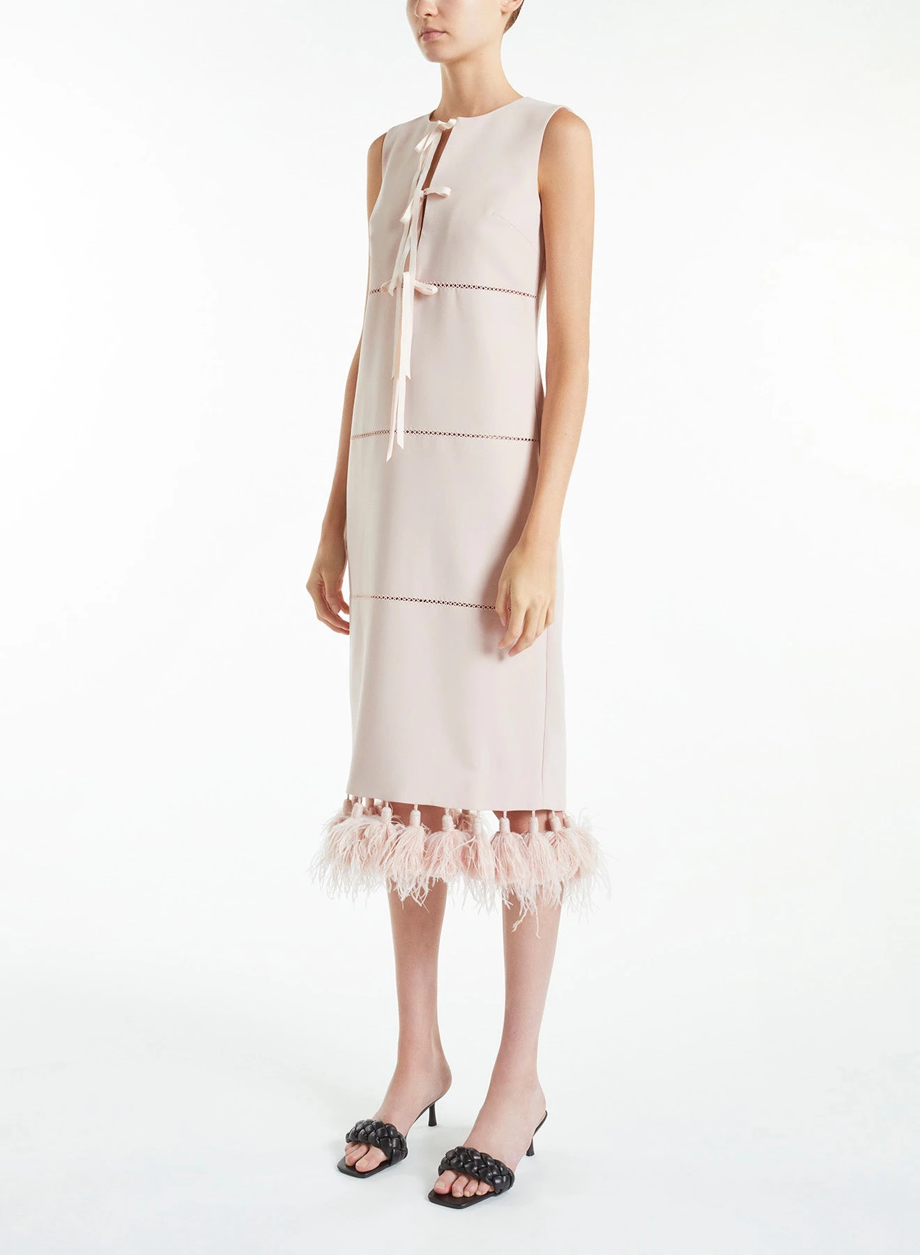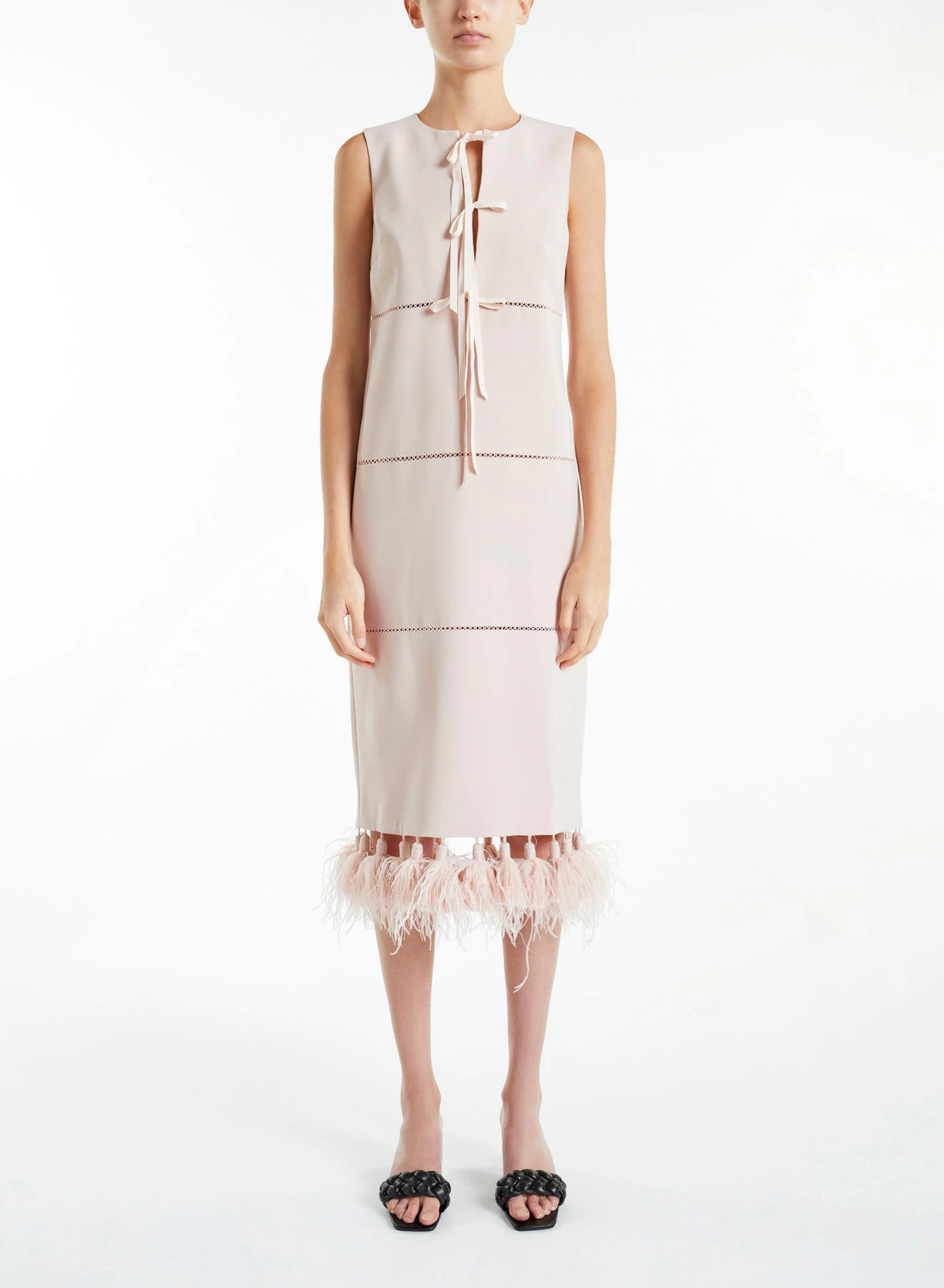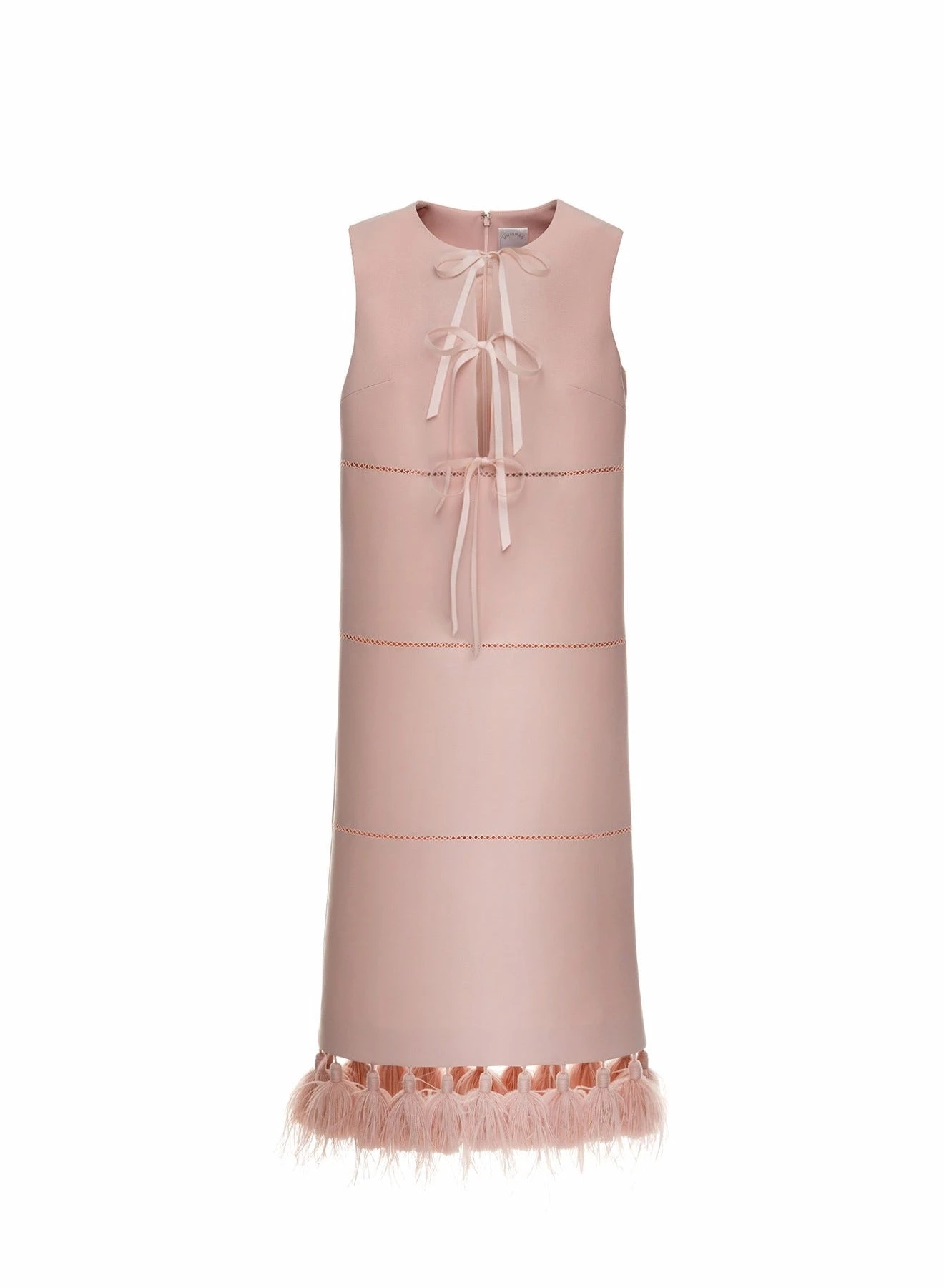 The Lilith is a sleeveless, straight, midi dress made from lightweight powder pink Italian Crepe Cady. It has round neckline, tie details atΒ the front and feathered tassels hems.