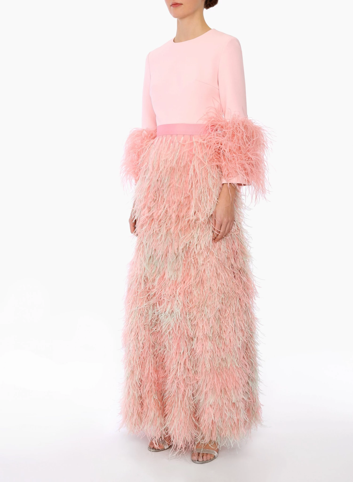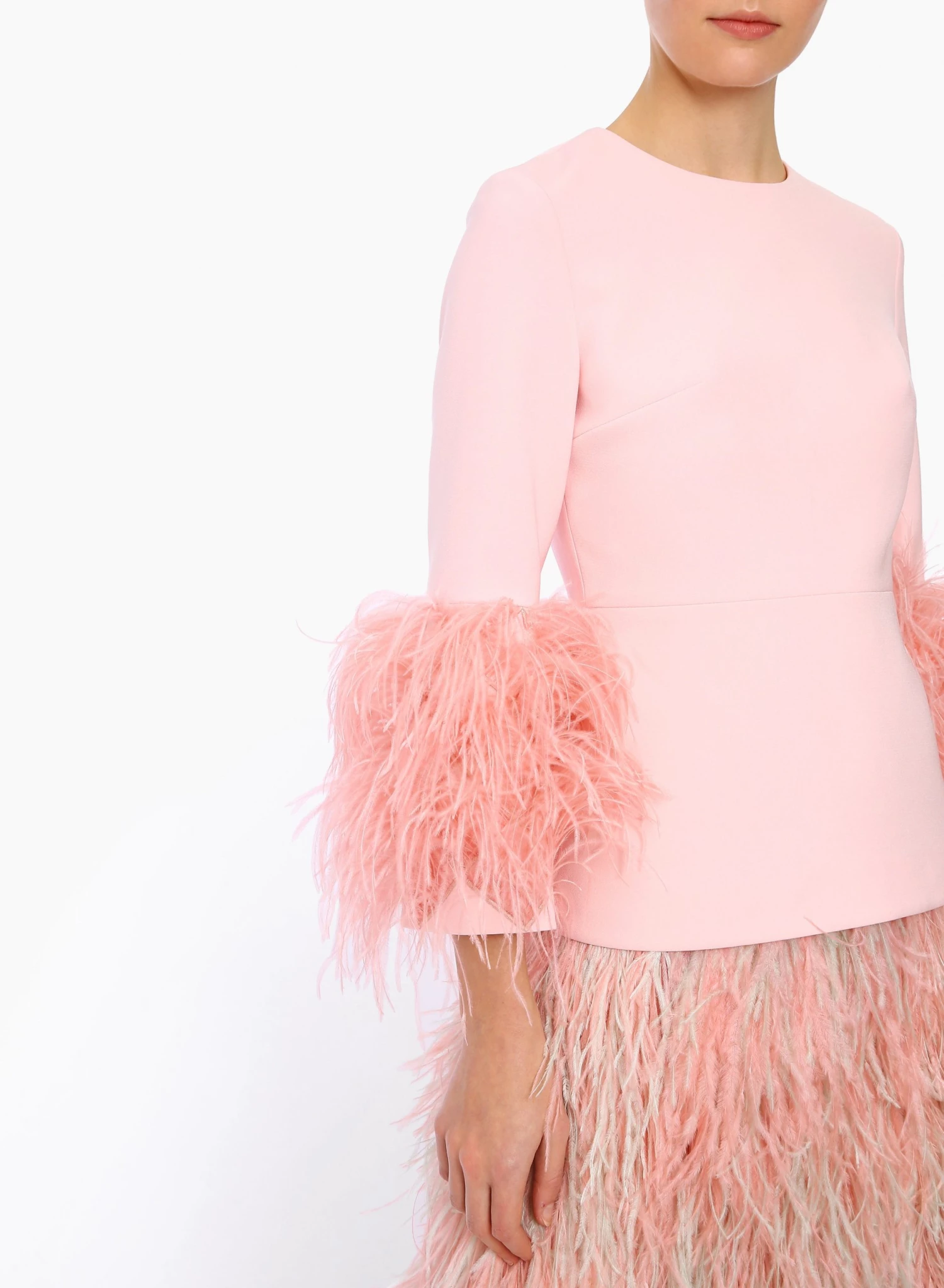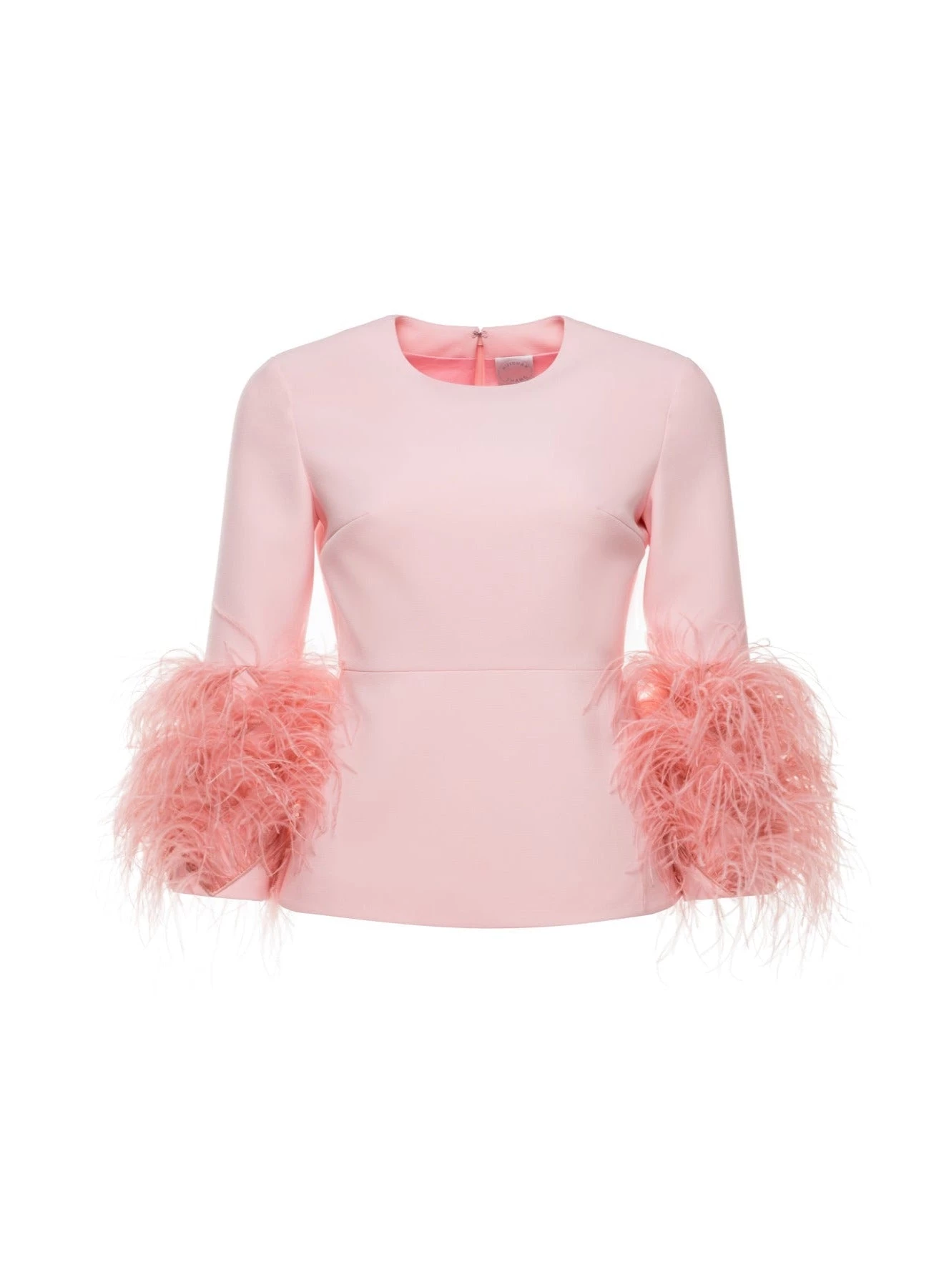 The Lola is a slim-fitting pastel pink top with a waist seam and trumpet sleeves adorned with tonal ostrich feathers.