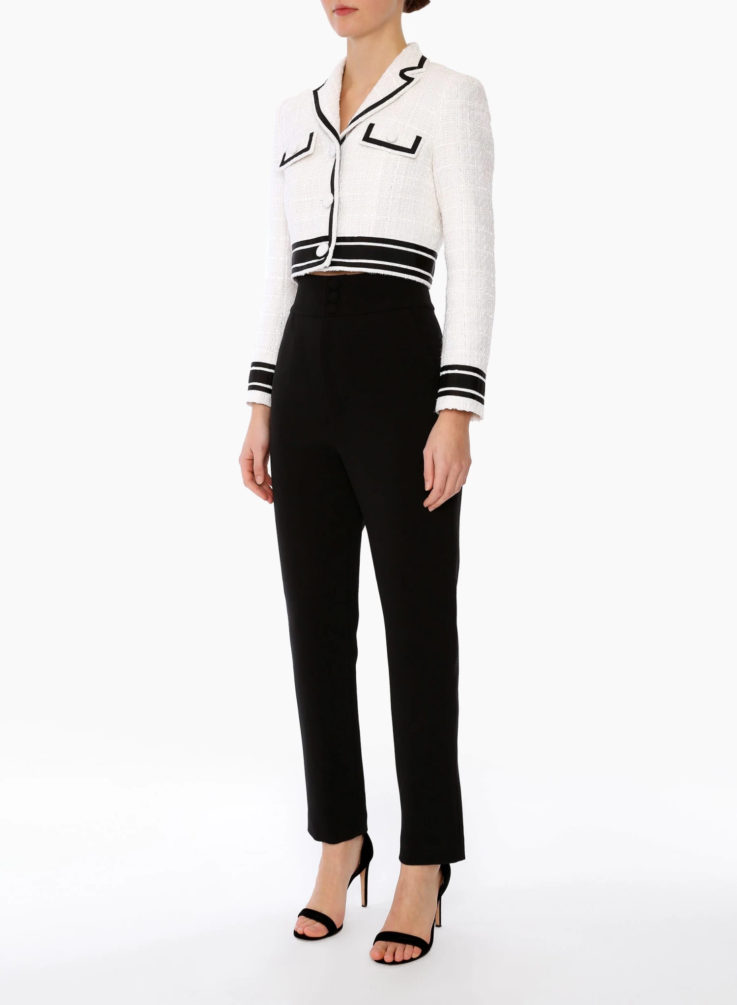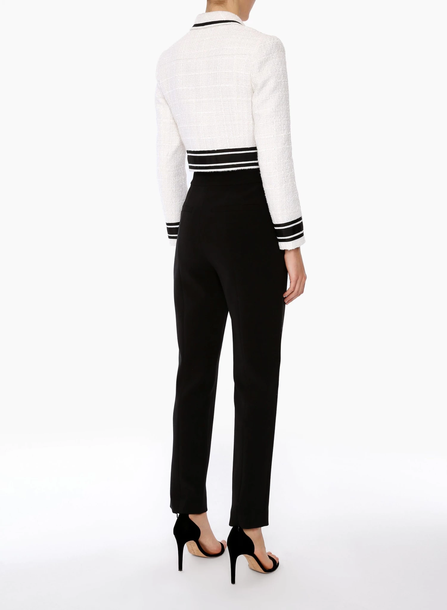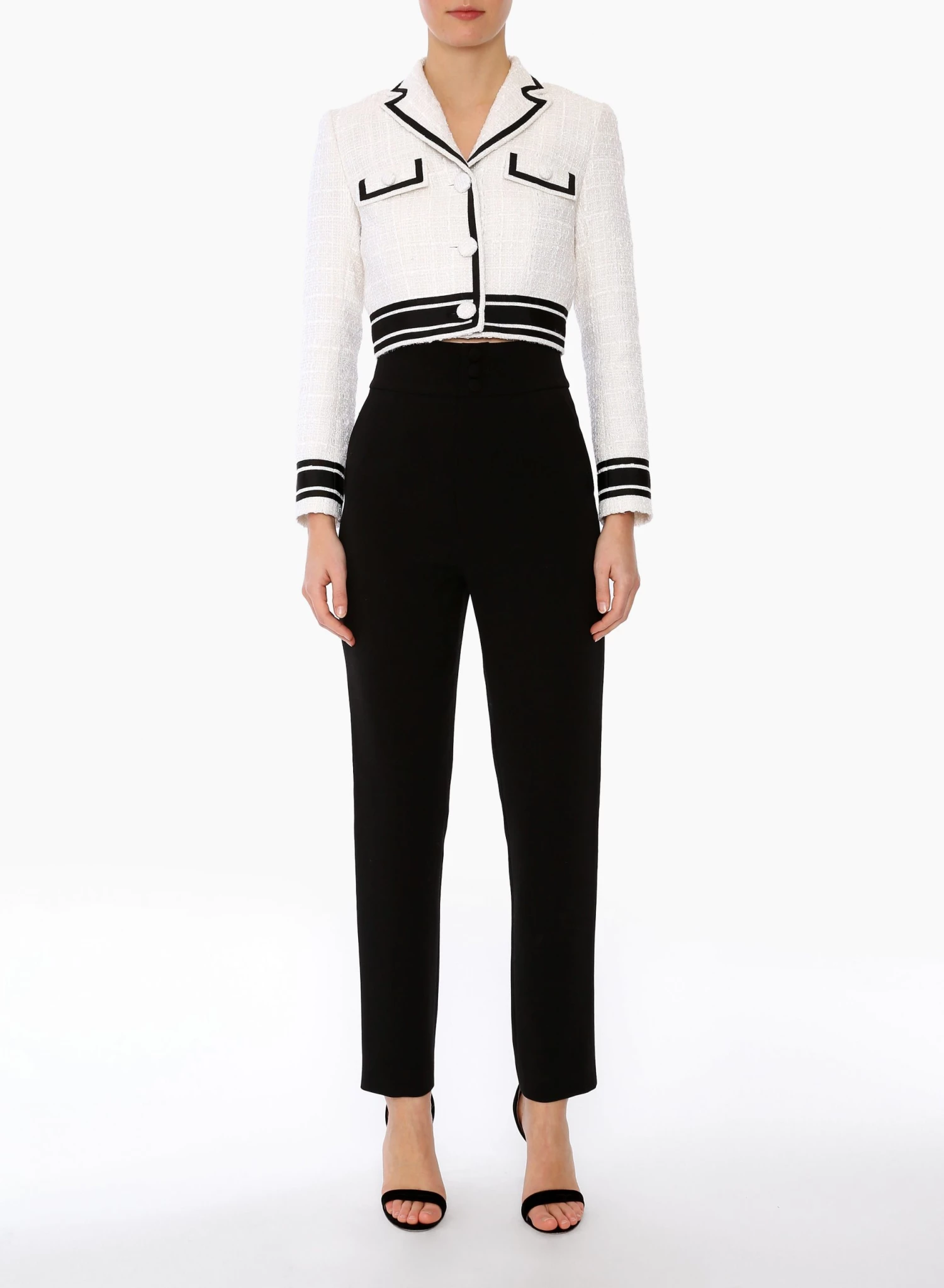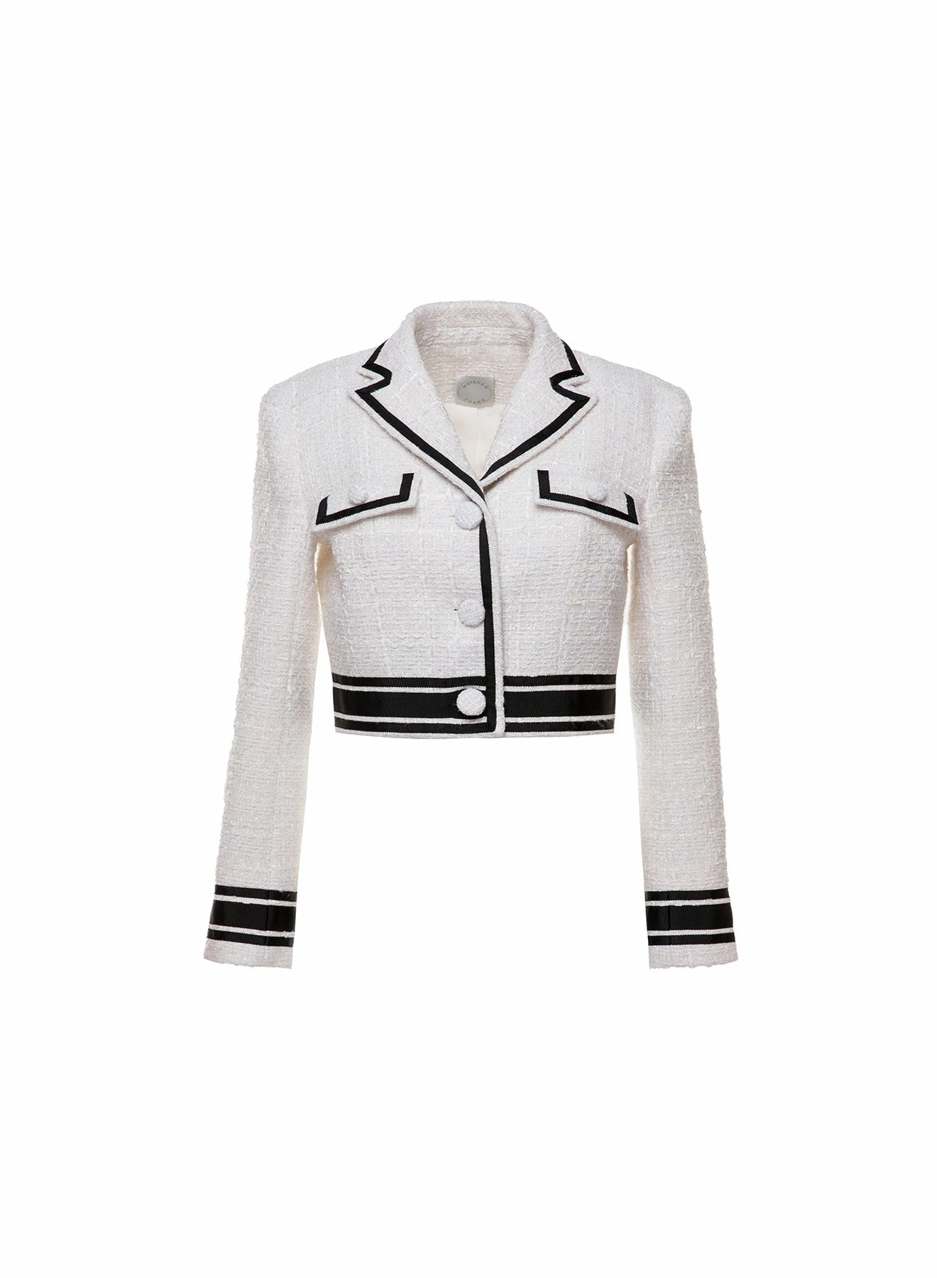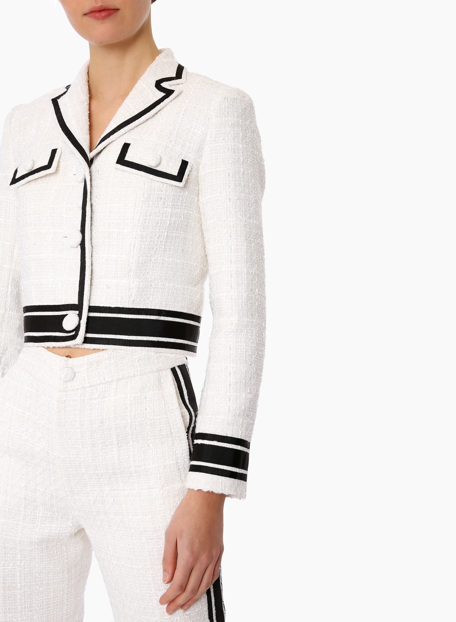 The Malka Jacket is a retro-inspired crop blazer made from tactile white tweed, woven with metallic threads and trimmed with contrast black grosgrain ribbon.
