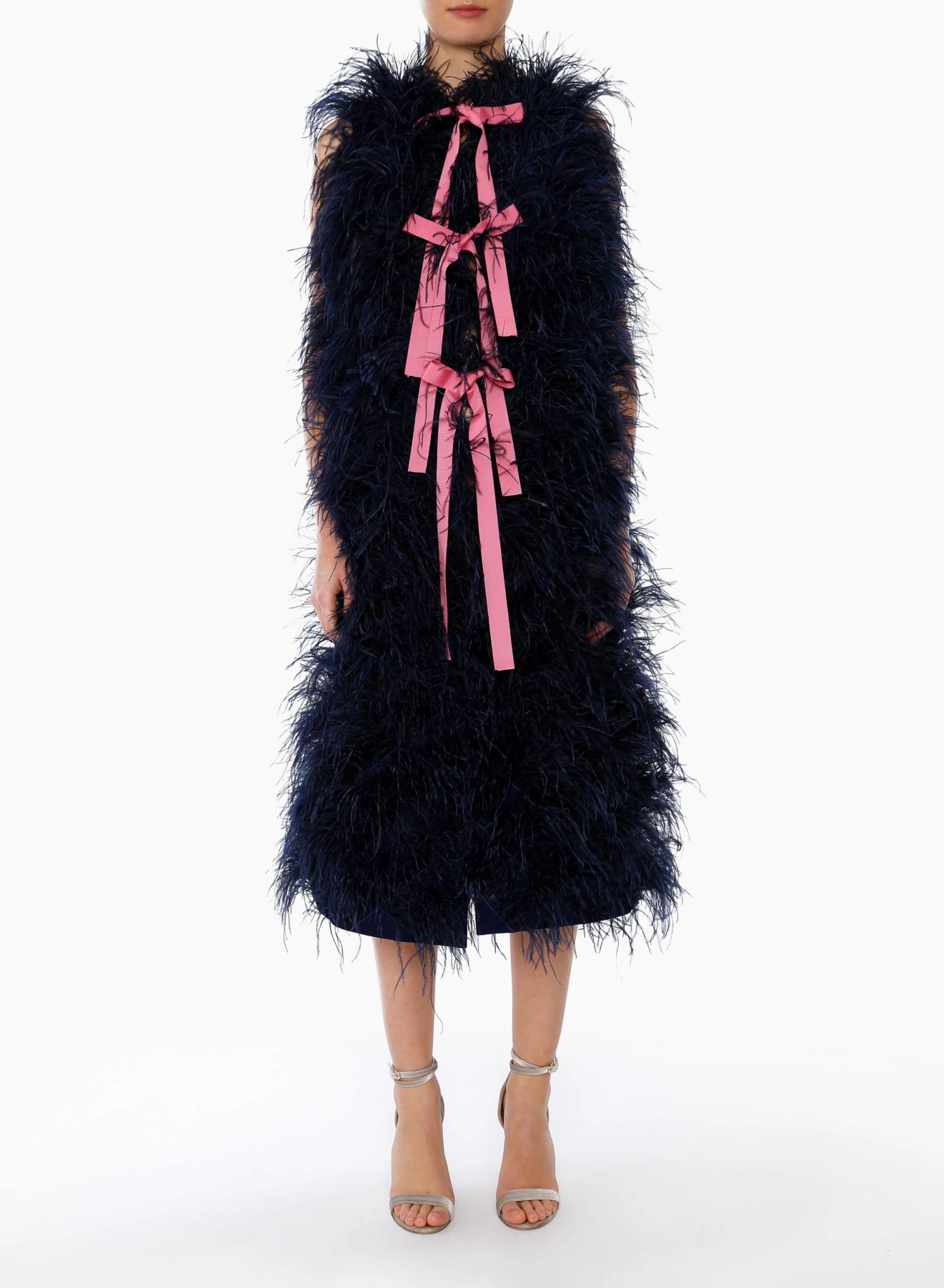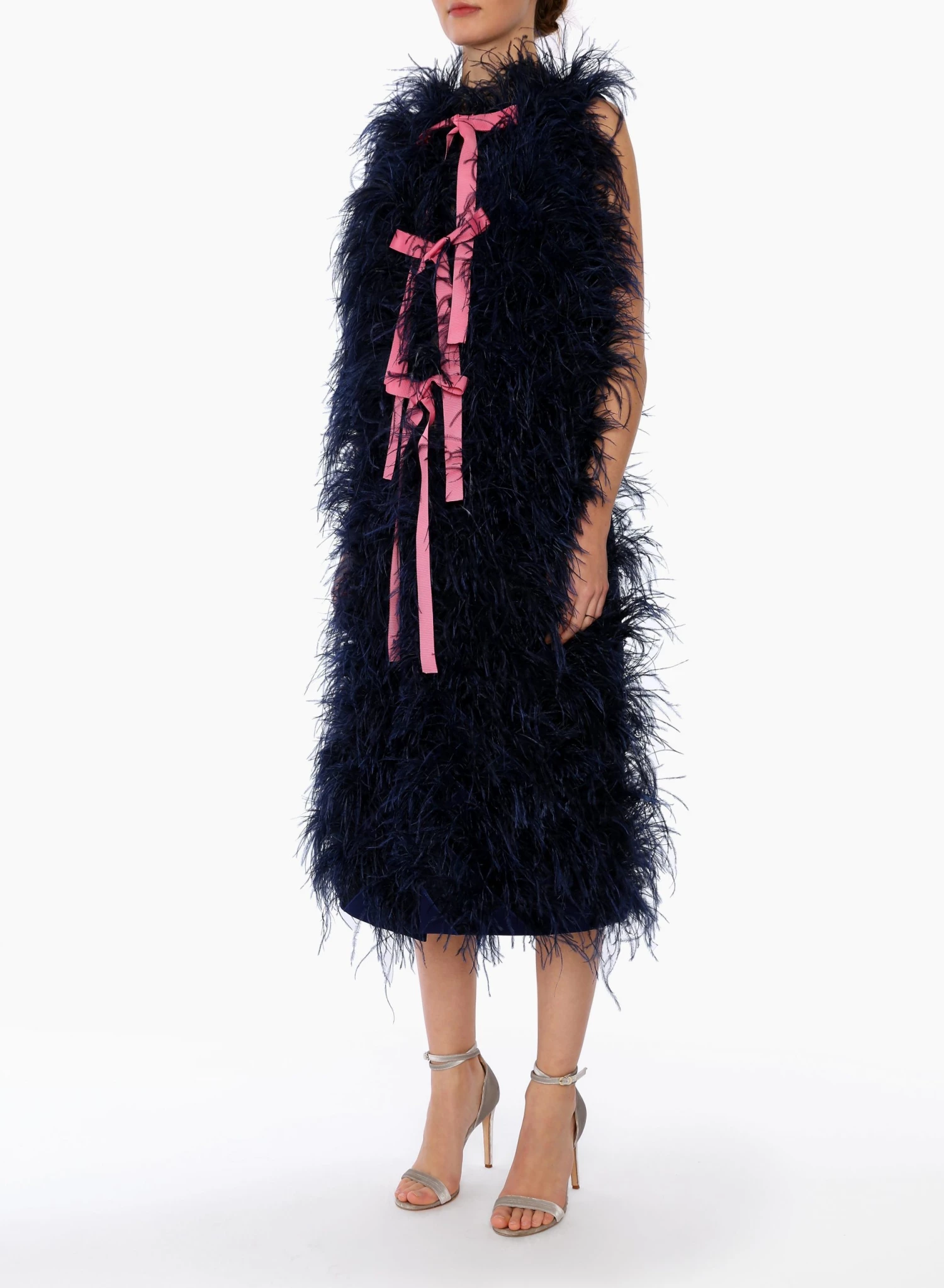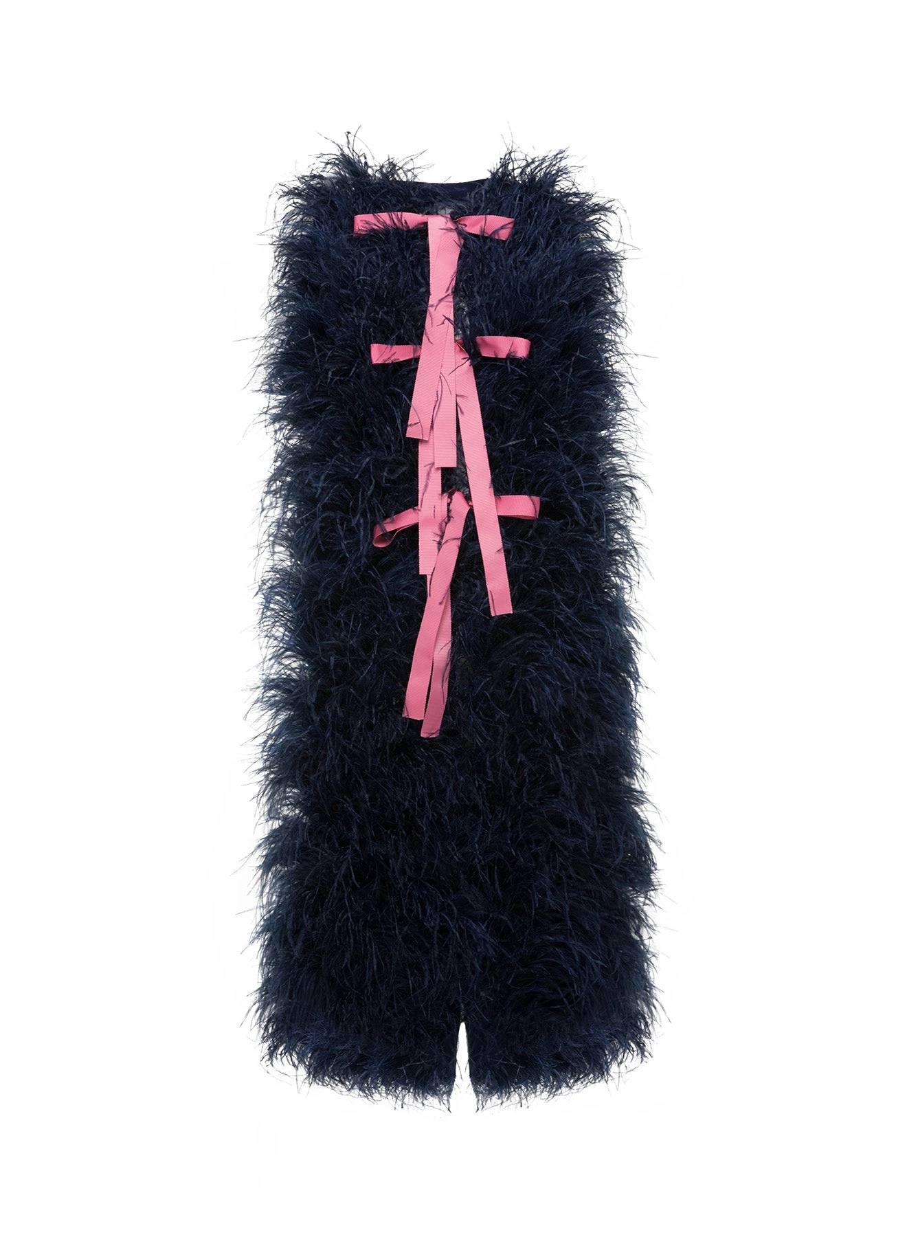 The Asti gilet is a feather embellished crepe gilet in a seasonal colour update, featuring three contrast pink grosgrain ribbon ties. The front is fully embellished with tonal ostrich feathers.