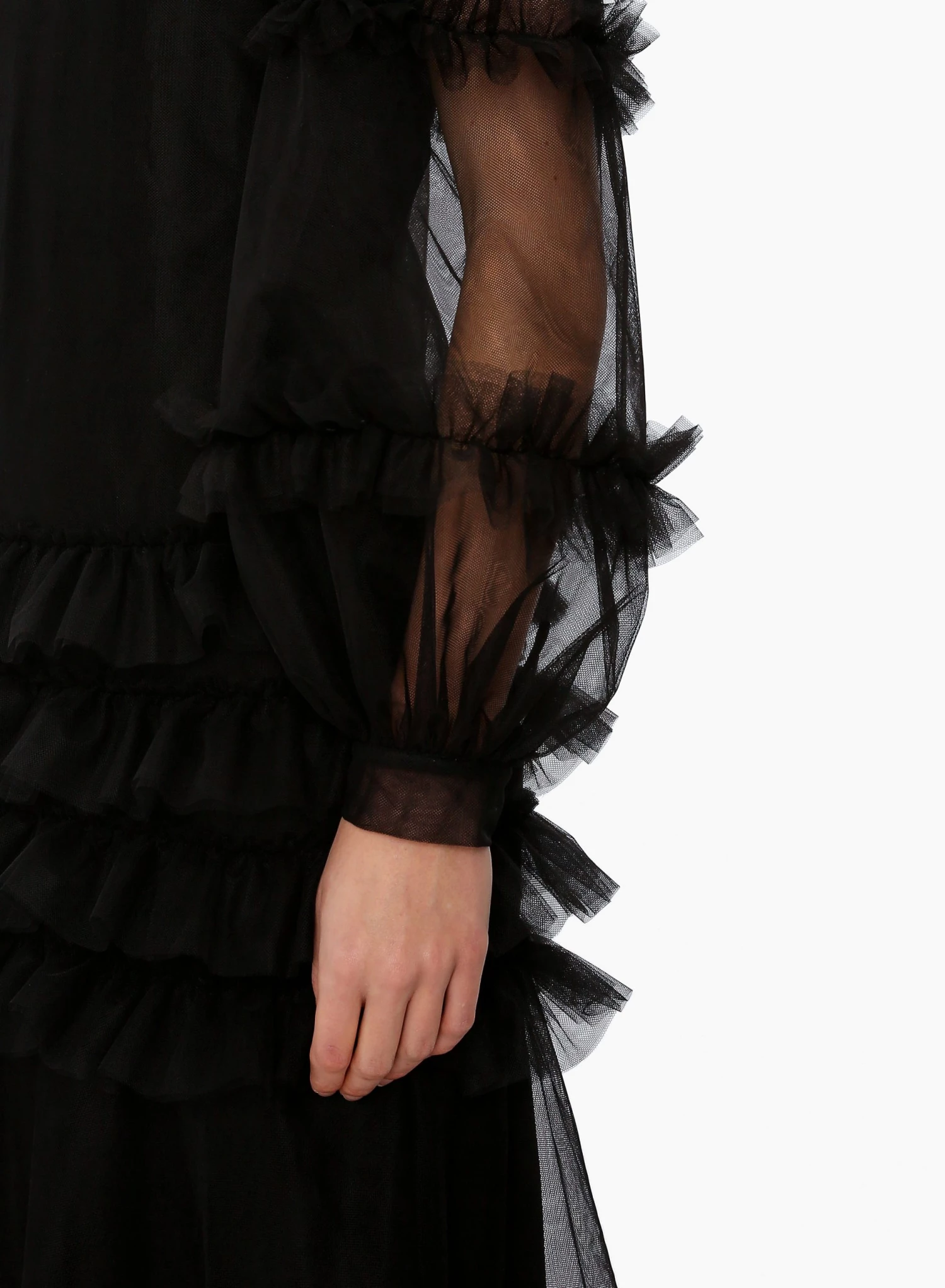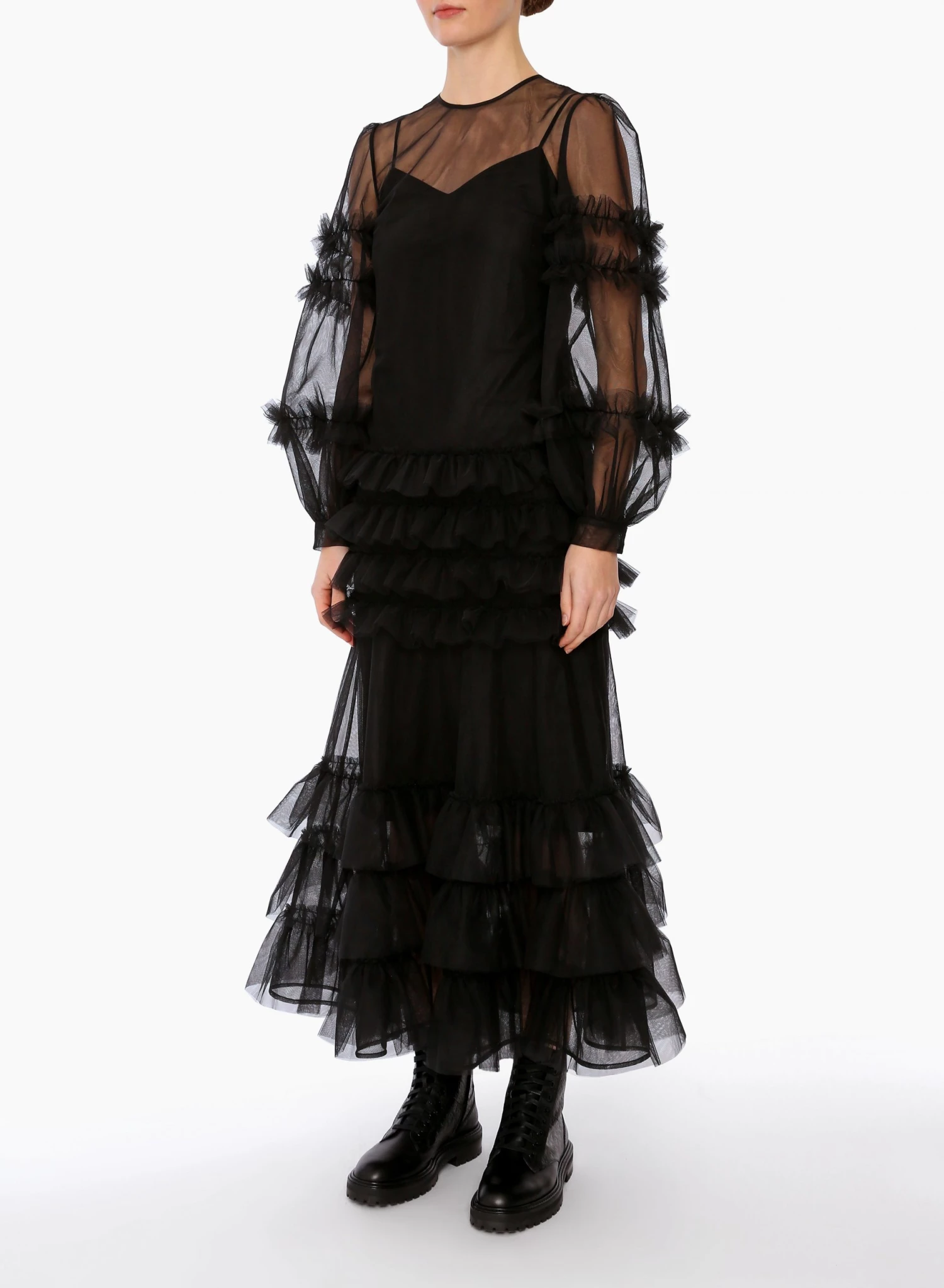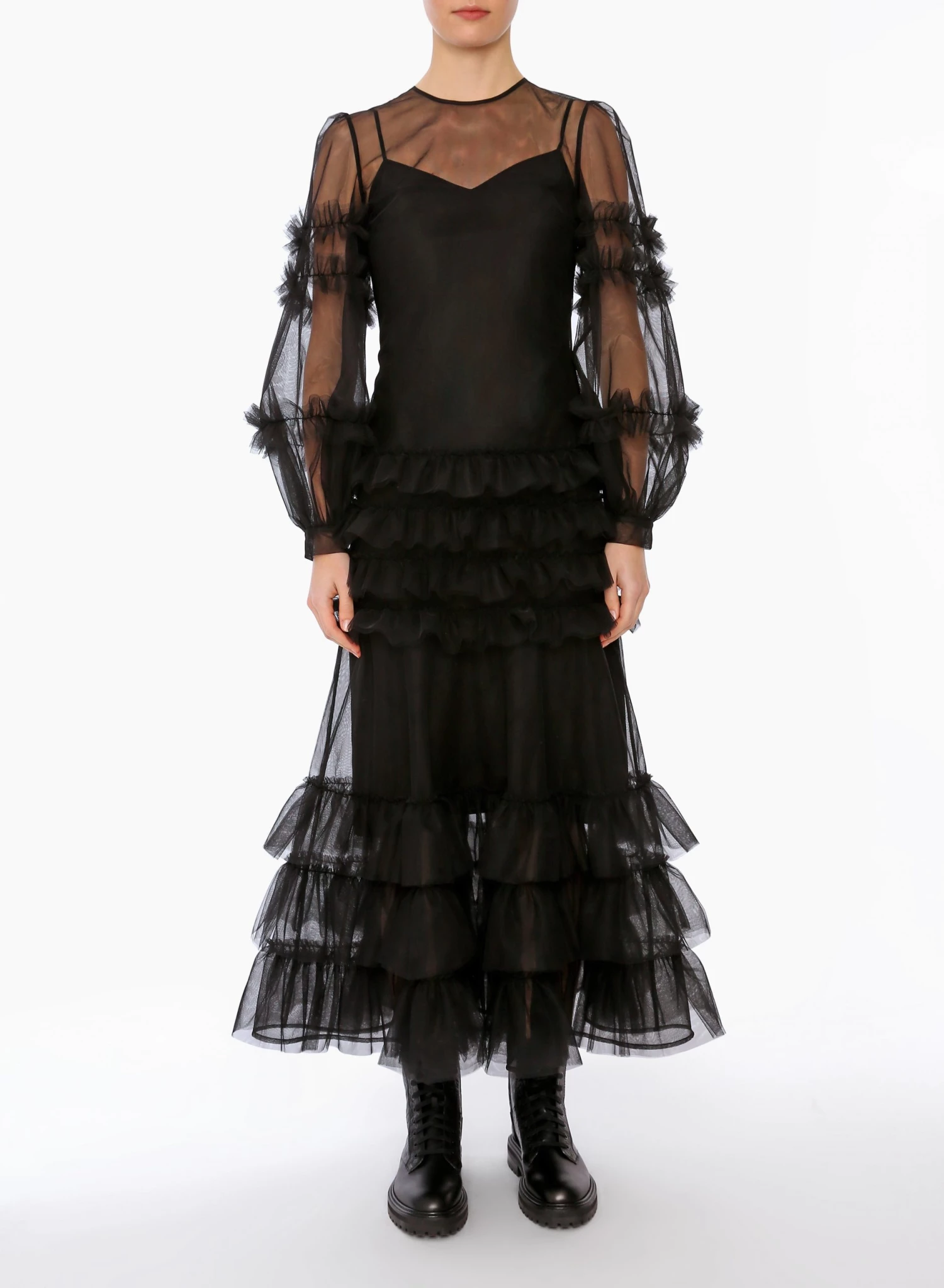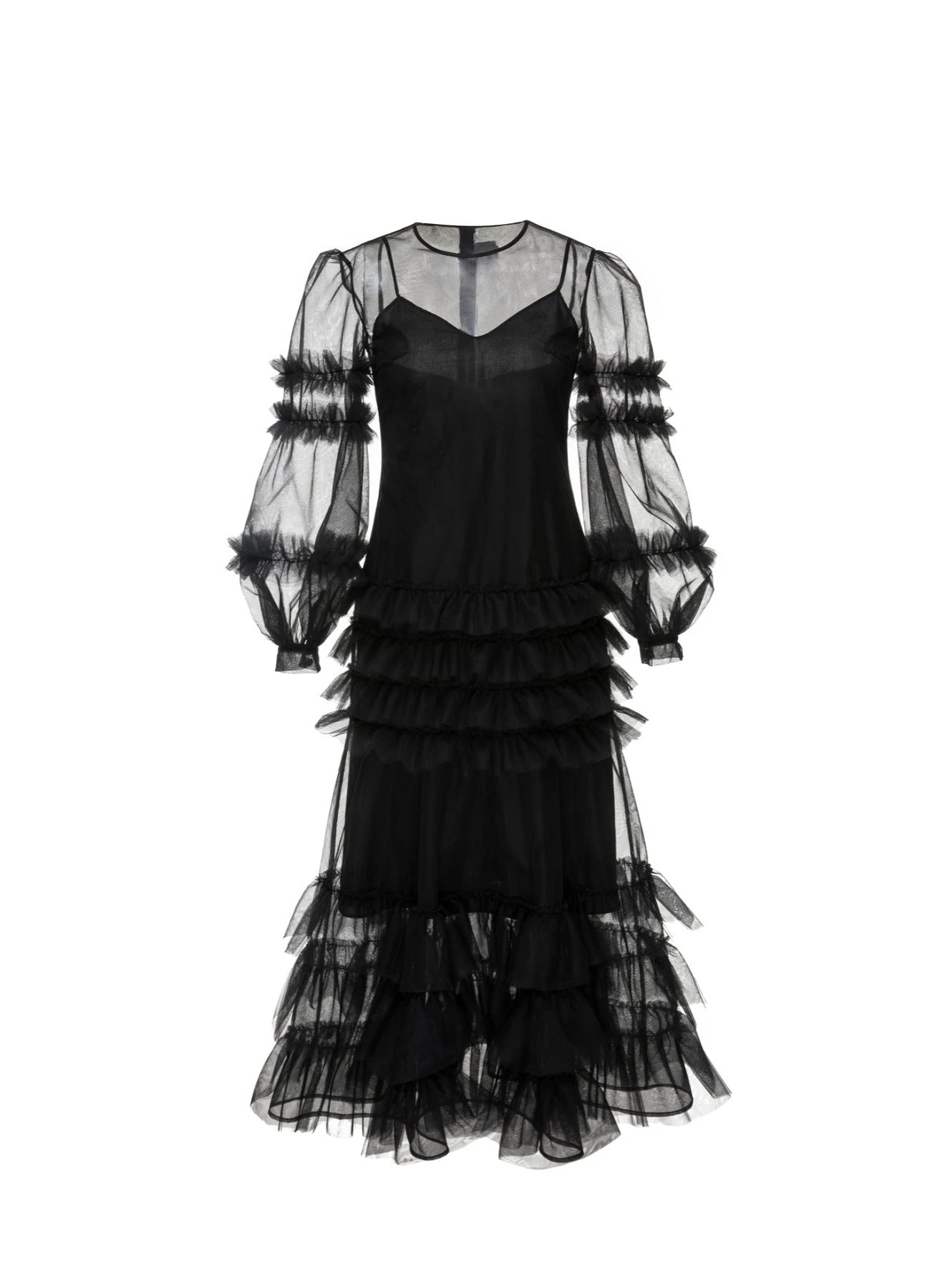 The Maizie Dress is an ankle length dress made from Huishan Zhang’s signature tulle. It has ruffles tracing the sleeves and skirt and is underpinned with a tonal silk slip for opacity.