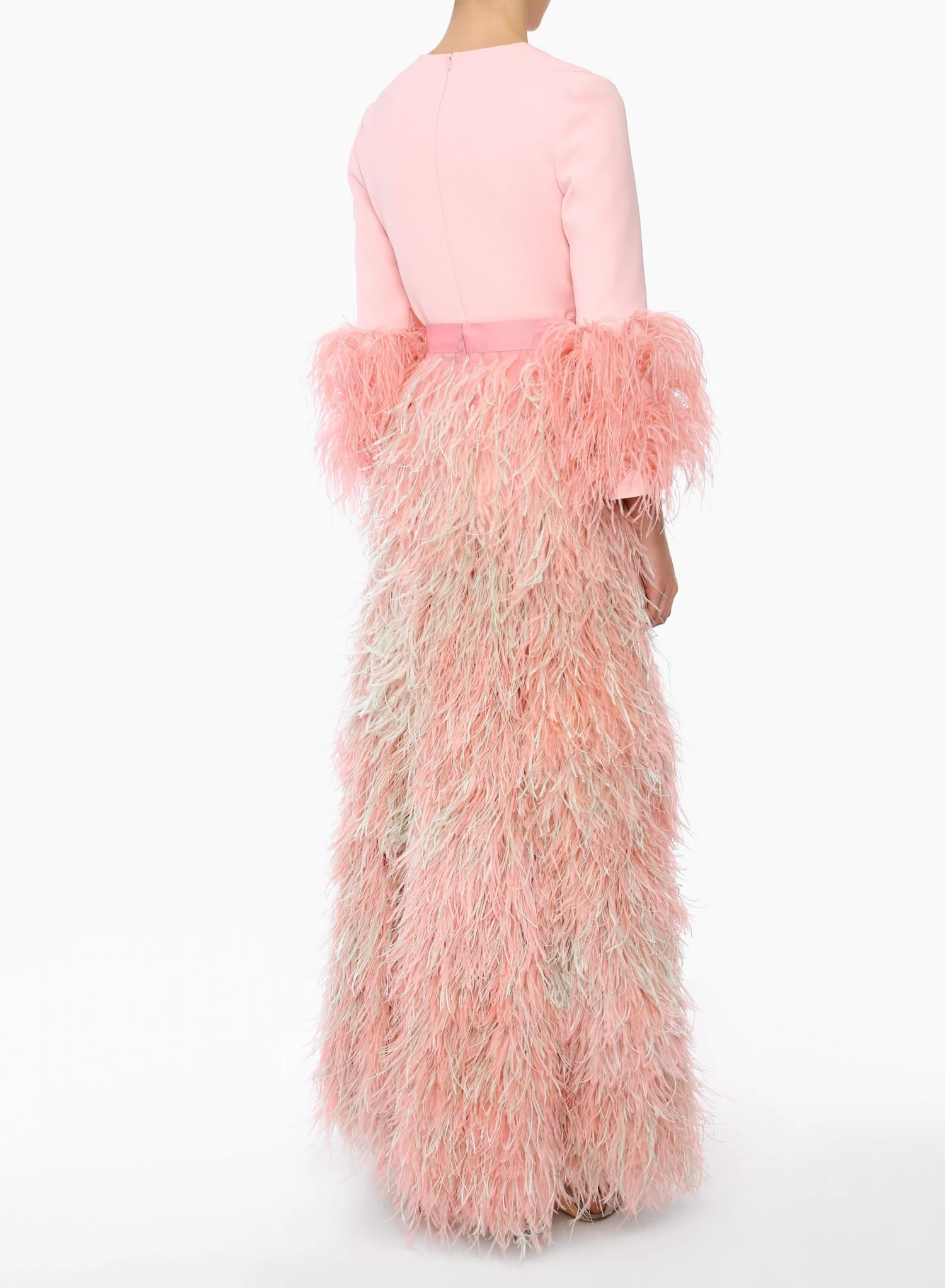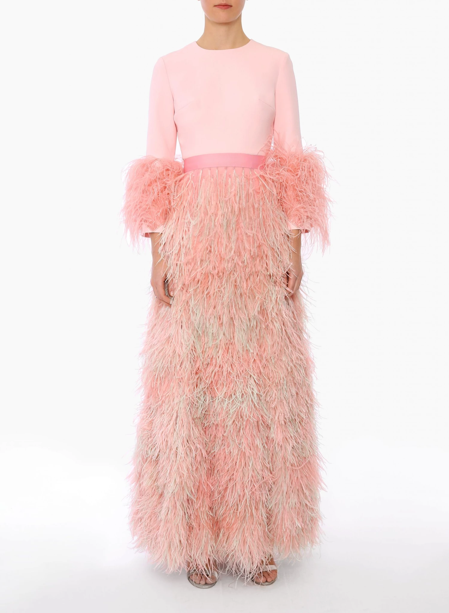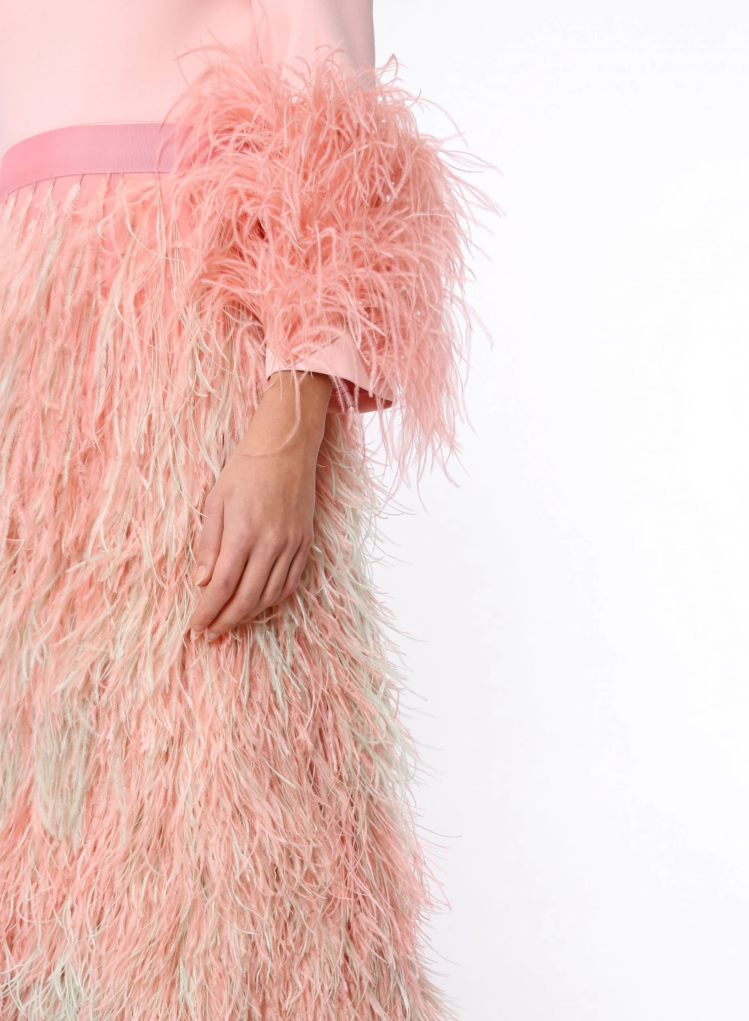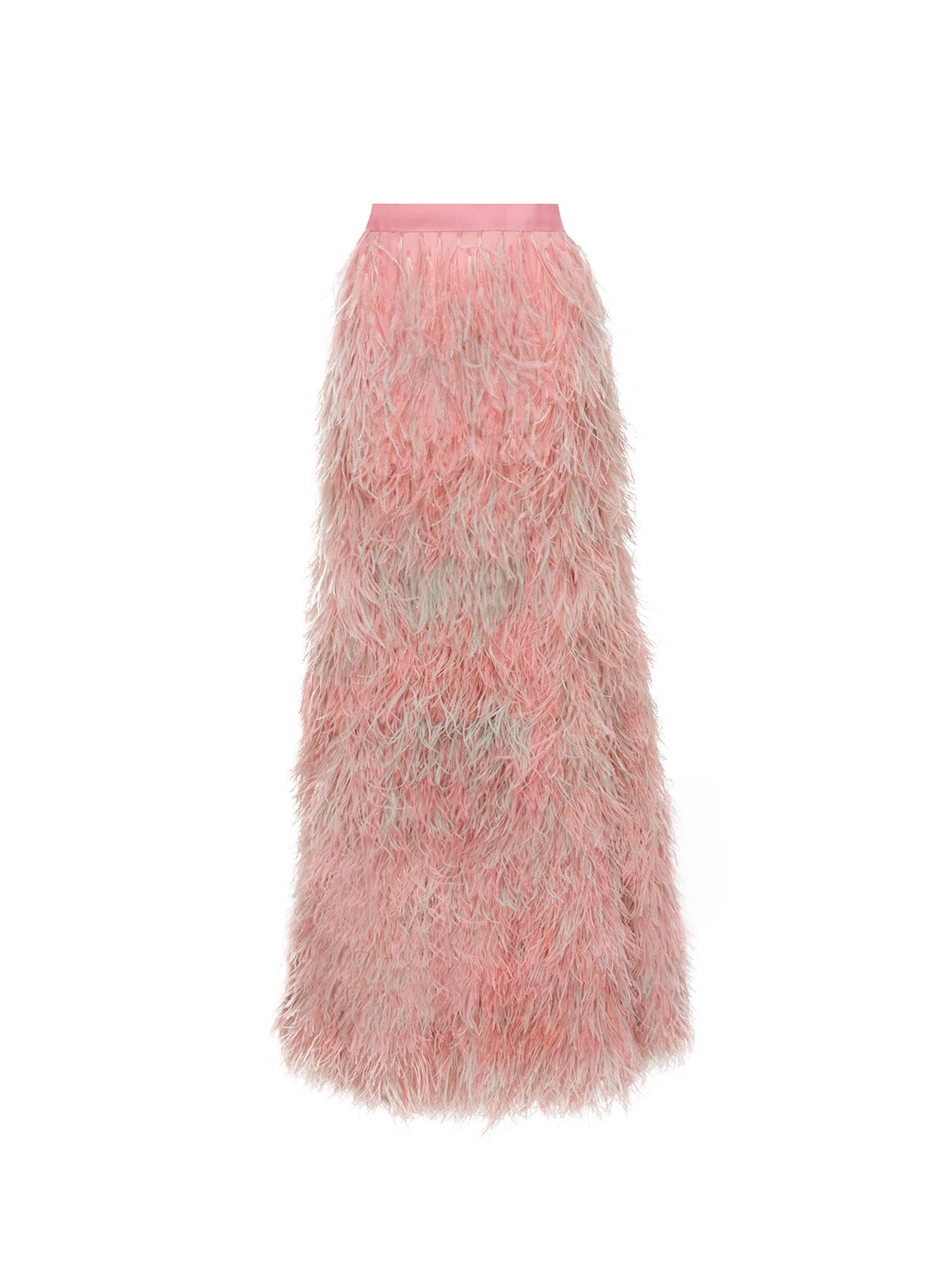 The Bianca is a long ballgown pastel pink skirt in crepe with a dense tonal and pale green ostrich feather embroidery.