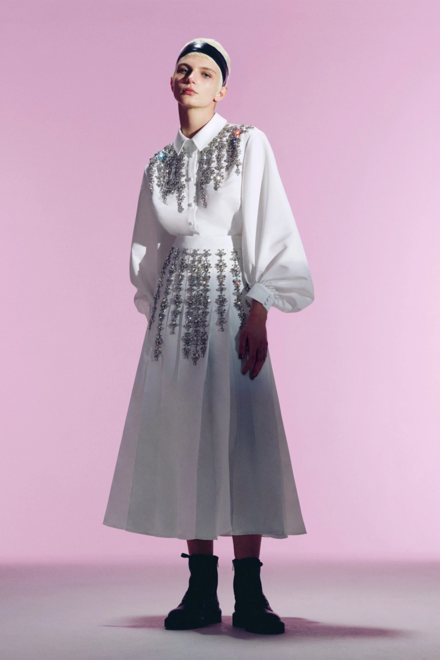The Opal Skirt is cut from structured faille in a midi-length, pleated silhouette. The hip line is embellished with crystals throughout the front.