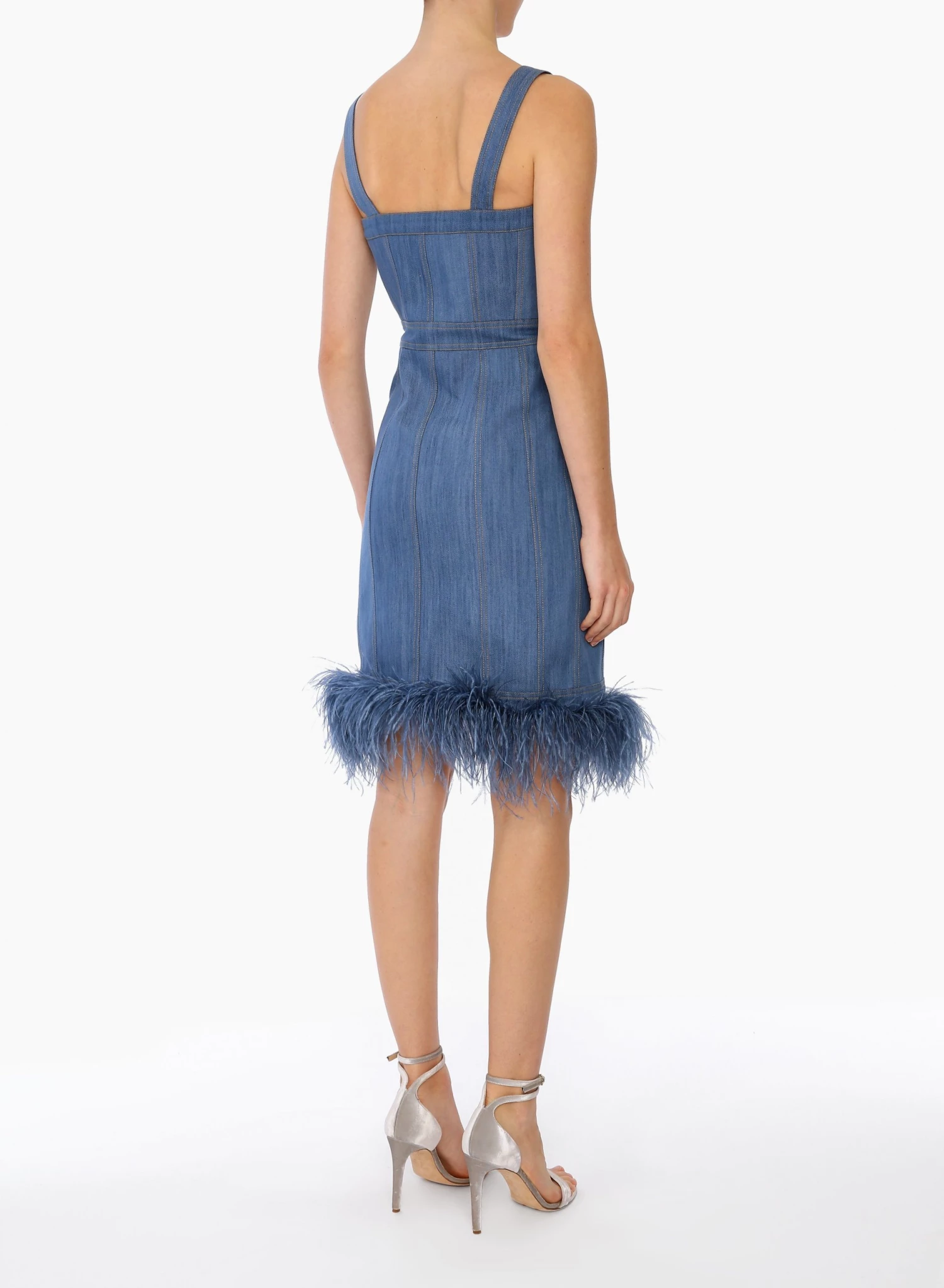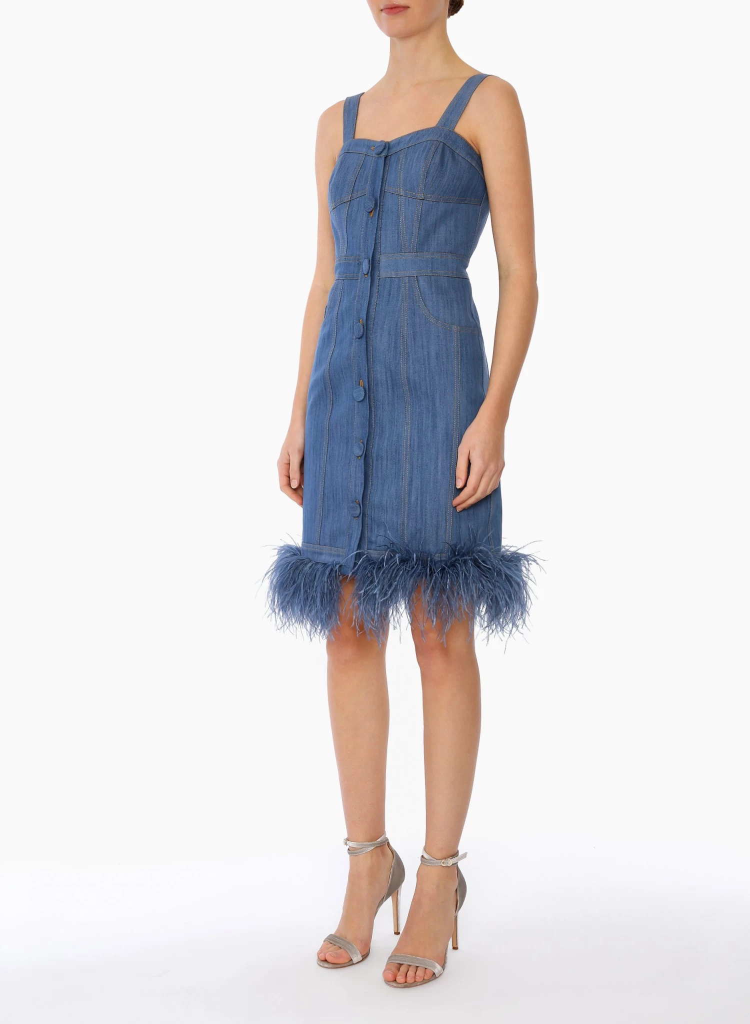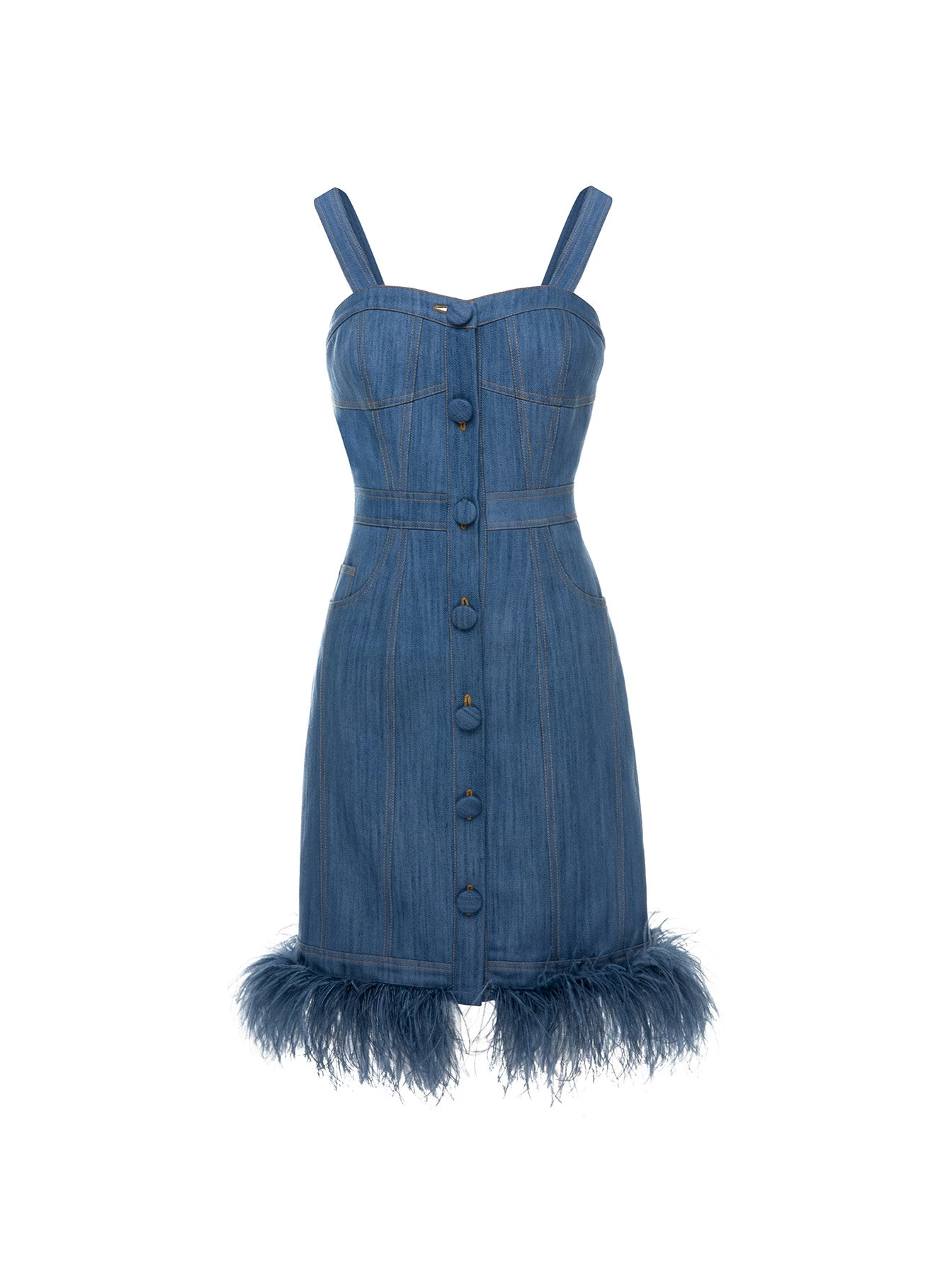 The Tierra dress is a strap dress crafted from denim with a small amount of stretch. The Tierra is in a pigmented mid-blue wash with contrast stitching, bustier effect panels, self-fabric buttons through centre front and a tonal ostrich feather trim at the hem. Lined in 100% silk.
