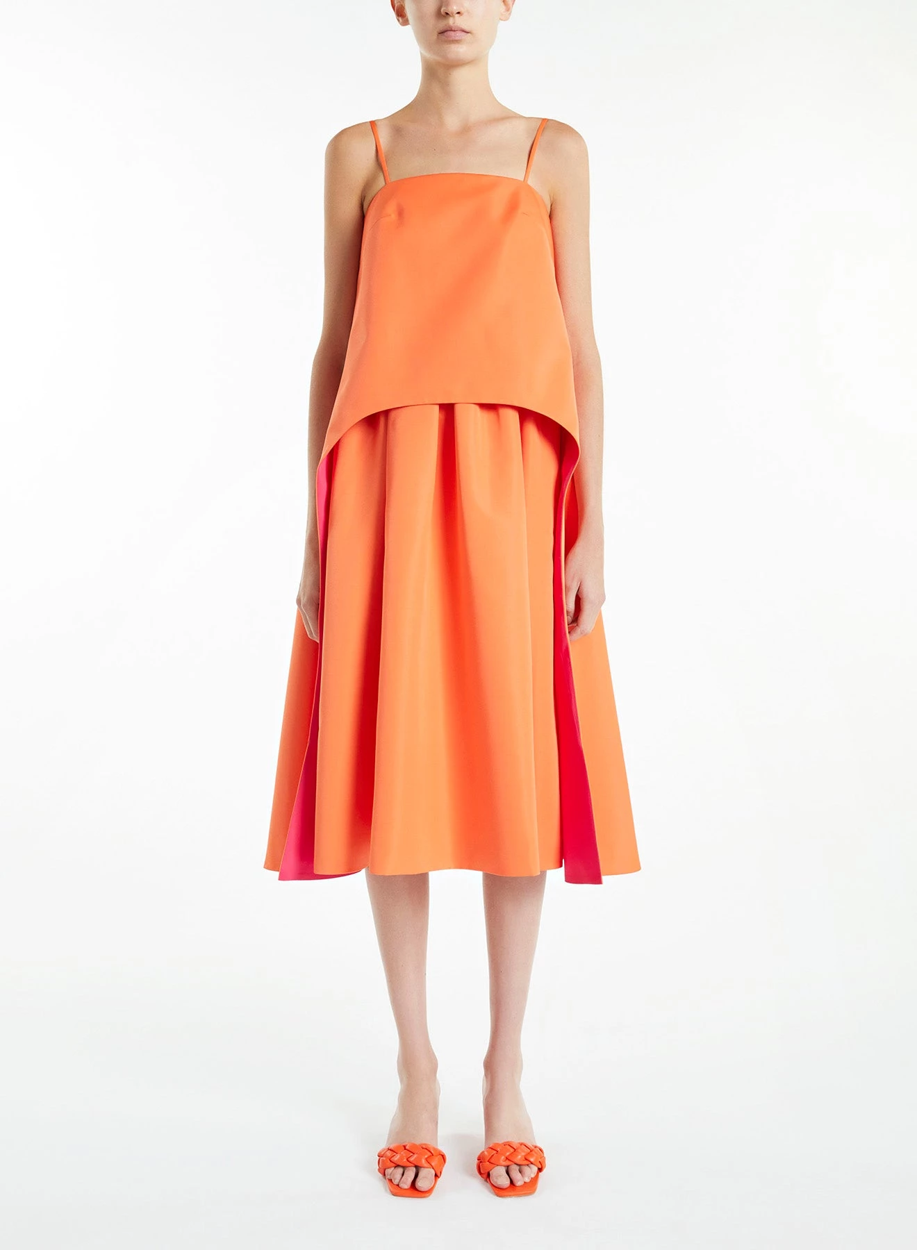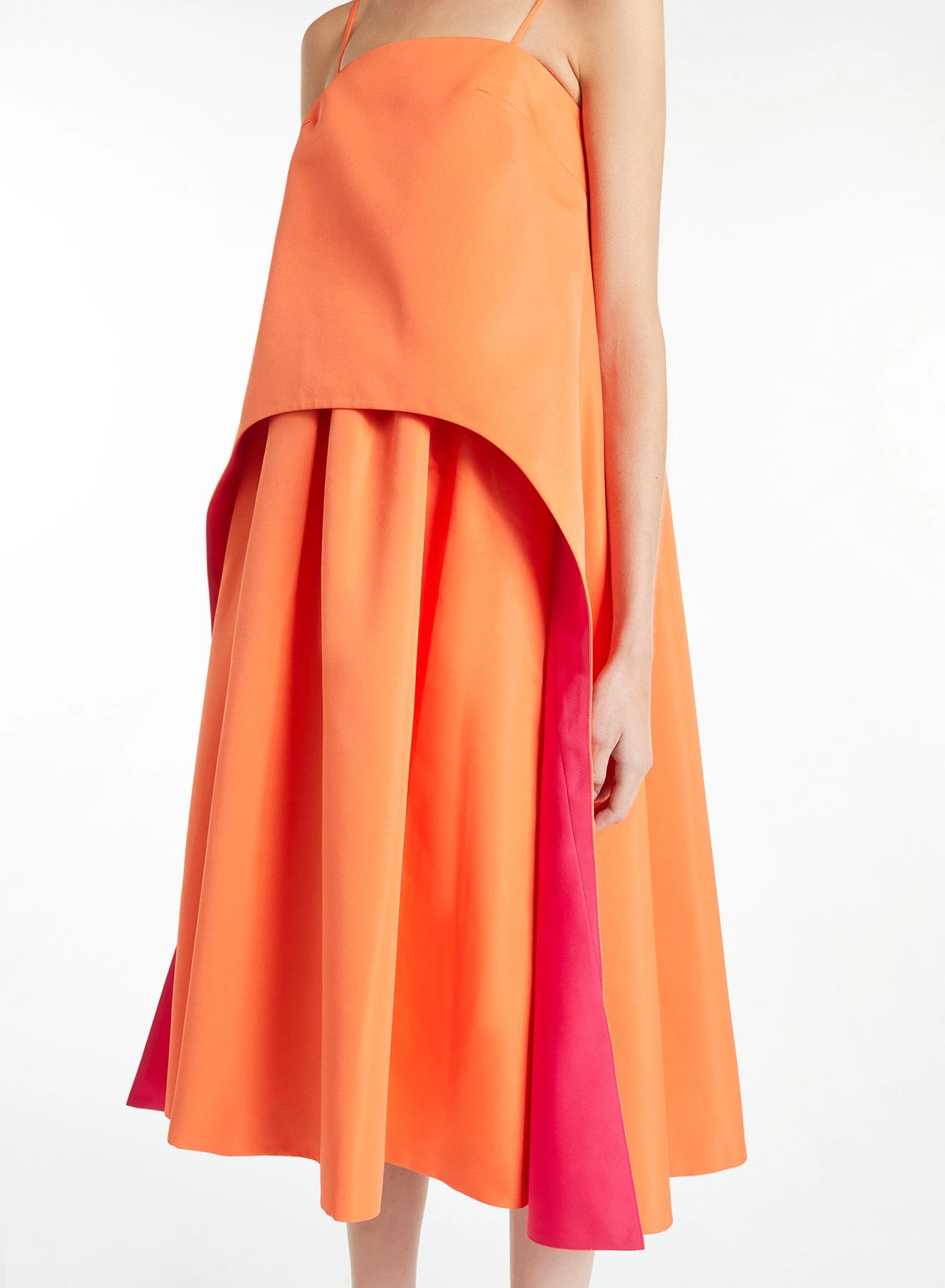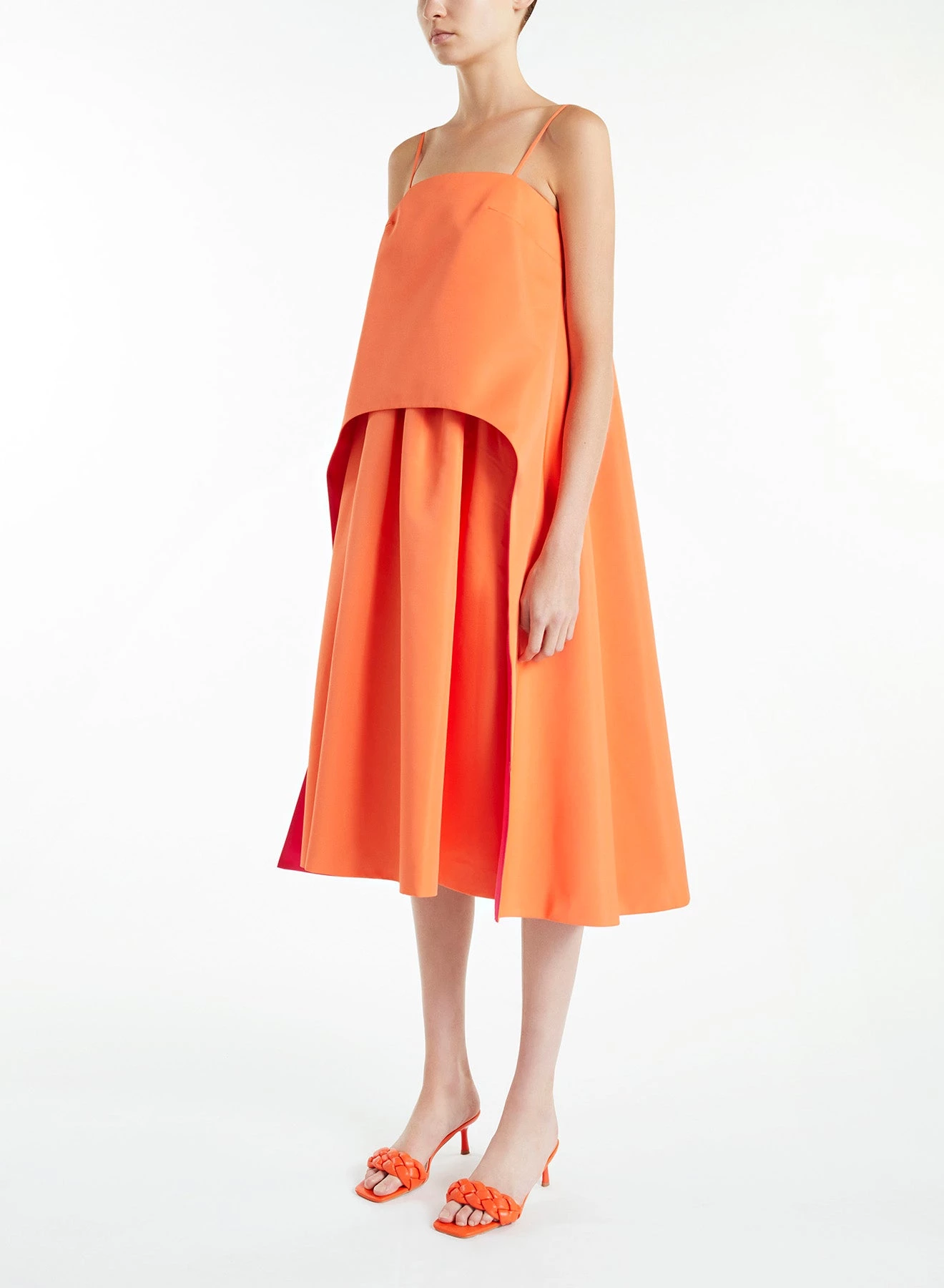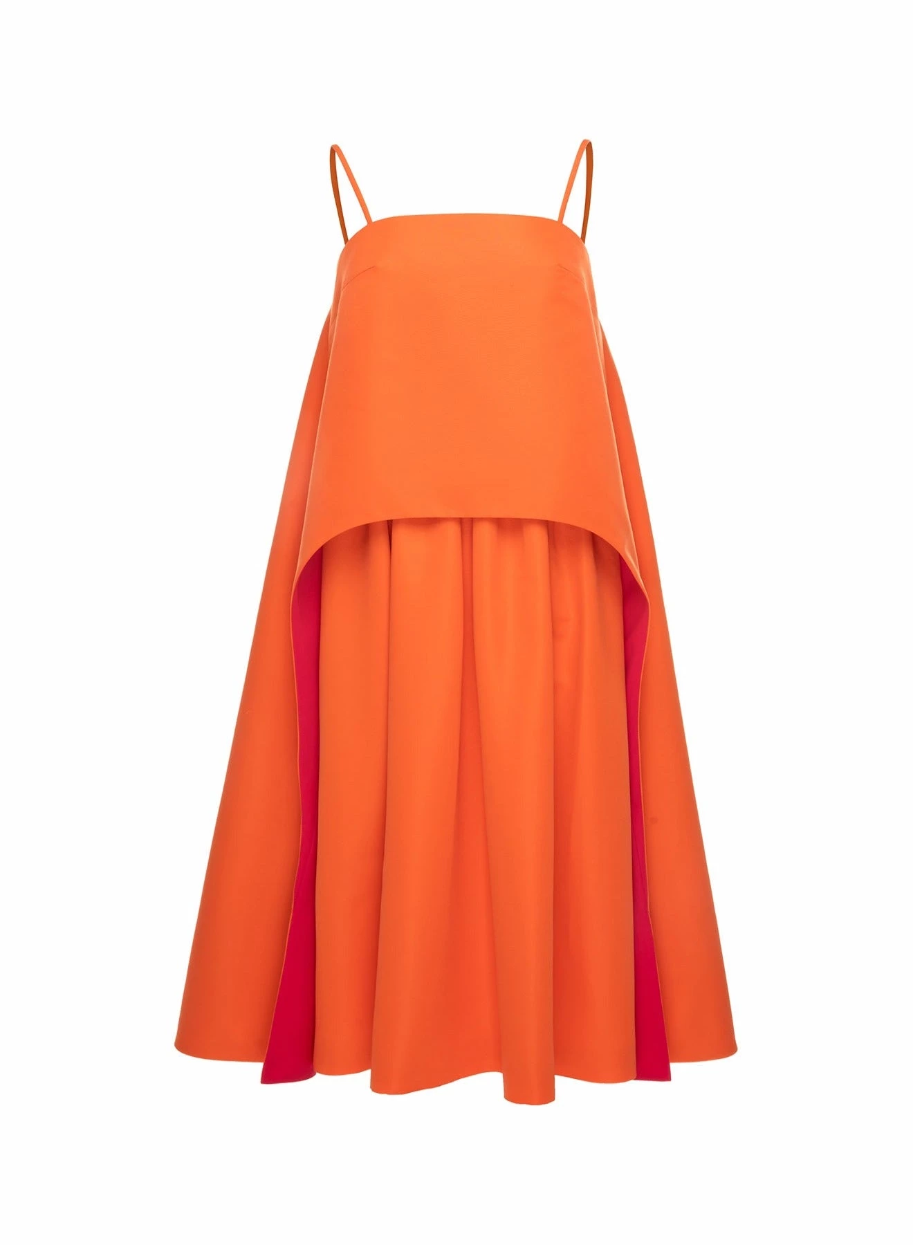Exclusive to huishanzhang.com, the Florie is a minimal, strappy dress, made from a structural midweight orange and fuchsia cotton. It has an architectural shape, straight neckline and a two-colour cape.