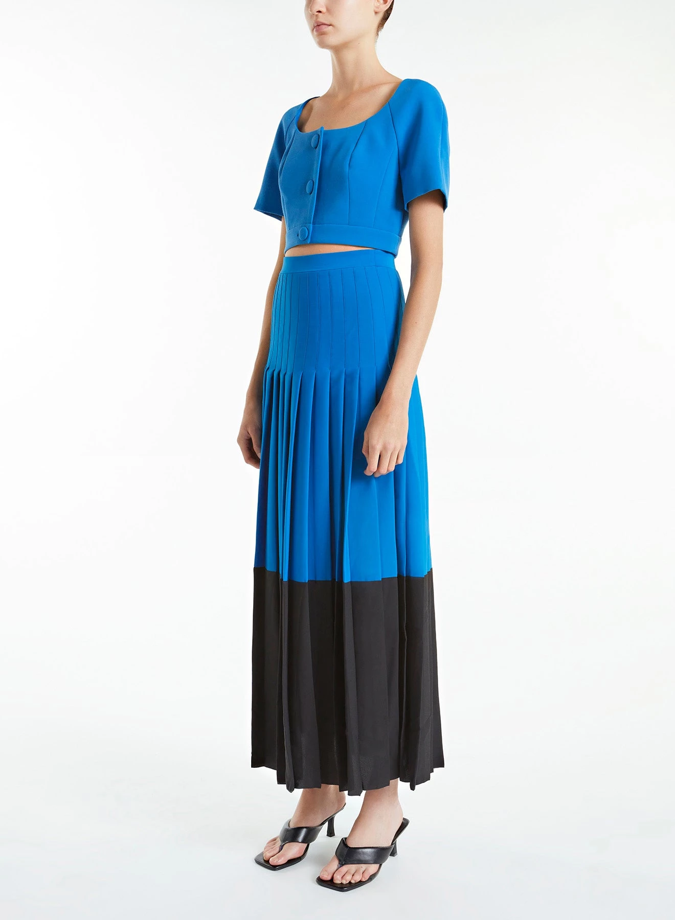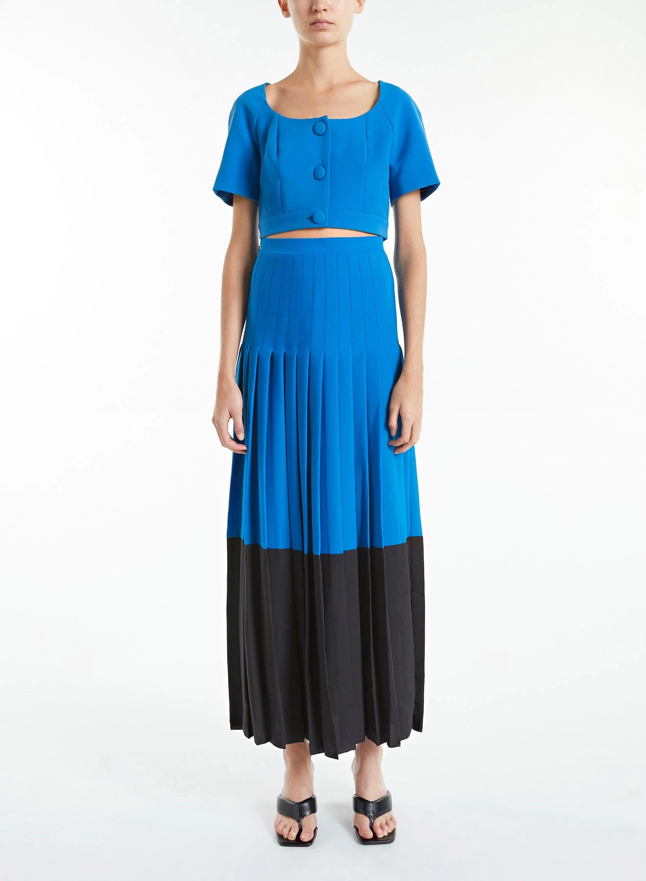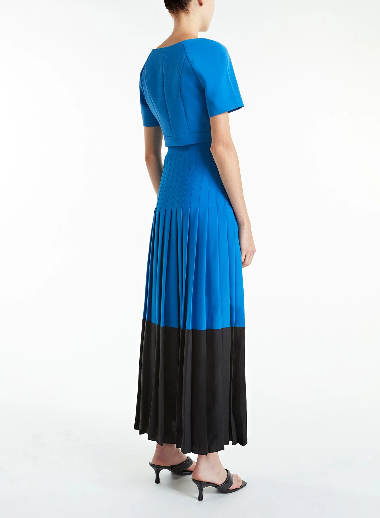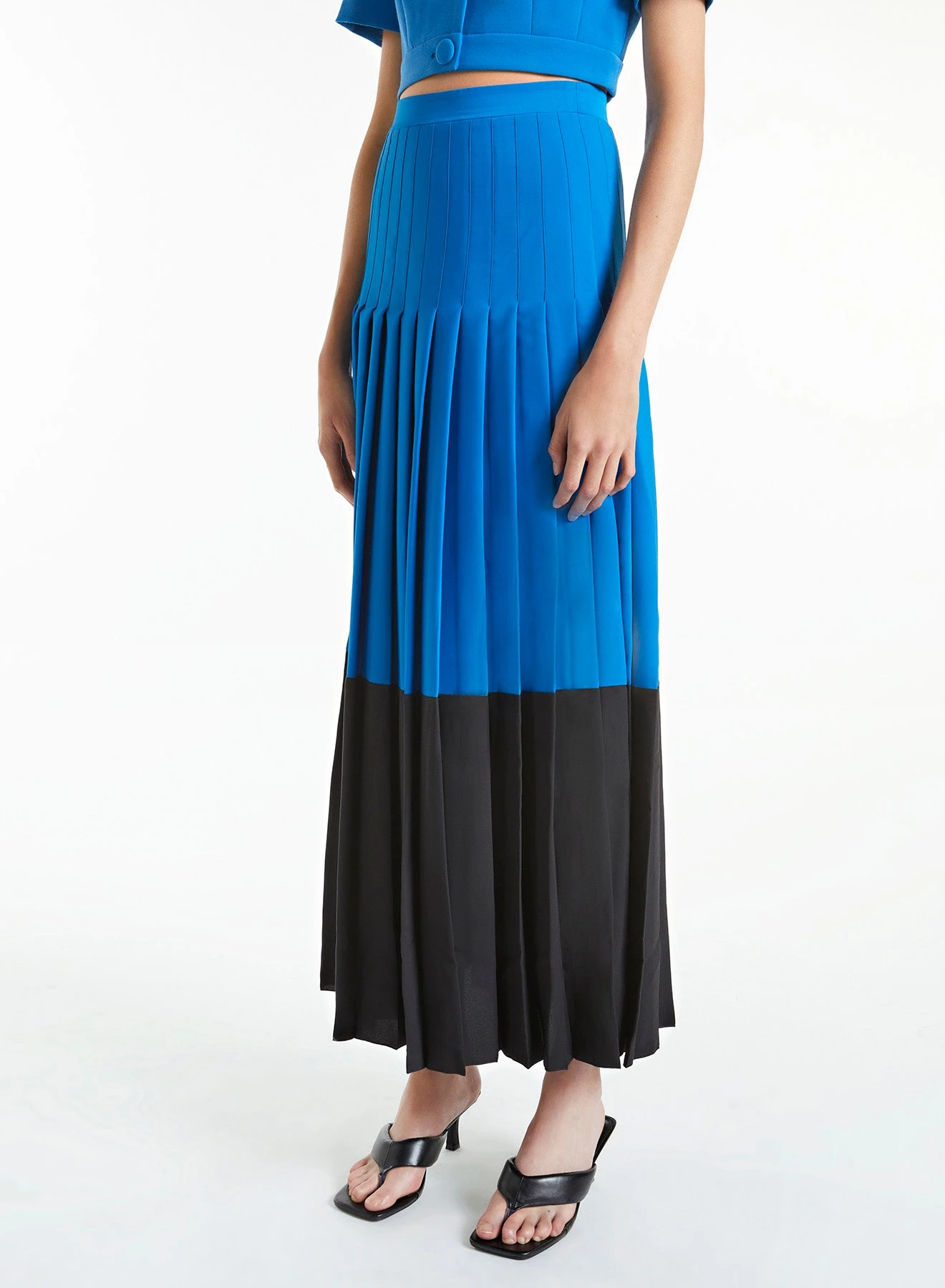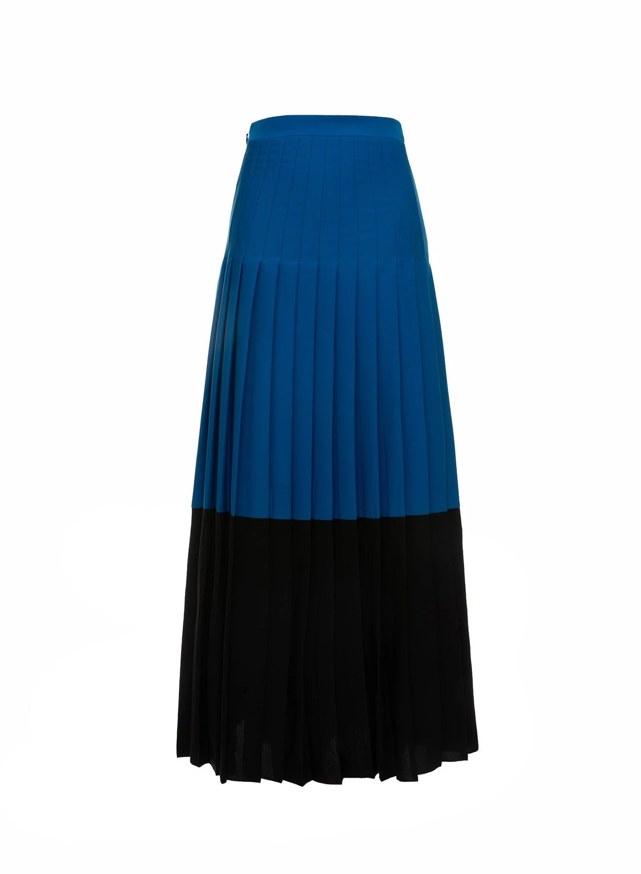 Exclusive to huishanzhang.com, the Robin is a full-length pleated skirt made of lightweight pleated crepe in electric blue and black.Â