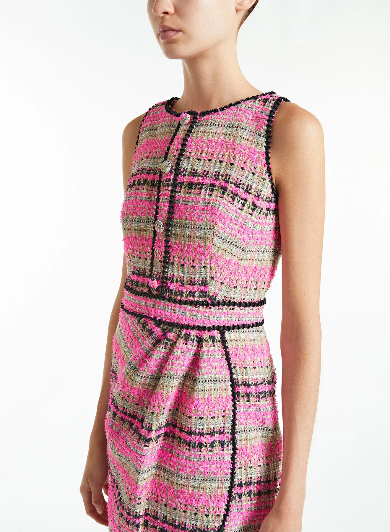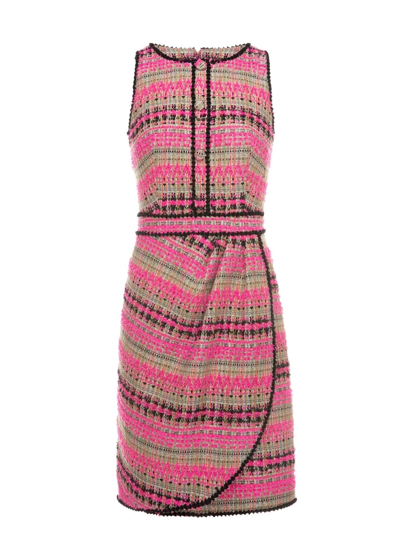 Exclusive to huishanzhang.com, the Marnie is a round neck, sleeveless dress in a pink and multicoloured tweed, with black structural lines throughout.Â