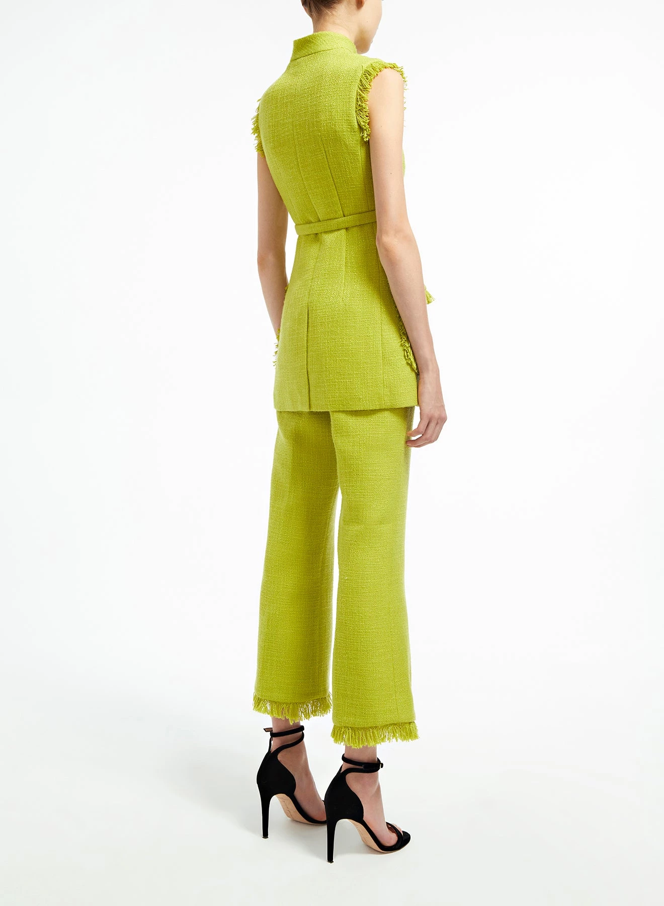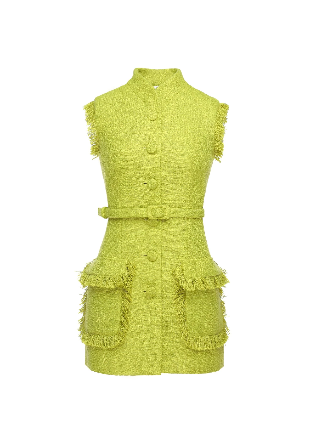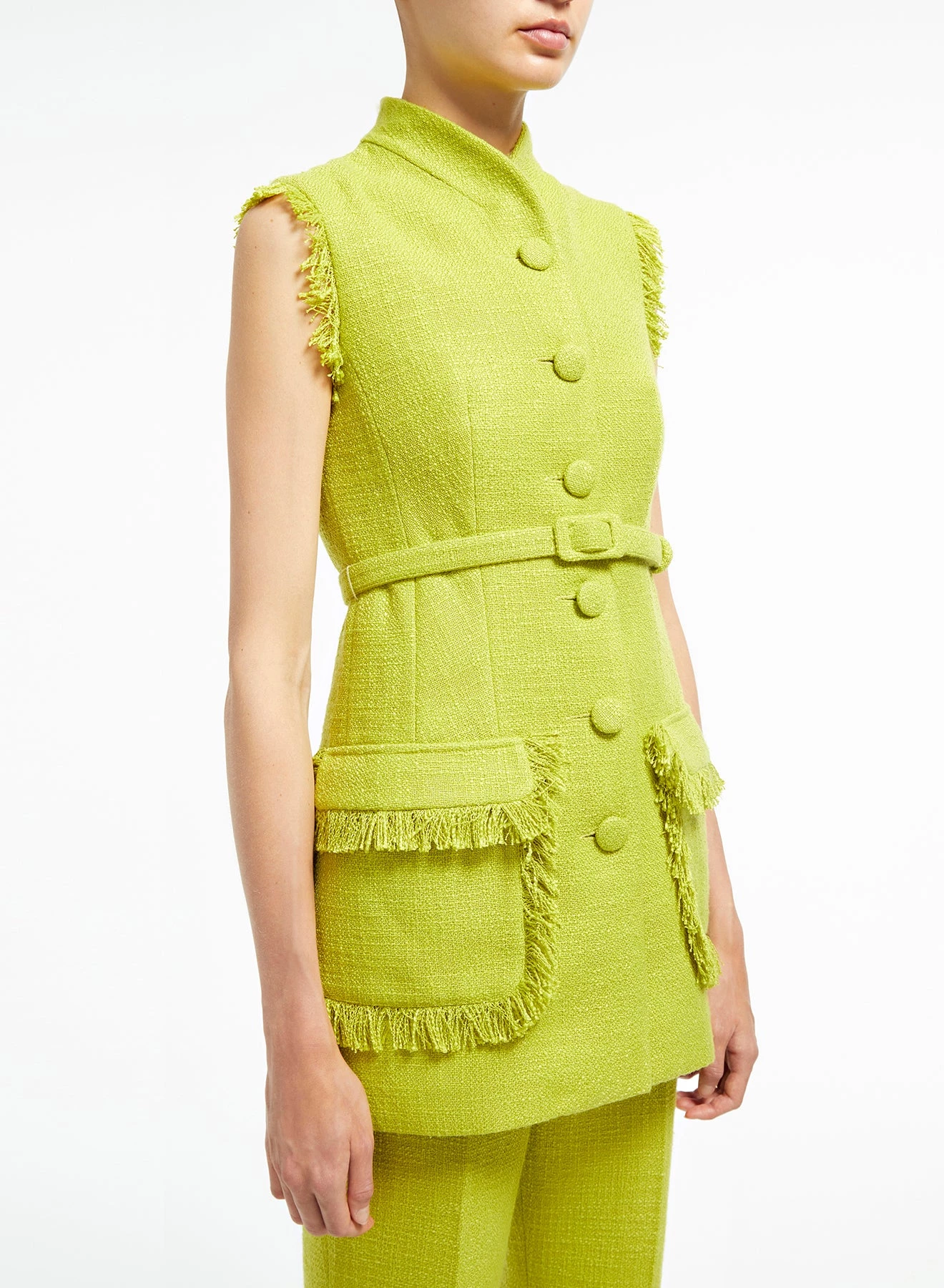 The Paige Jacket is a sleeveless gilet-jacket tailored from mid-weight lime-green tweed, embellished with self-fabric fringed hems. It has a mandarin-style collar, large squared pockets and a defining waist belt.