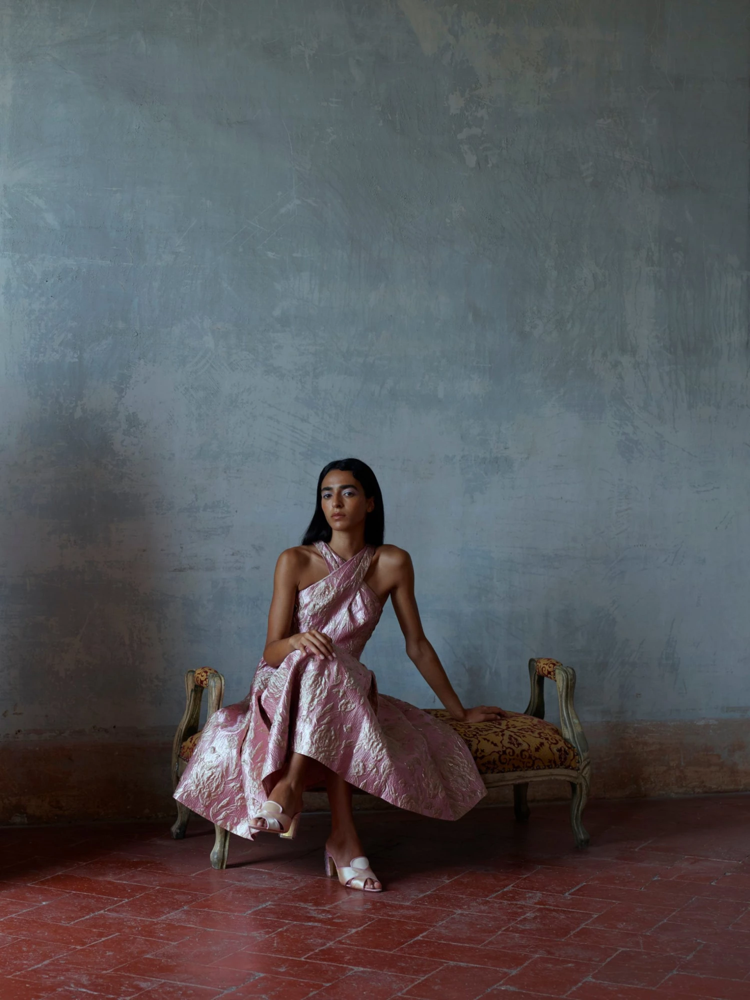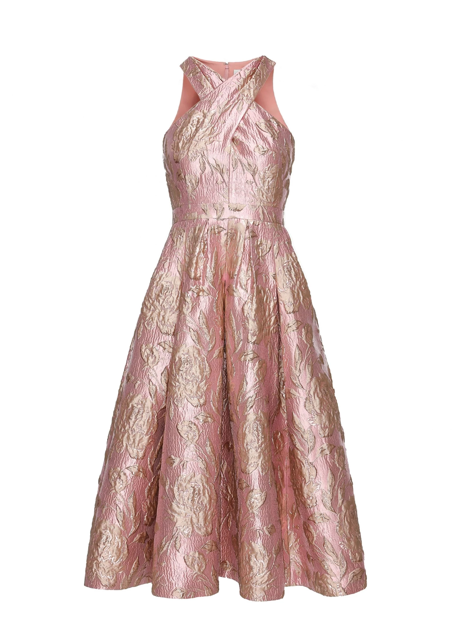 The Polly Dress is a pink and gold, jacquard knitted, knee-length dress. It has cross over halter neck sleeves, padded bust and voluminous skirt.