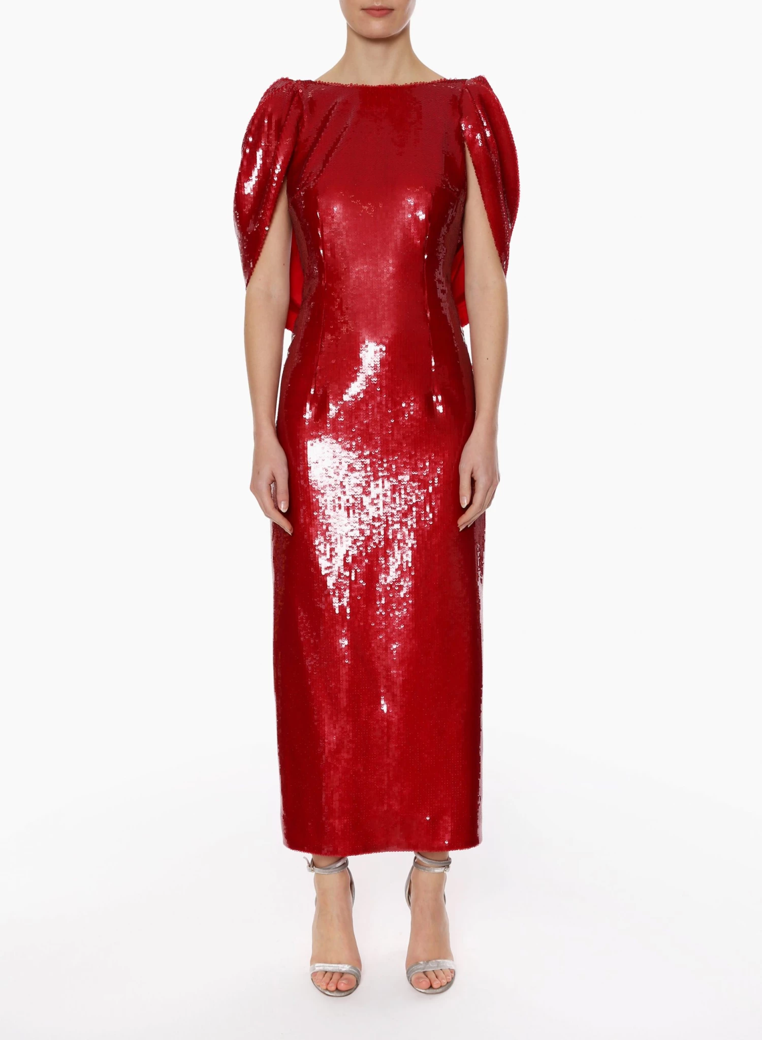 The Alba dress is an ankle length silhouette saturated in all-over sequins. This form-fitting style has a slashed neckline and an open back that drops into a V-shape. It is accentuated by a gathered panel that falls from each shoulder and drapes along the back.