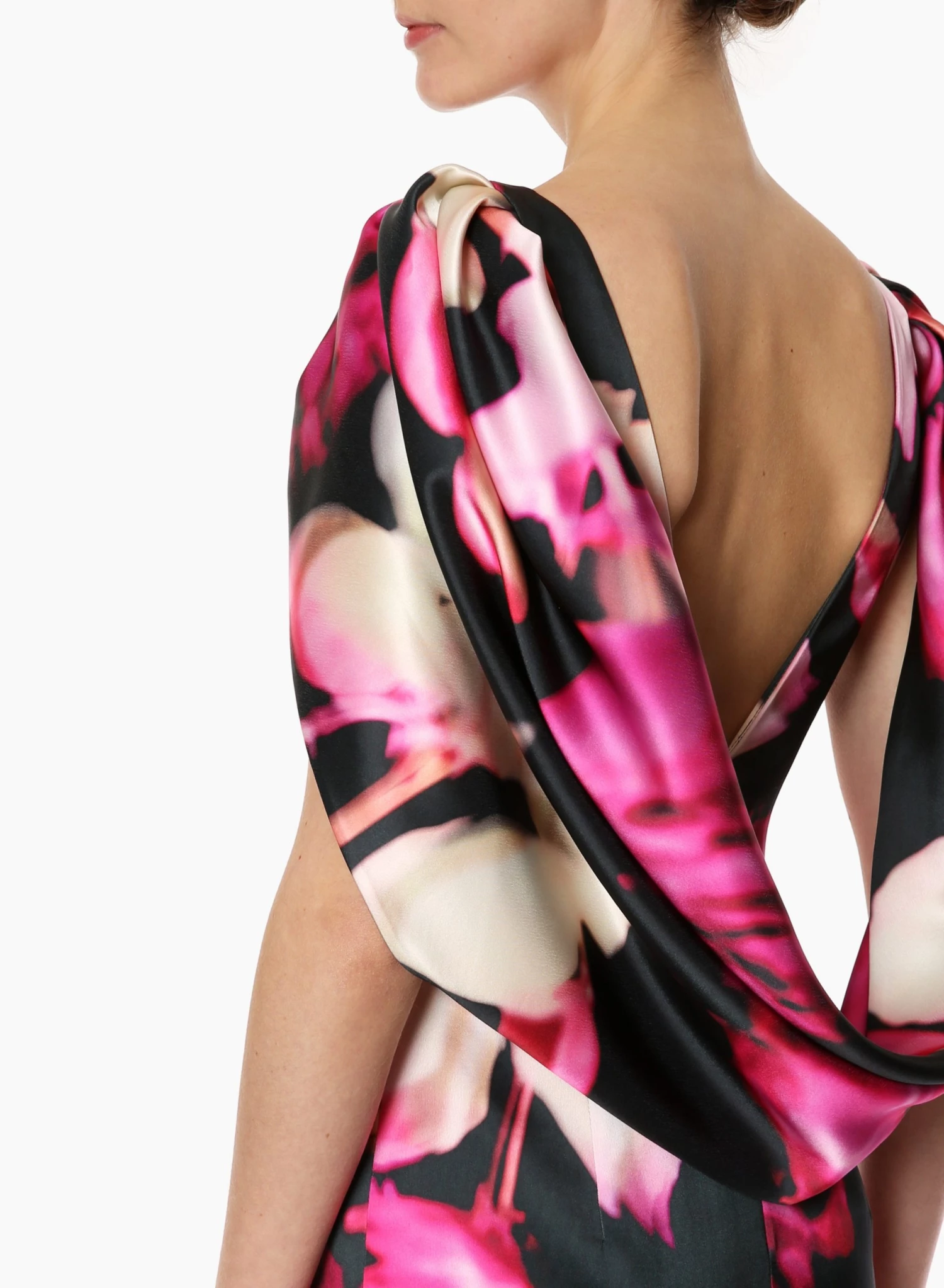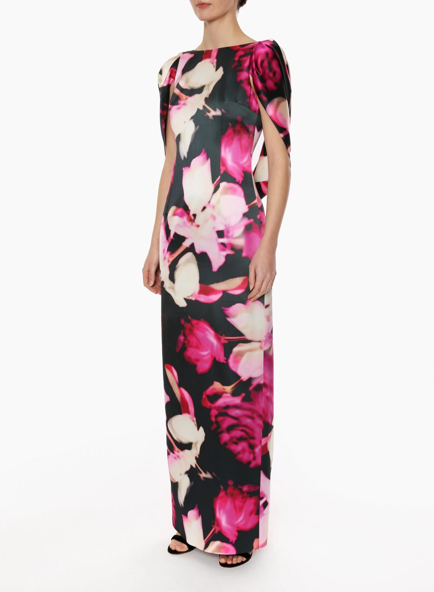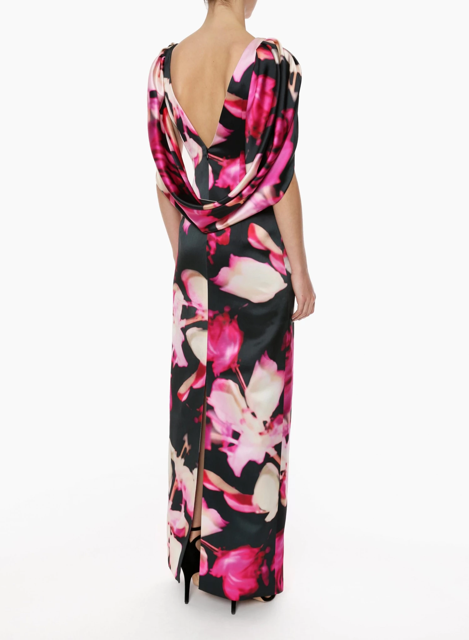 Exclusive to huishanzhang.com, the Augusta gown is a floor-length silhouette cut from acetate satin. This form-fitting style has a slashed neckline and an open back that drops into a V-shape. It is accentuated by a gathered panel that falls from each shoulder and drapes along the back.