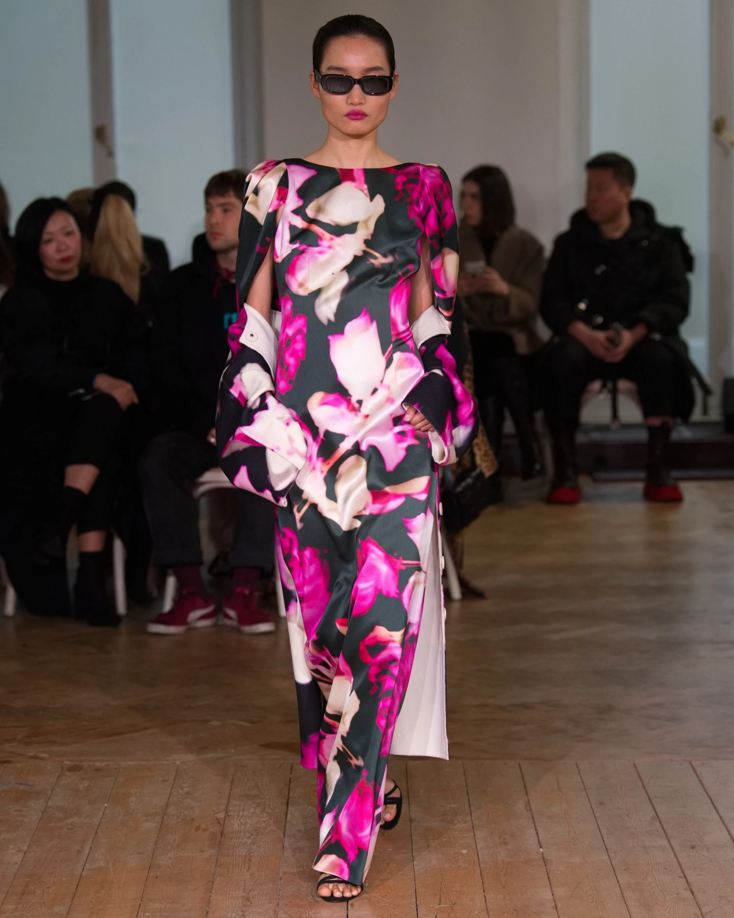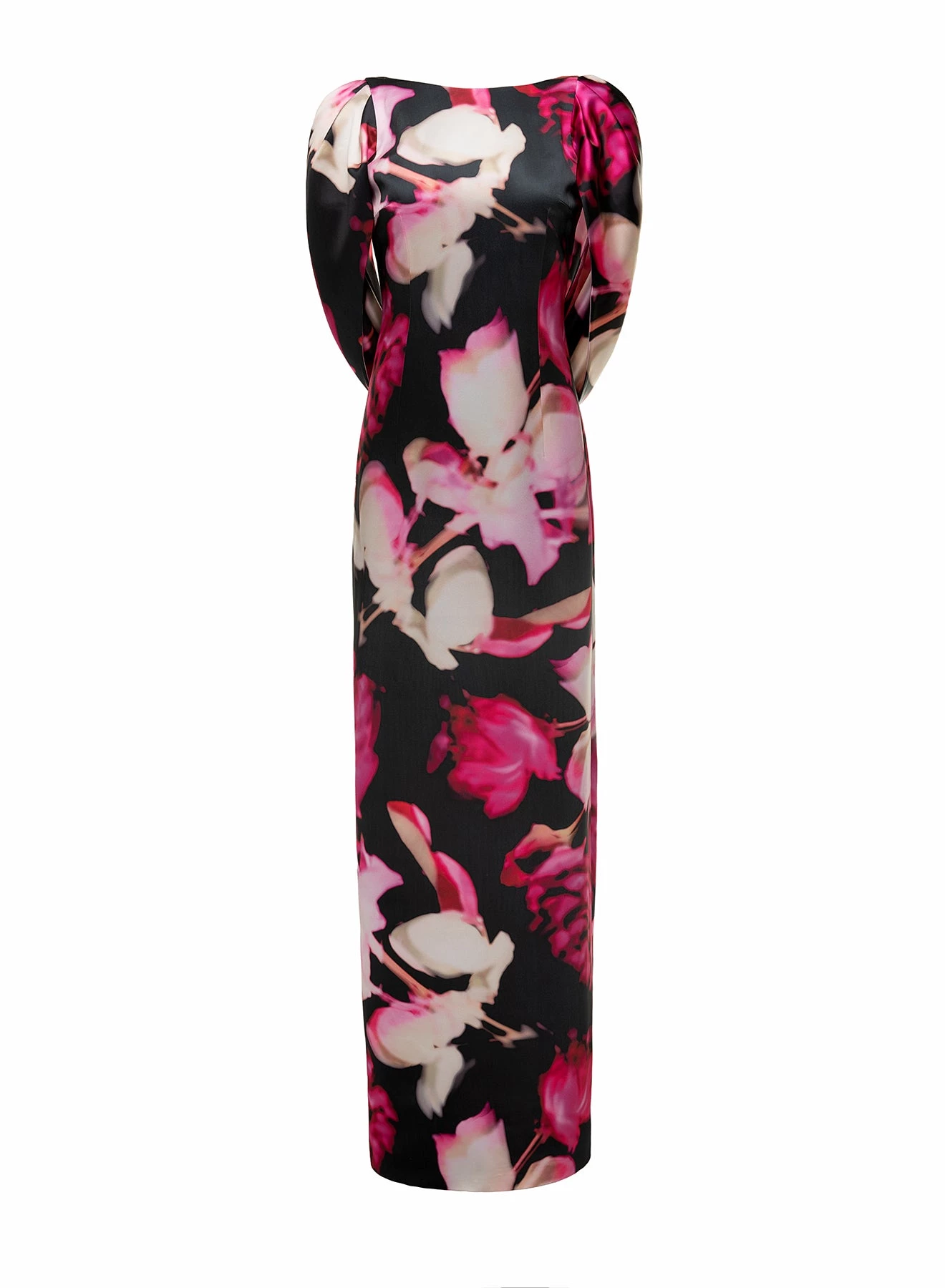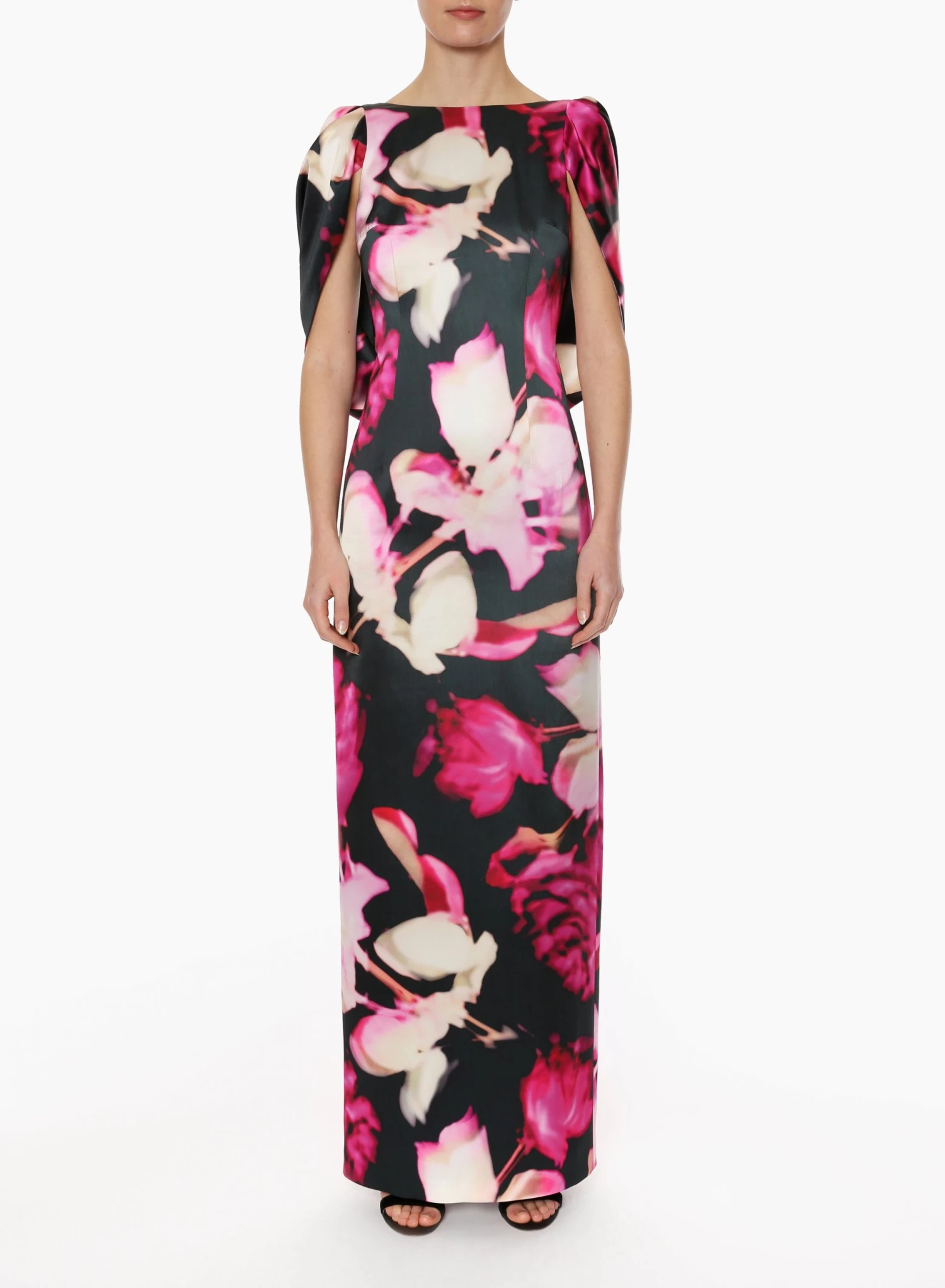 Exclusive to huishanzhang.com, the Augusta gown is a floor-length silhouette cut from acetate satin. This form-fitting style has a slashed neckline and an open back that drops into a V-shape. It is accentuated by a gathered panel that falls from each shoulder and drapes along the back.