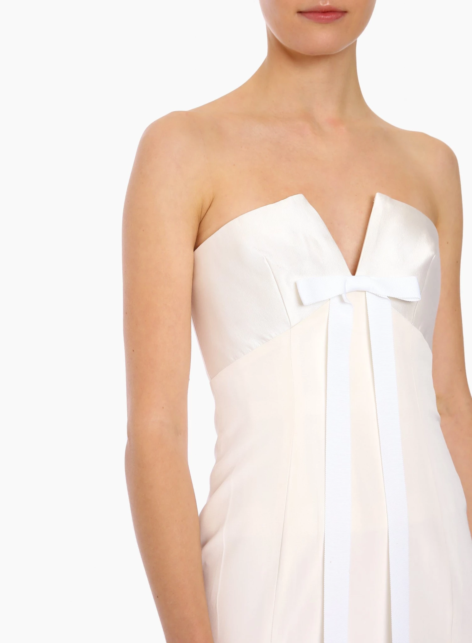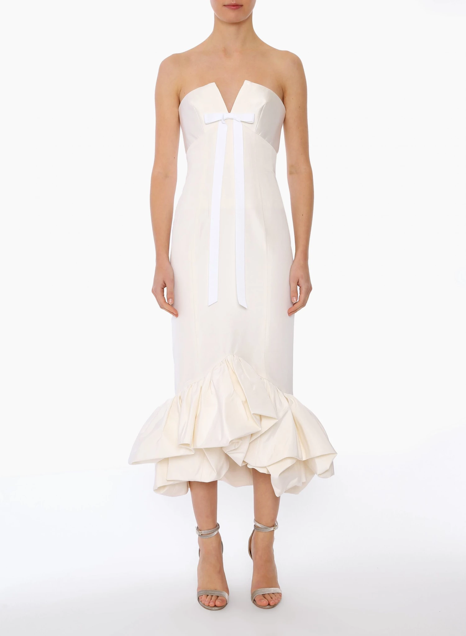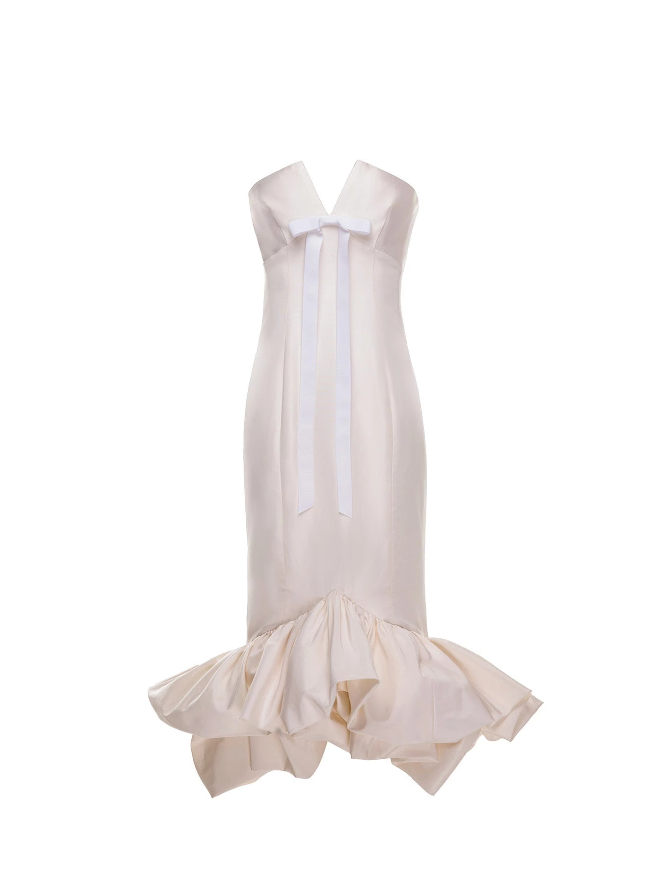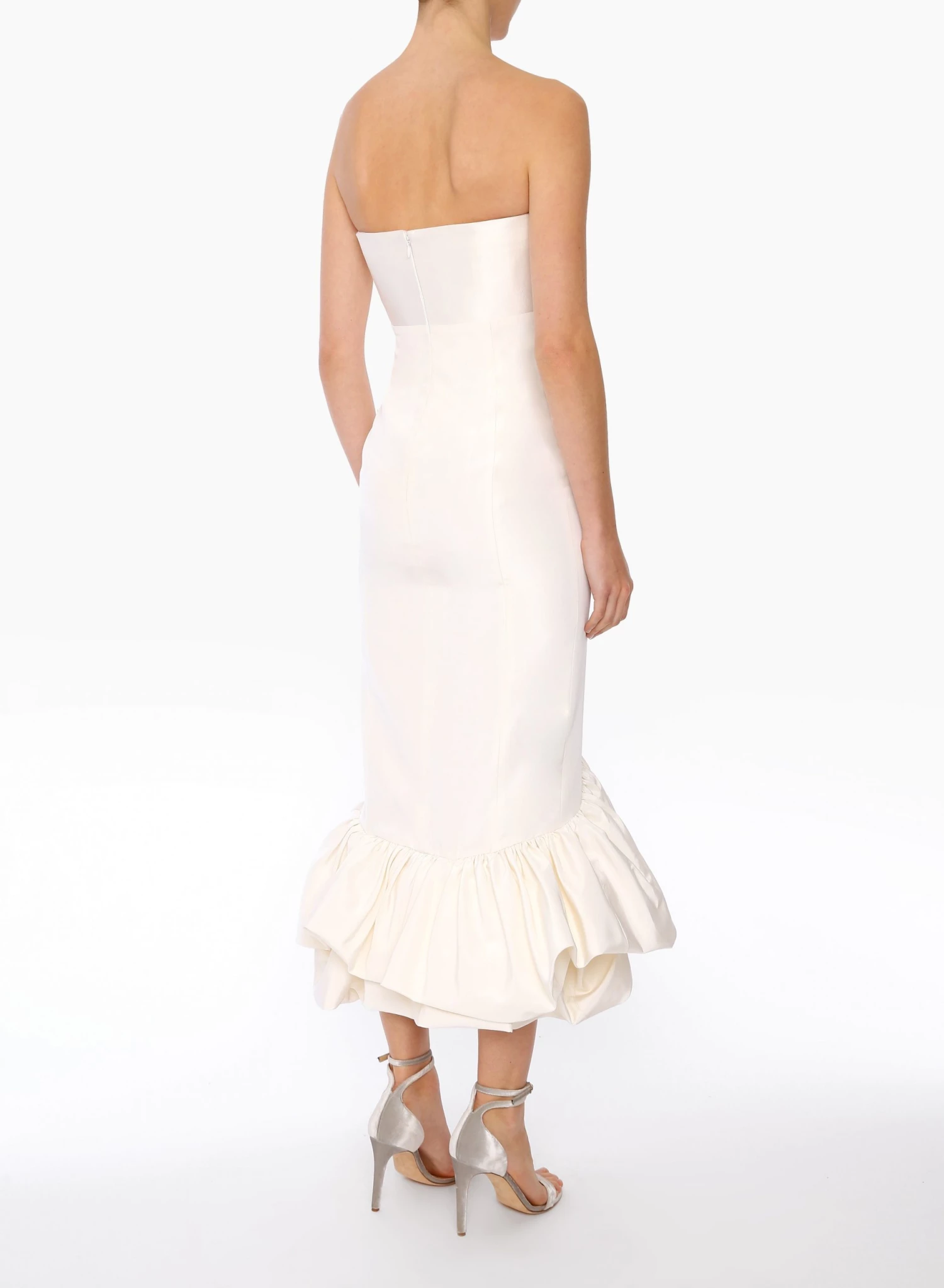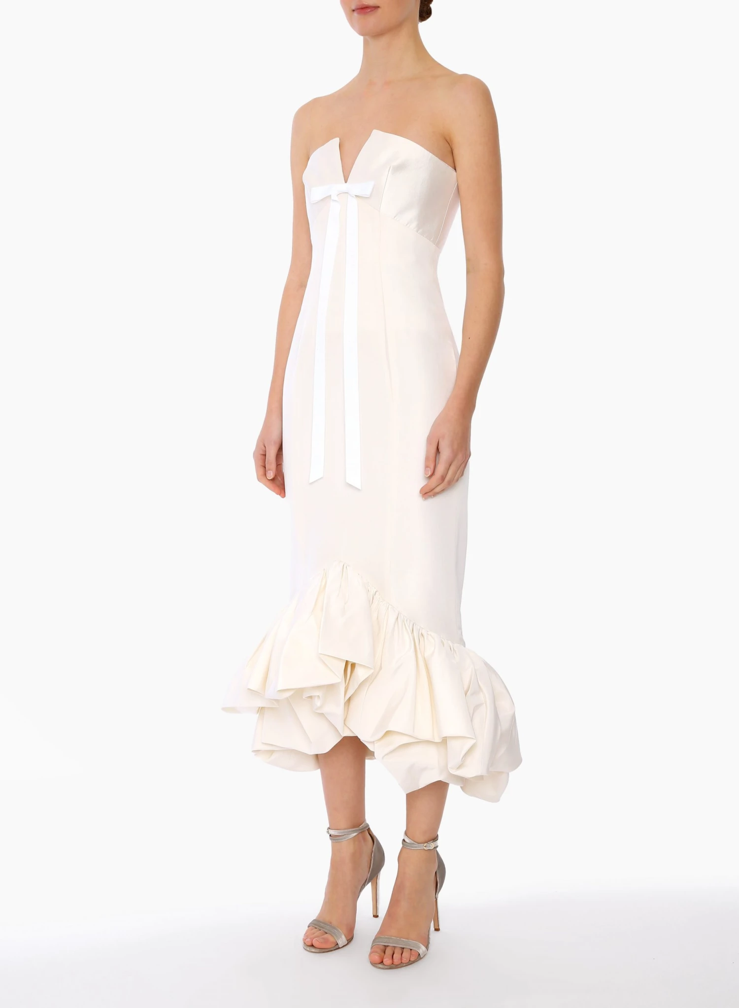 Exclusive to huishanzhang.com, the Candra dress has an ivory silk taffeta body with a sweetheart neckline in tonal duchess satin and a large ruffle peplum hem to offset the form-fitting silhouette. It zips at the back and features a white grosgrain ribbon detail that falls at centre front.