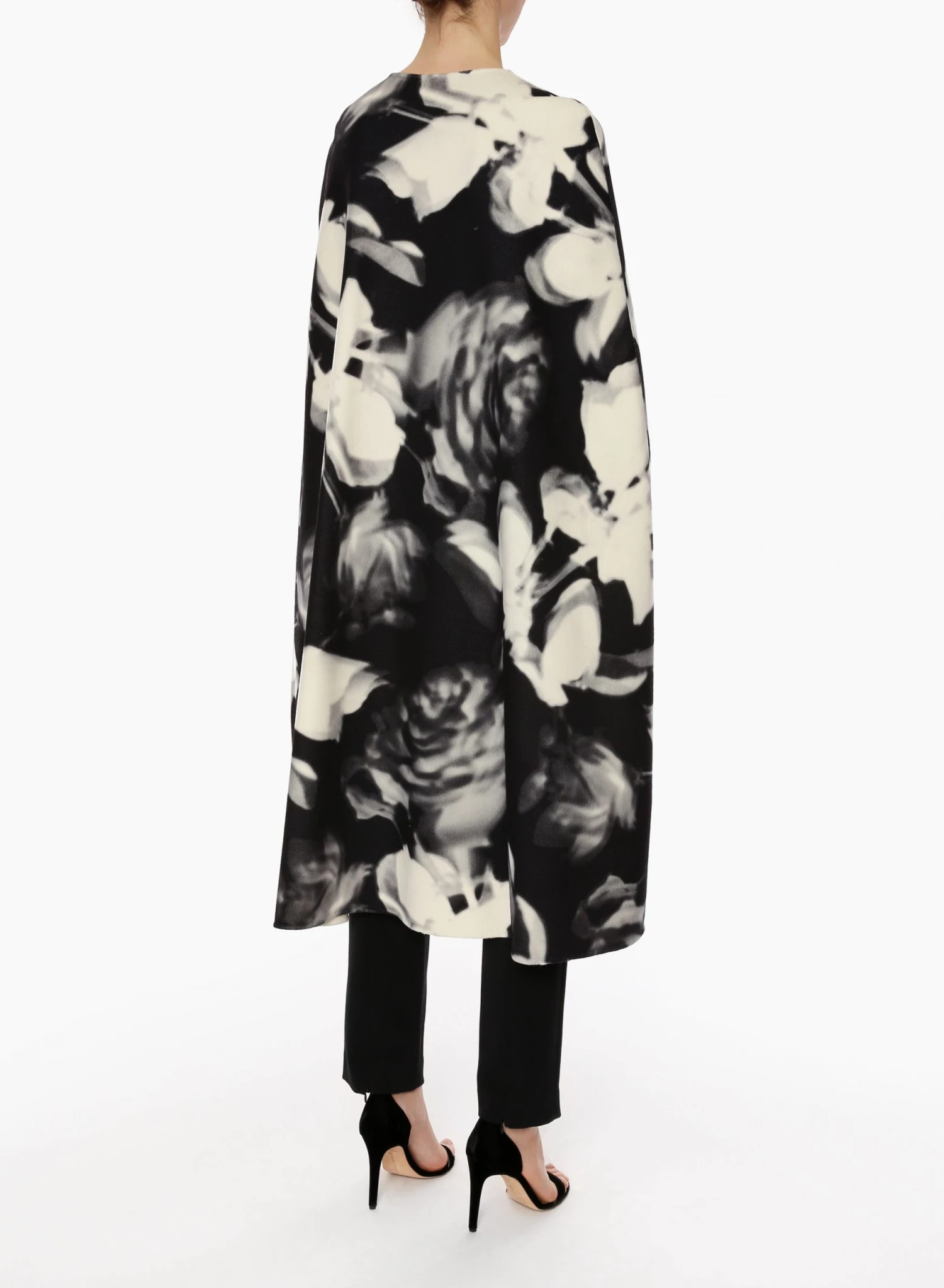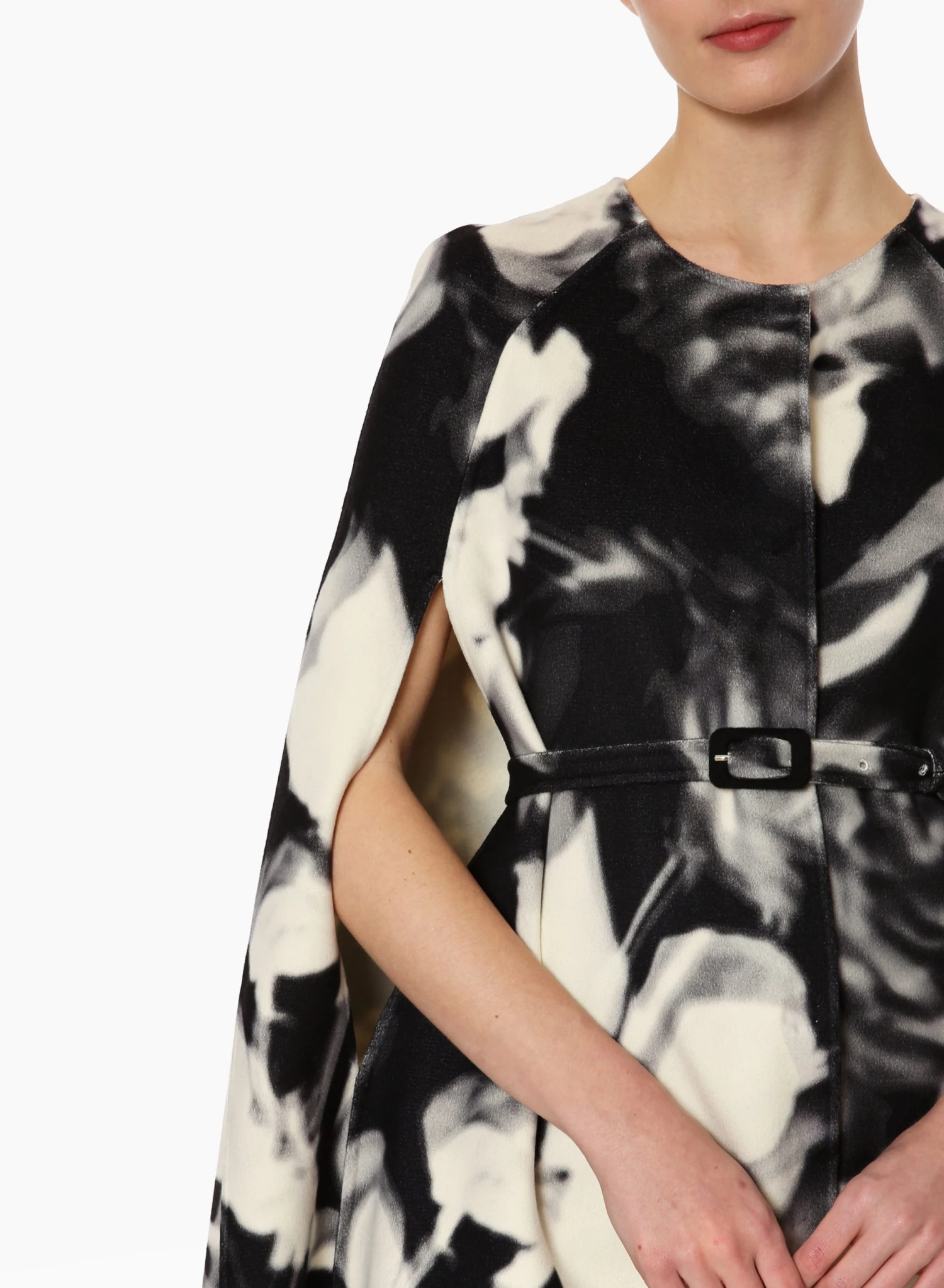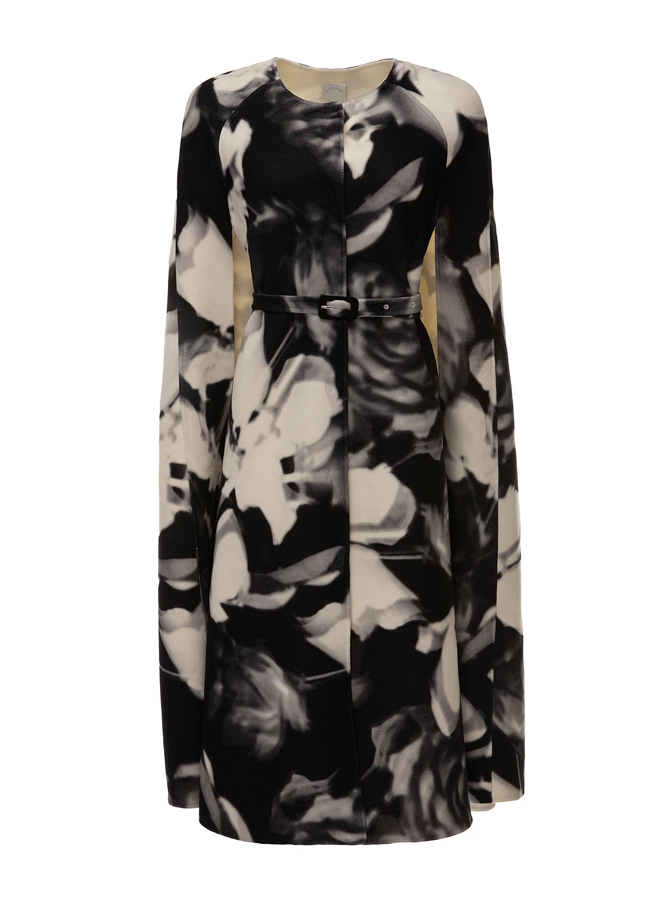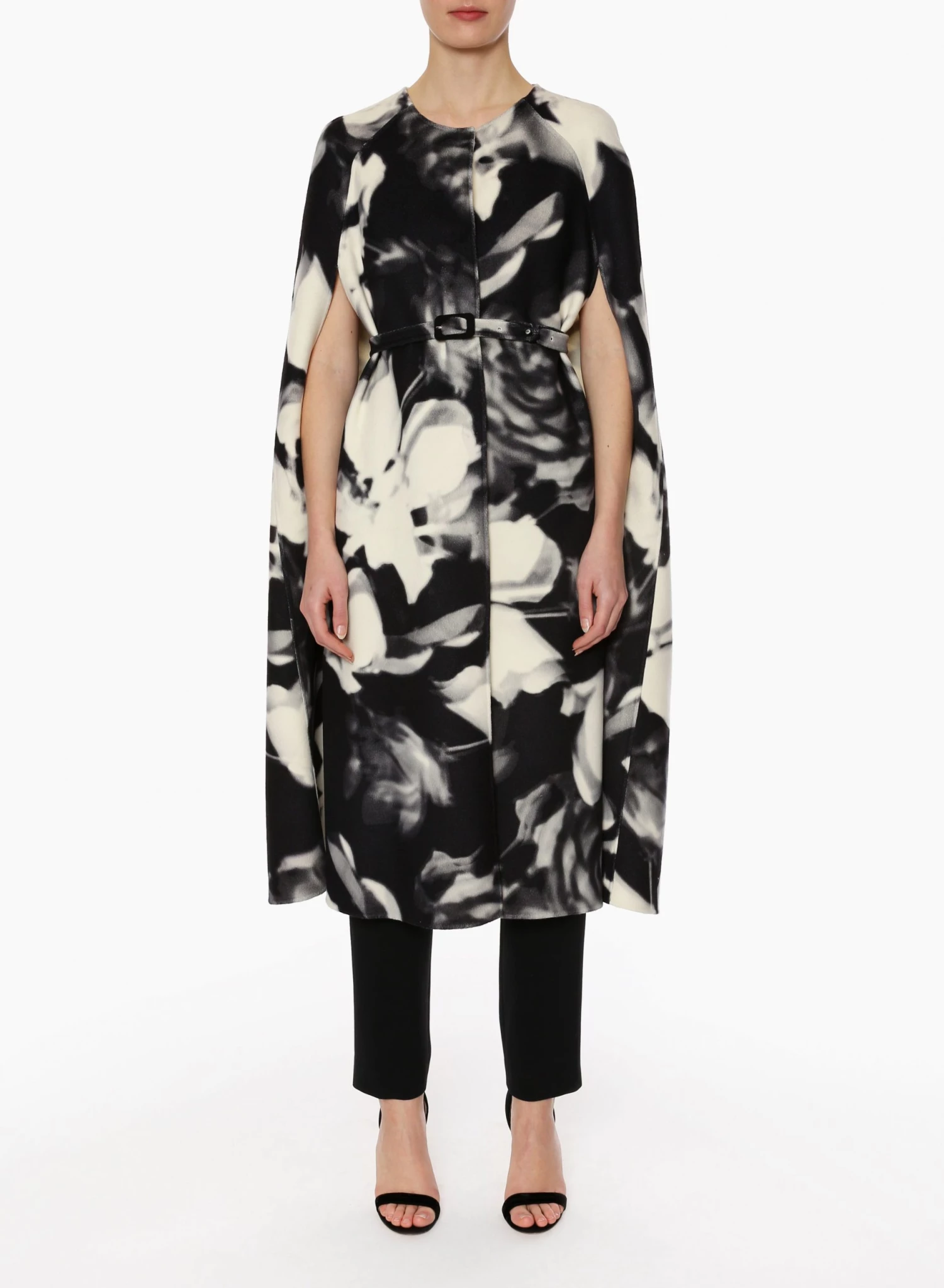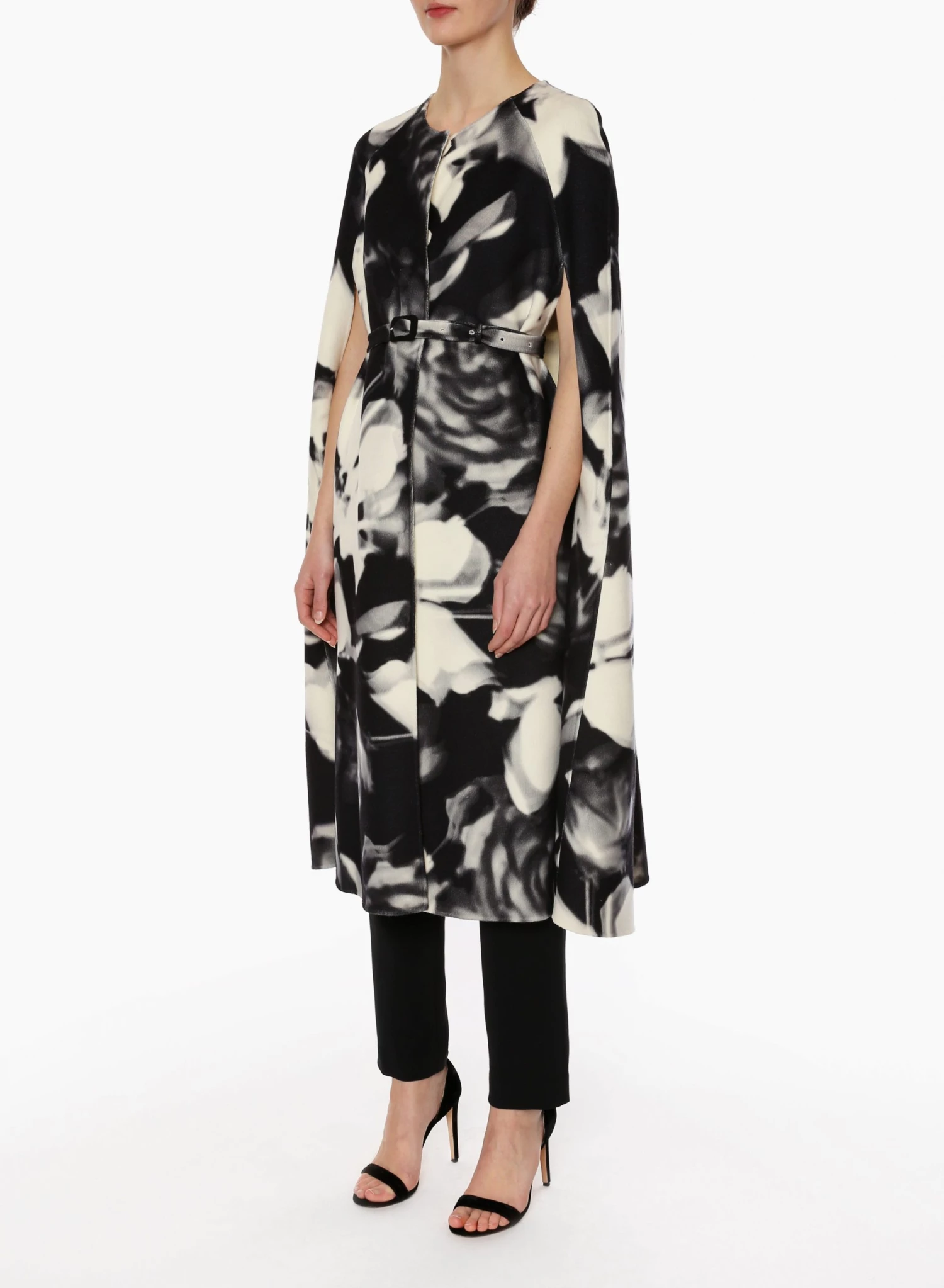 The Darcie coat is a midi length cape cut from lightweight, soft wool felt in the seasonal photo floral print. The Darcie has arm slits, concealed press studs and a self-fabric belt to cinch the waist.