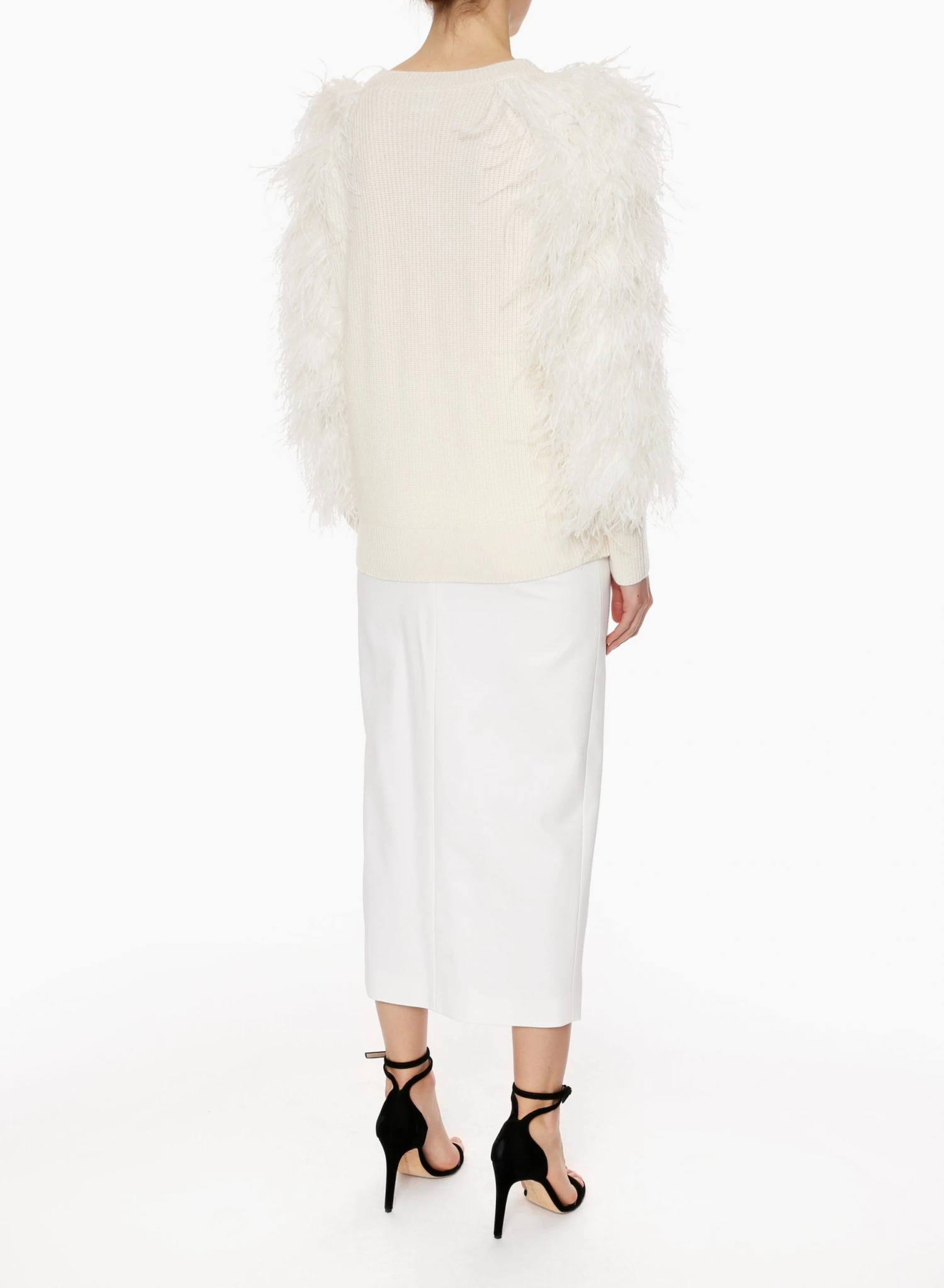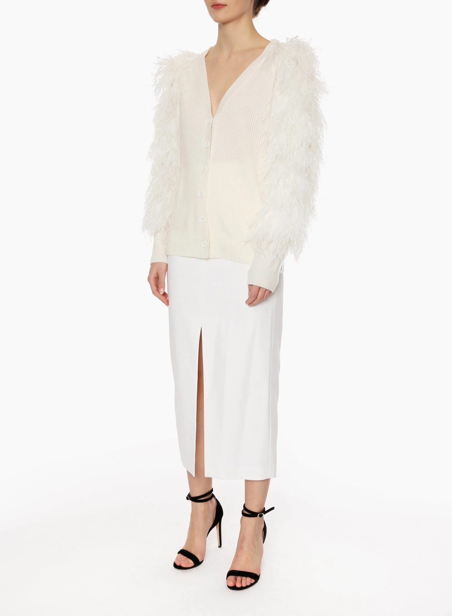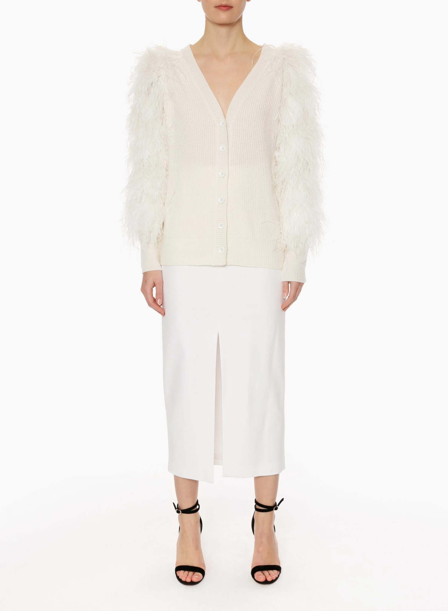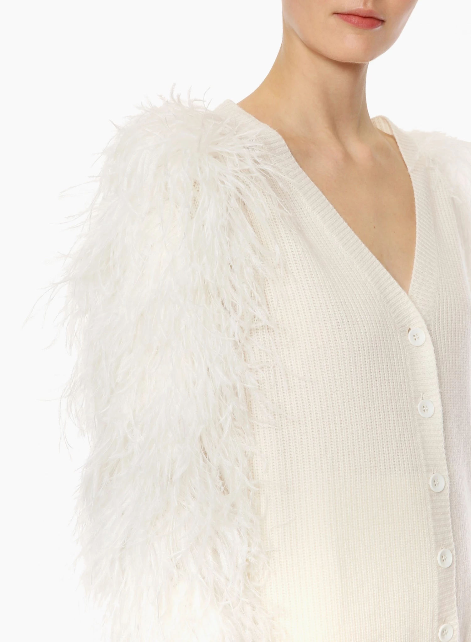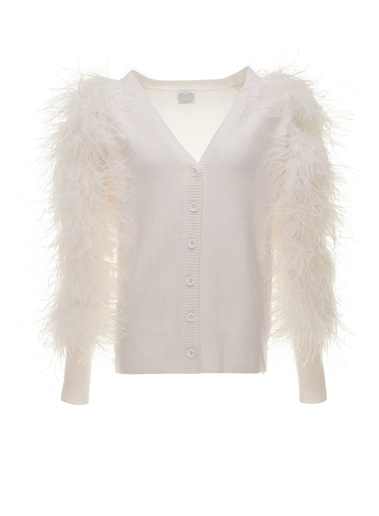 The Elin Cardigan has a loose fit, with feathers adorning the sleeves and buttons at the front.