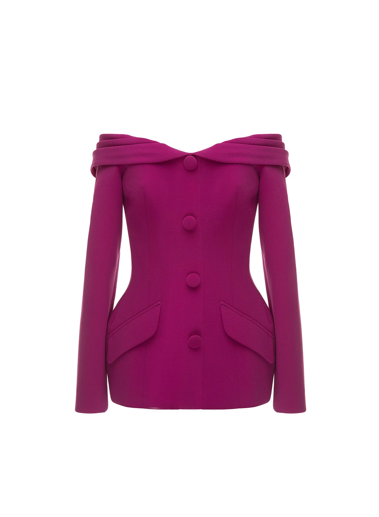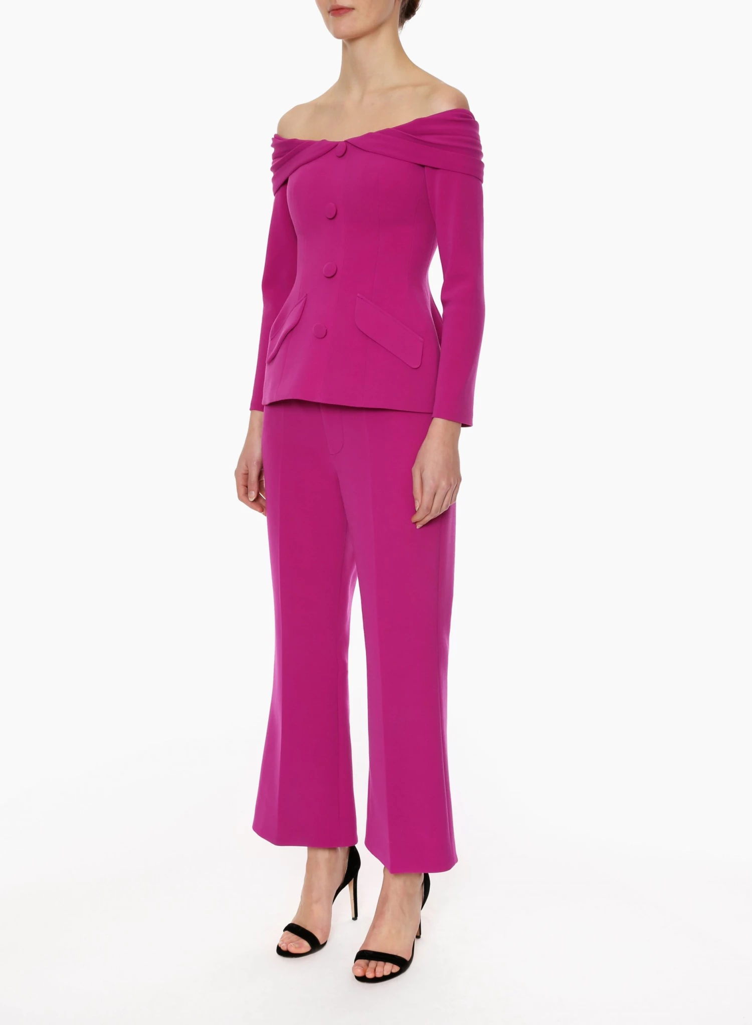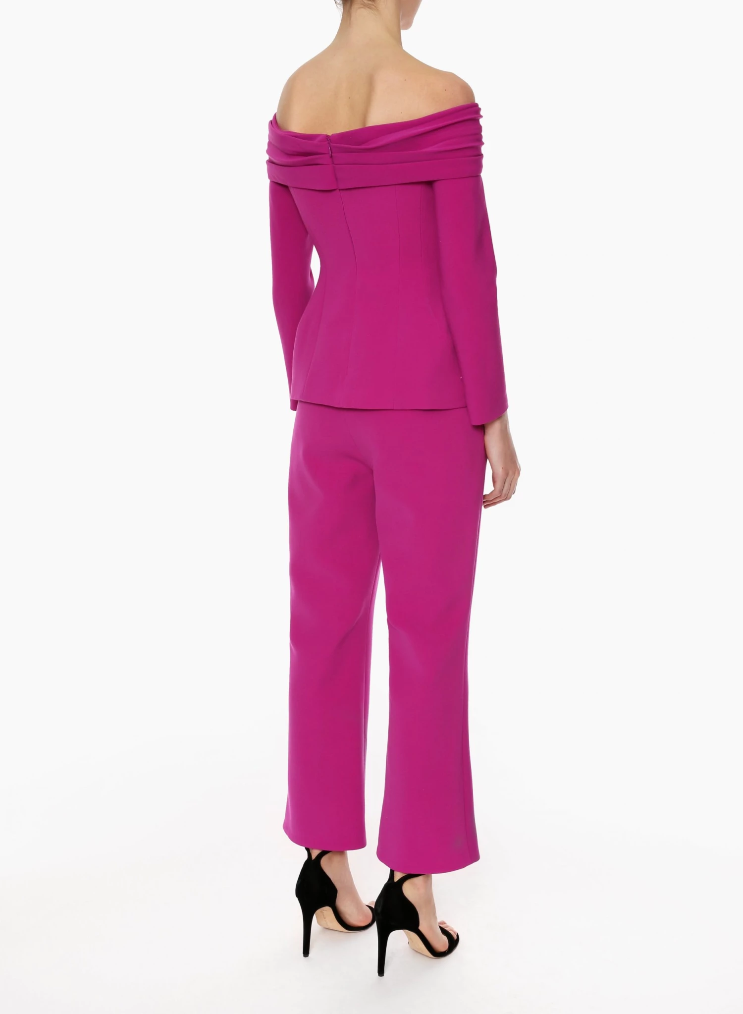 The Gabriella Blazer is cut from Italian crepe with a darted, peplum body. It has a ruched off-shoulder design, mock-buttons and pockets at the front. There is a concealed zip through centre-back. Paired with the Jill Trouser.