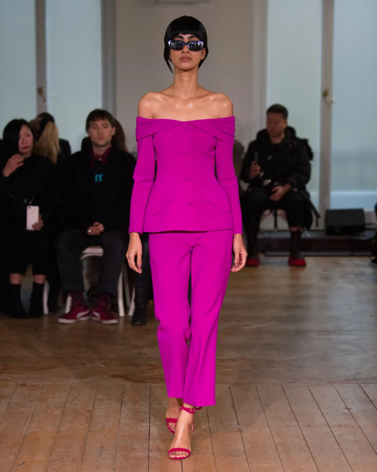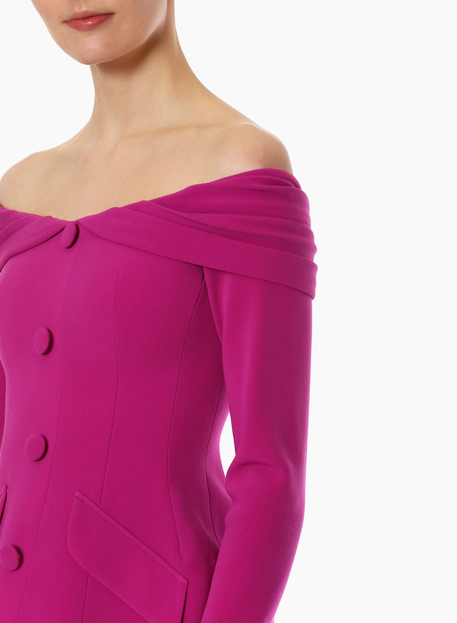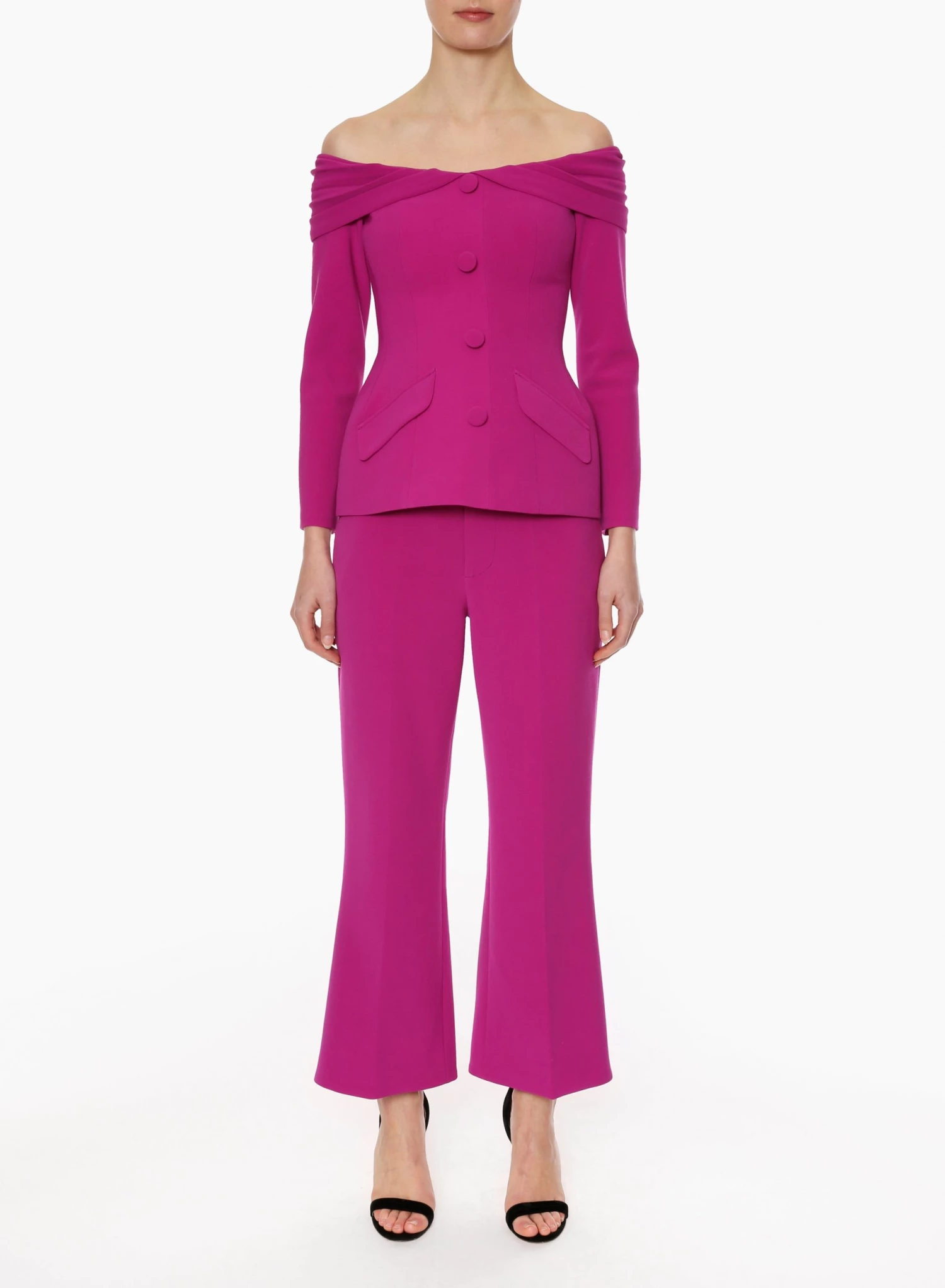 The Gabriella Blazer is cut from Italian crepe with a darted, peplum body. It has a ruched off-shoulder design, mock-buttons and pockets at the front. There is a concealed zip through centre-back. Paired with the Jill Trouser.