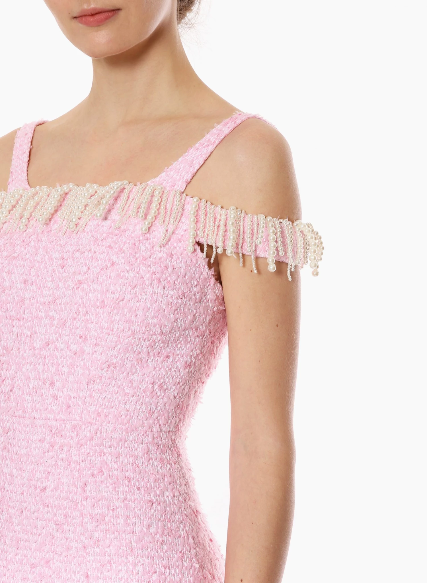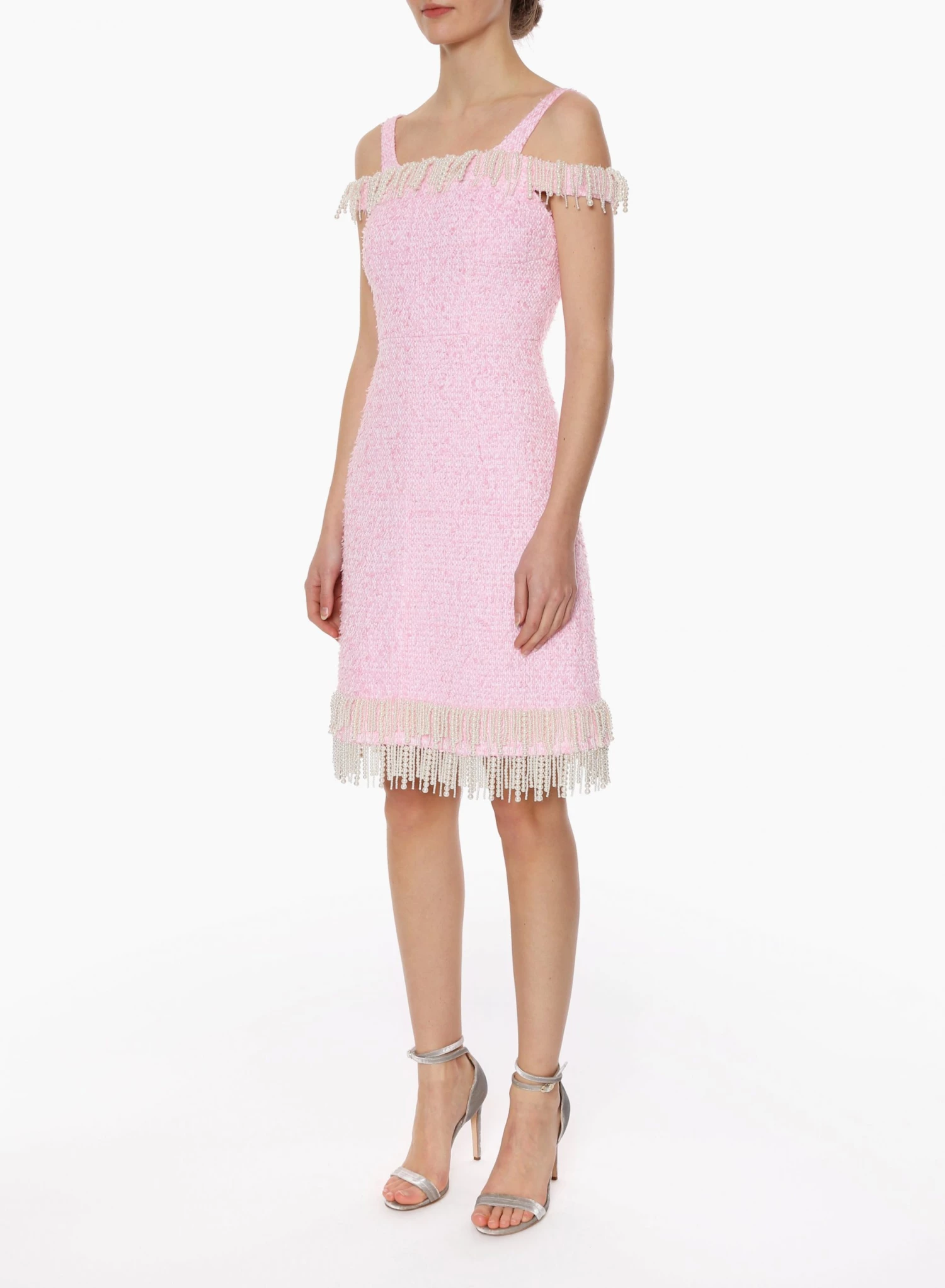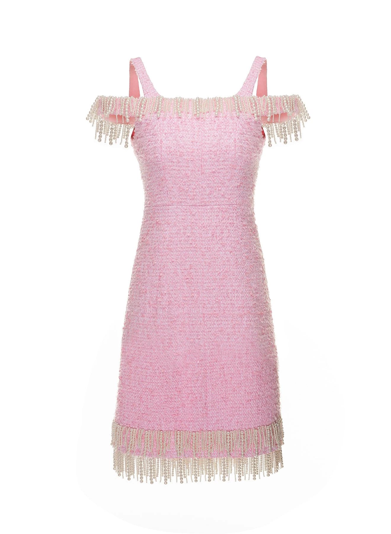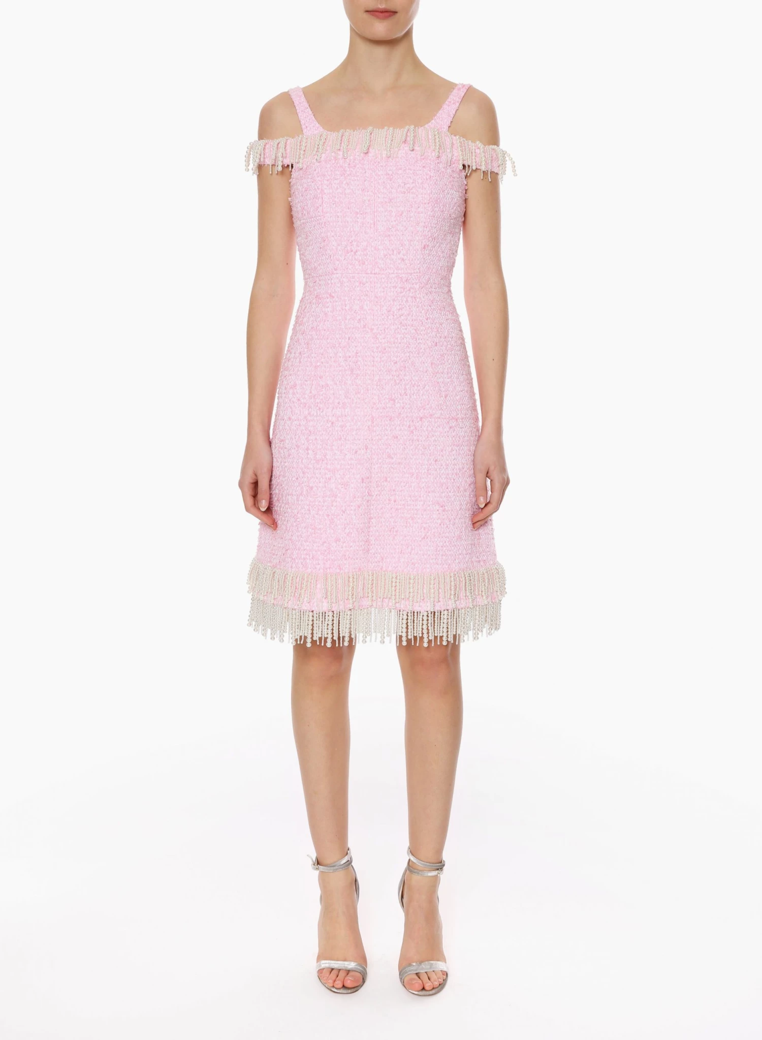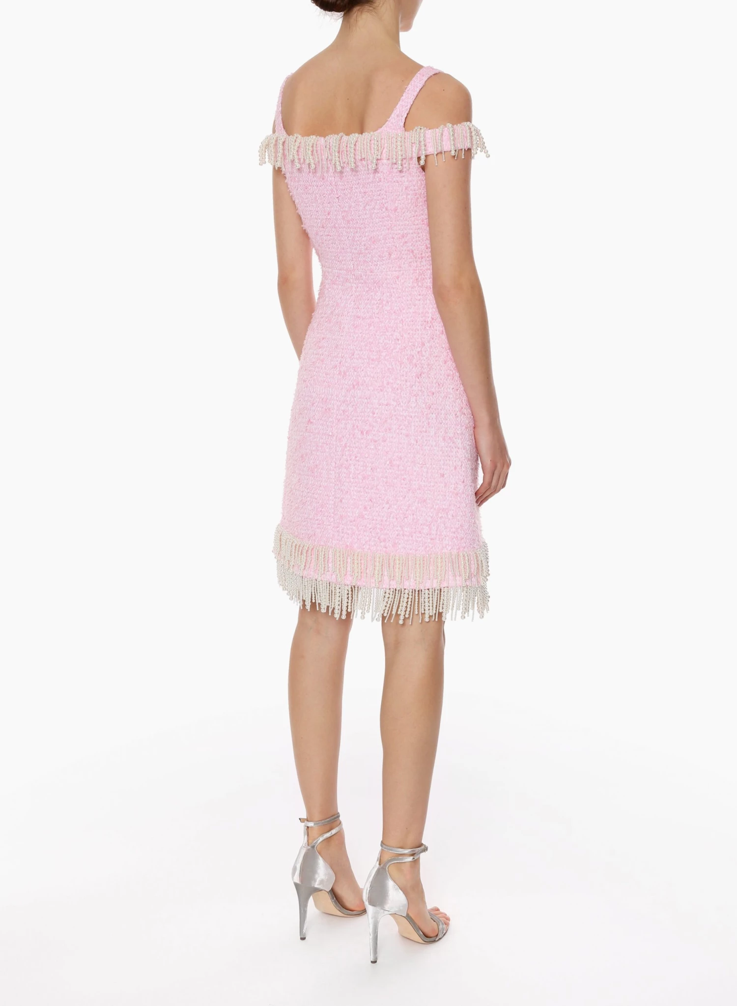The Lila dress is a slim-fitting knee-length silhouette made from bouclé-tweed, woven with subtle metallic threads. The Lila has straps and an off-shoulder design and is embellished with rows of faux pearl fringing.