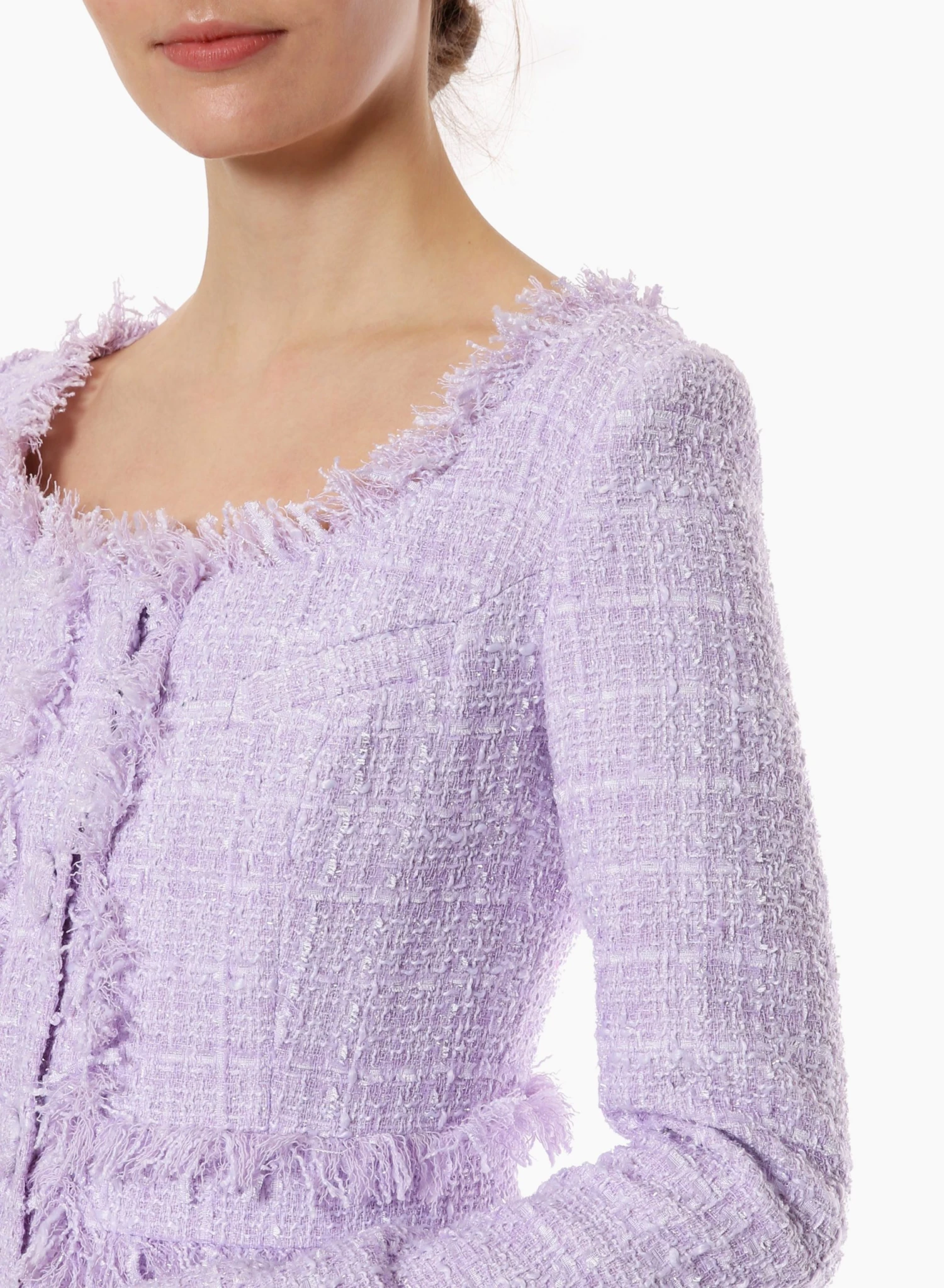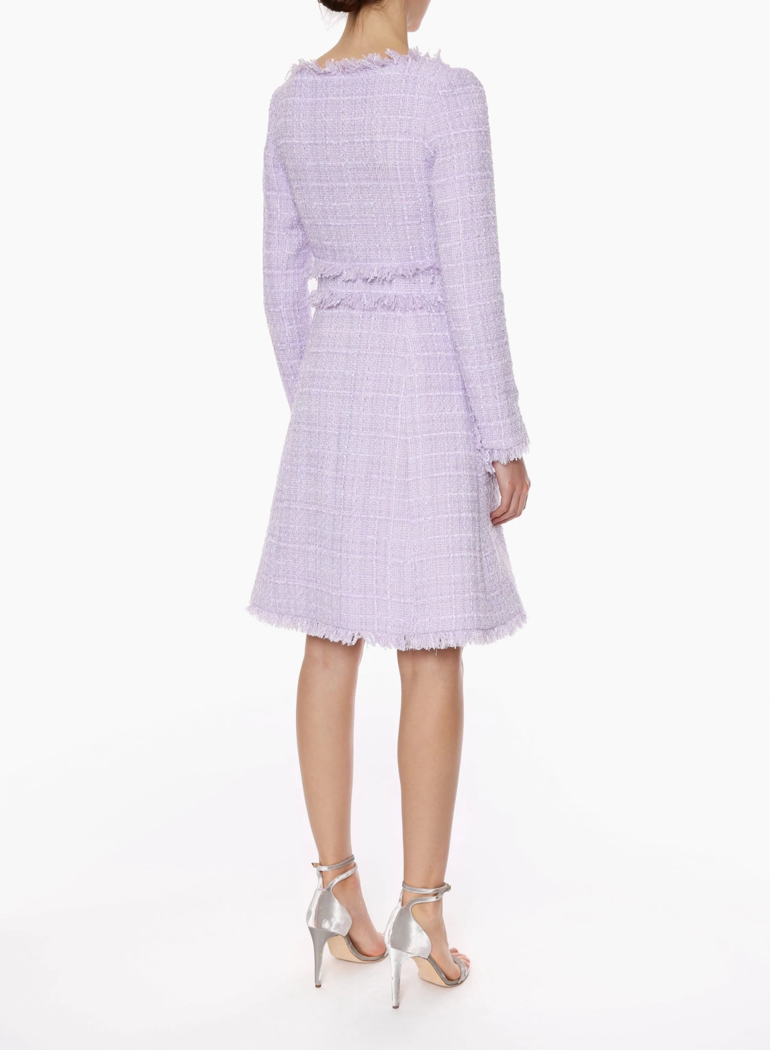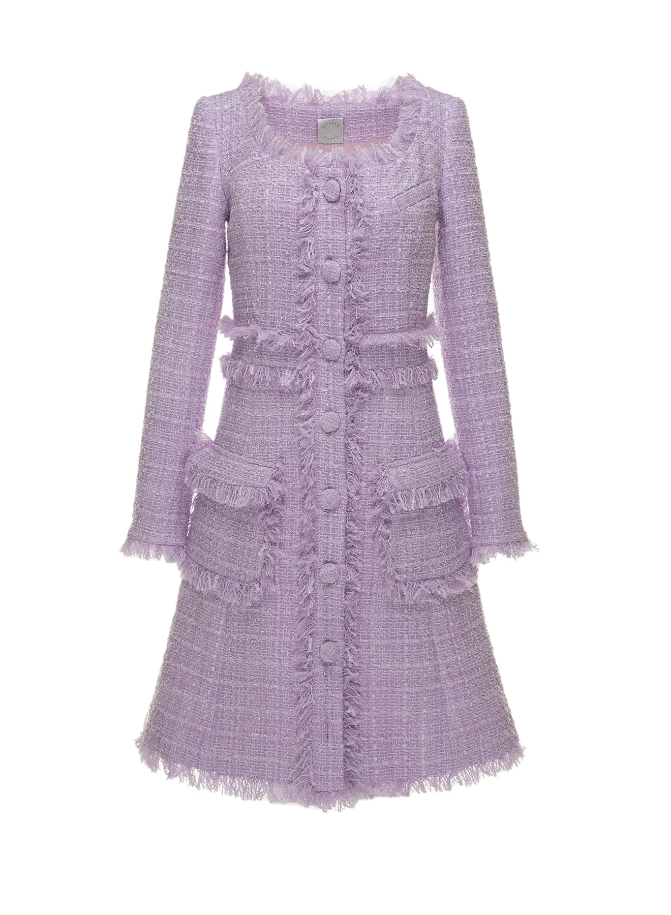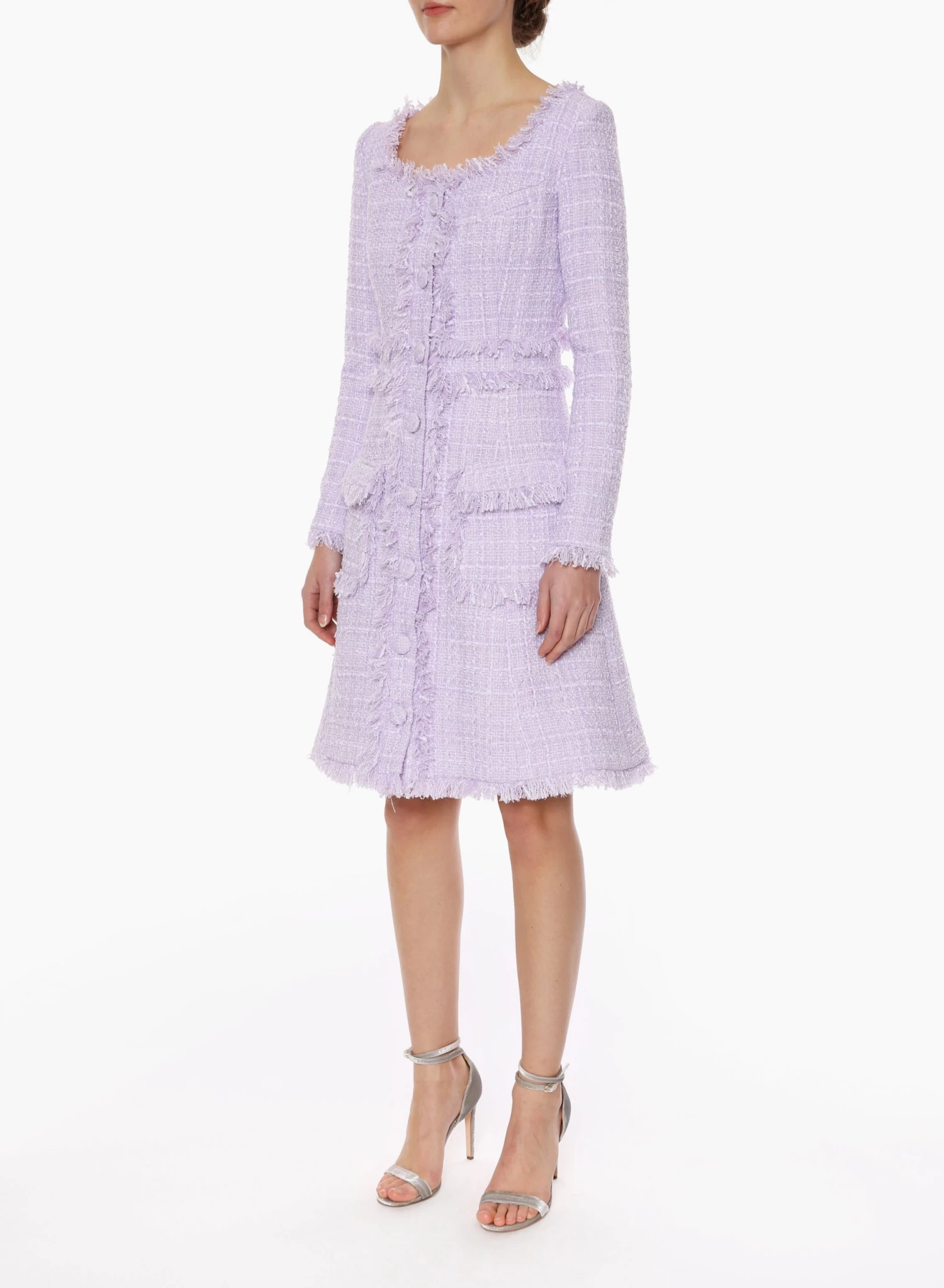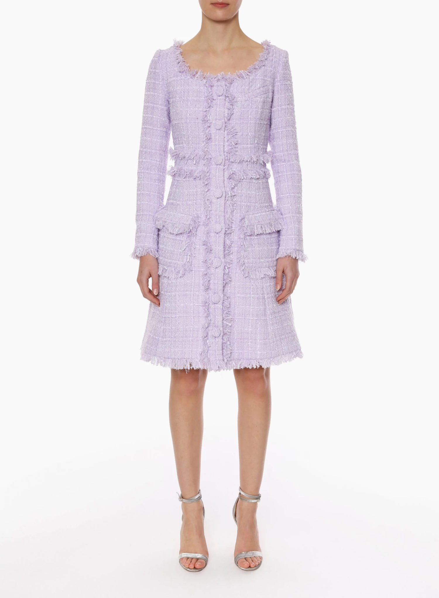 The Natasha dress is a slim fitting, over the knee length dress made from bouclé-tweed, woven with subtle metallic threads. The Natasha has buttons at the front, allowing it to become a coat. It has long sleeves and a scoop neckline.