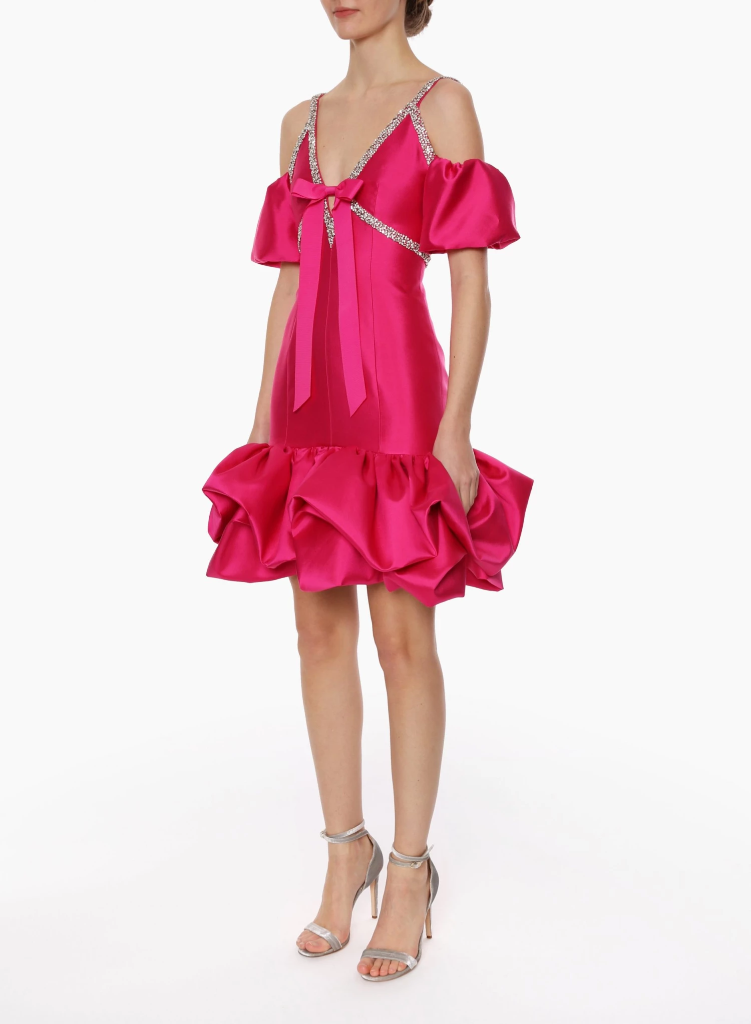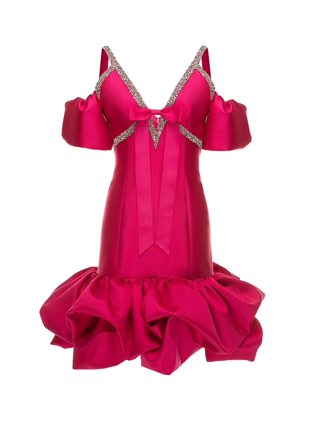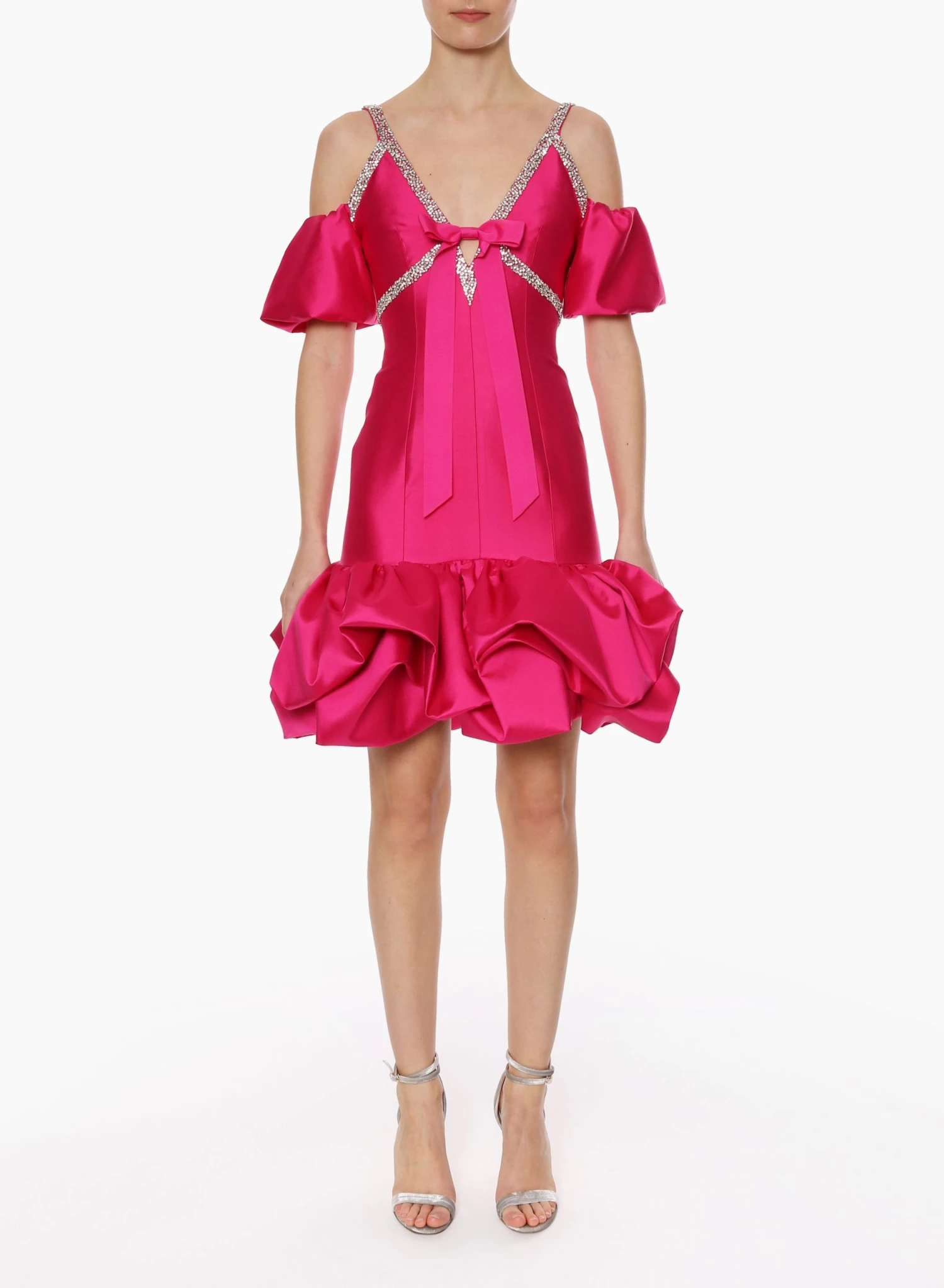 The Rena Dress is constructed from silk and wool taffeta, with shaping darts throughout the body and crystal embellishment that details the neckline and waist. The Rena features voluminous, off-shoulder puff sleeves balanced by an oversized 3D ruffle hem. It has a small cut-out at the bust line and a tonal grosgrain bow that falls at centre front.