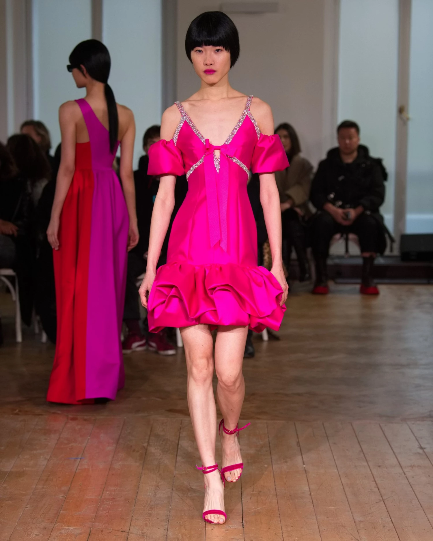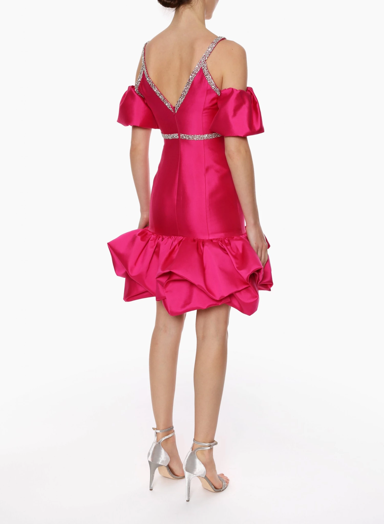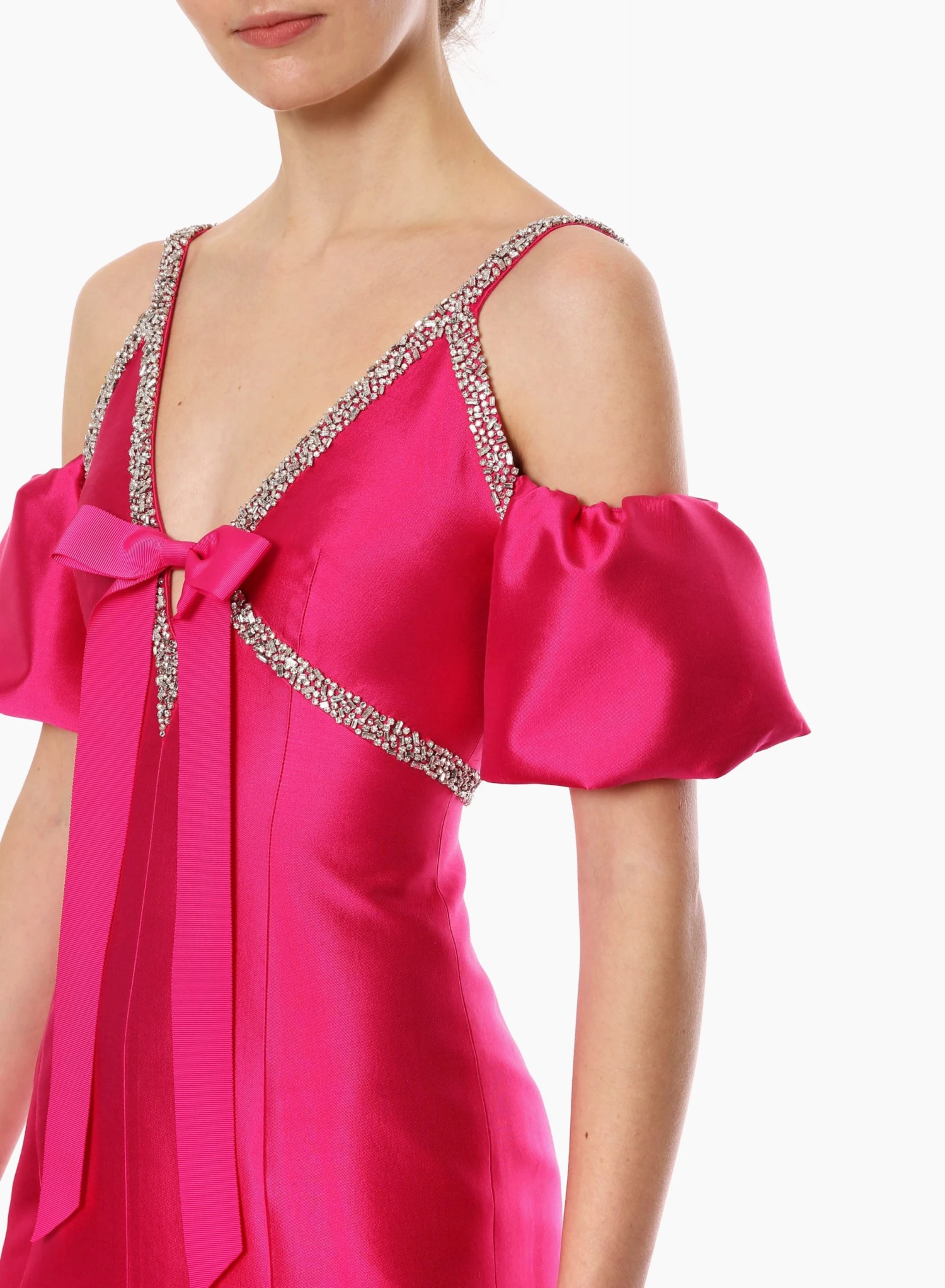 The Rena Dress is constructed from silk and wool taffeta, with shaping darts throughout the body and crystal embellishment that details the neckline and waist. The Rena features voluminous, off-shoulder puff sleeves balanced by an oversized 3D ruffle hem. It has a small cut-out at the bust line and a tonal grosgrain bow that falls at centre front.