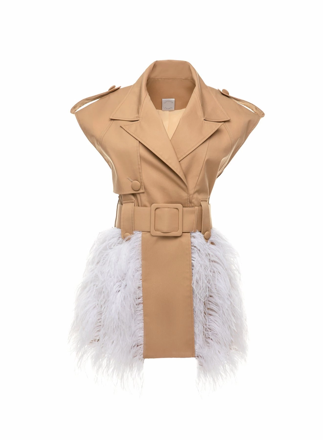 The Raya is sleeveless, safari style, sand coloured jacket made from a midweight cotton. It has trench coat shaped neckline, a self-fabric removable belt and white ostrich feather trim.