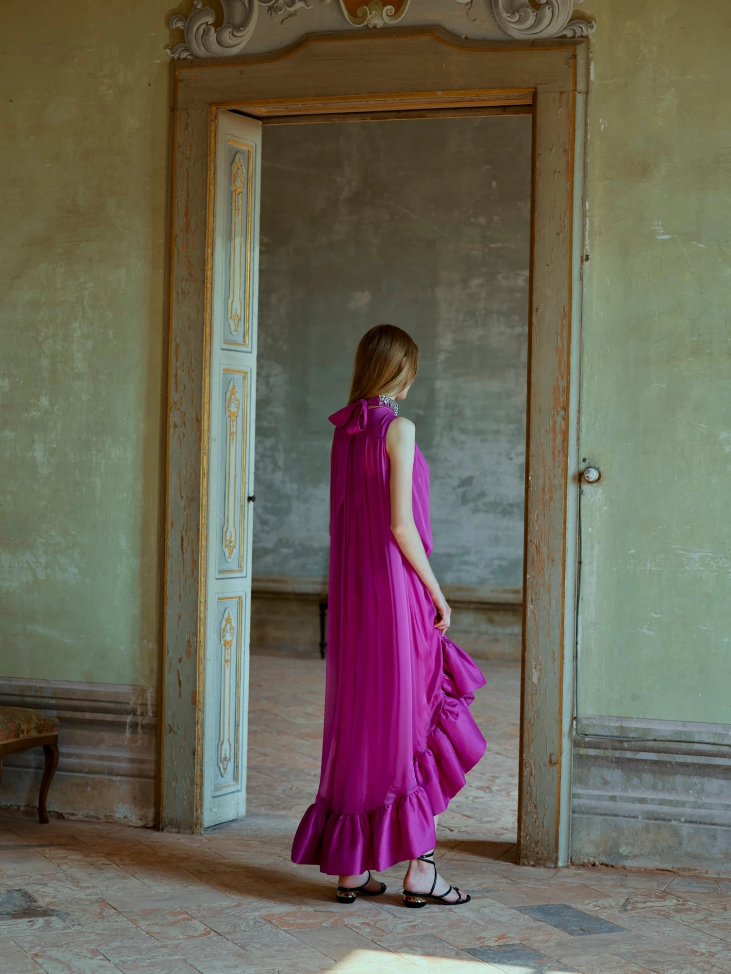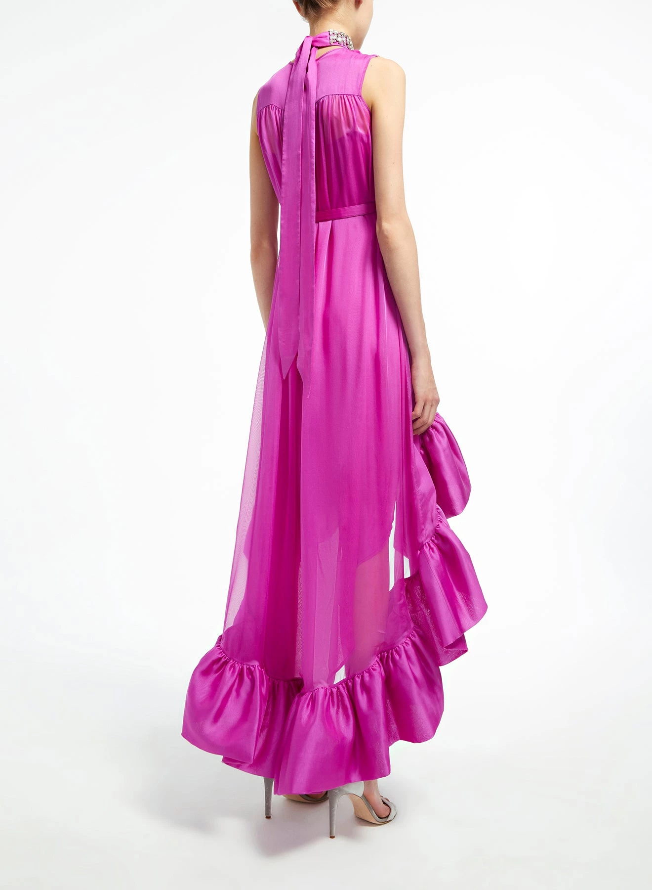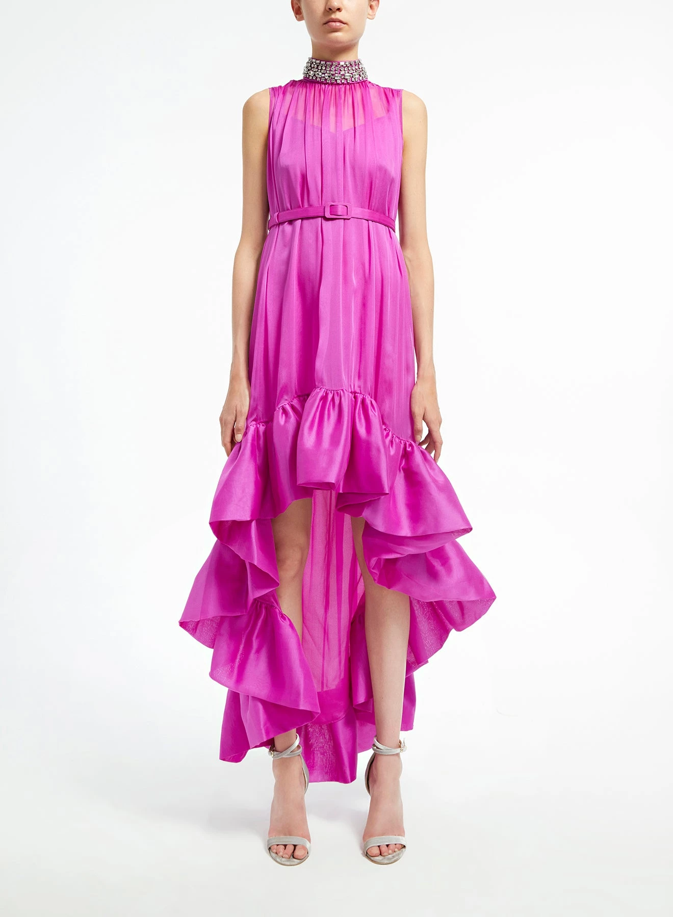 The Winnie dress is a sleeveless asymmetric flounce dress made from fuchsia voile. It has a loose fit and a removable belt to enhance the waist. The halter neck and the ruffled skirt makes this look unique for every event, either if it is day time or evening.