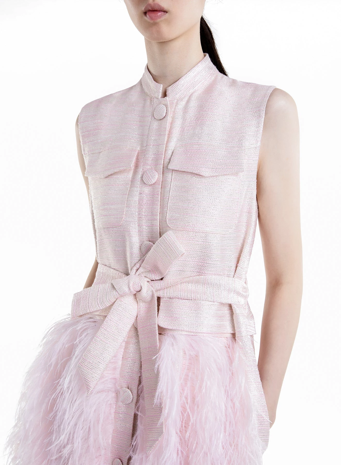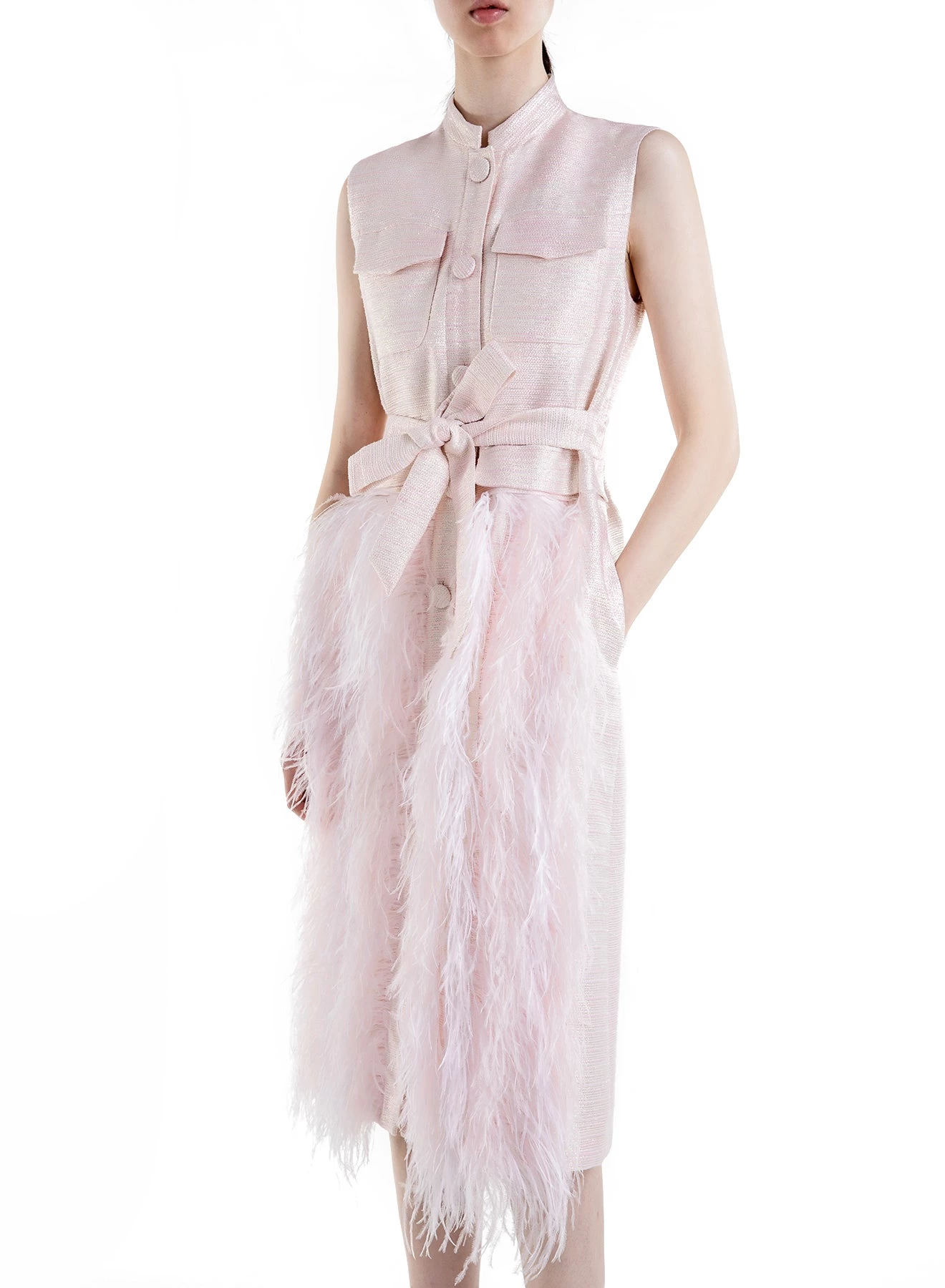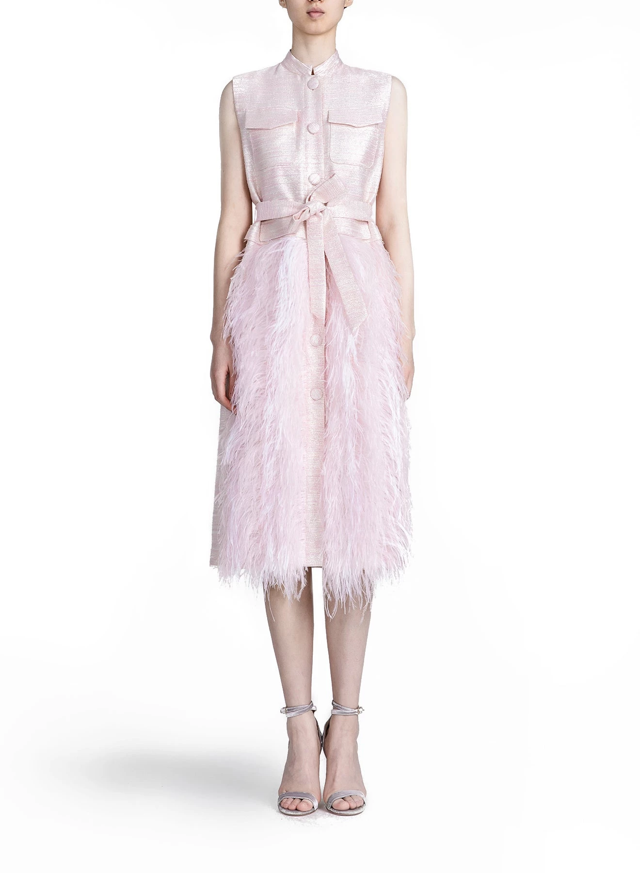 The signature Wyatt gilet is offered in a lurex tweed that is a pastel pink with hints of gold lurex. The Ostrich feathers are embroidered on the front of the gilet which has a tied belt. Can be worn both as a coat or as a dress.