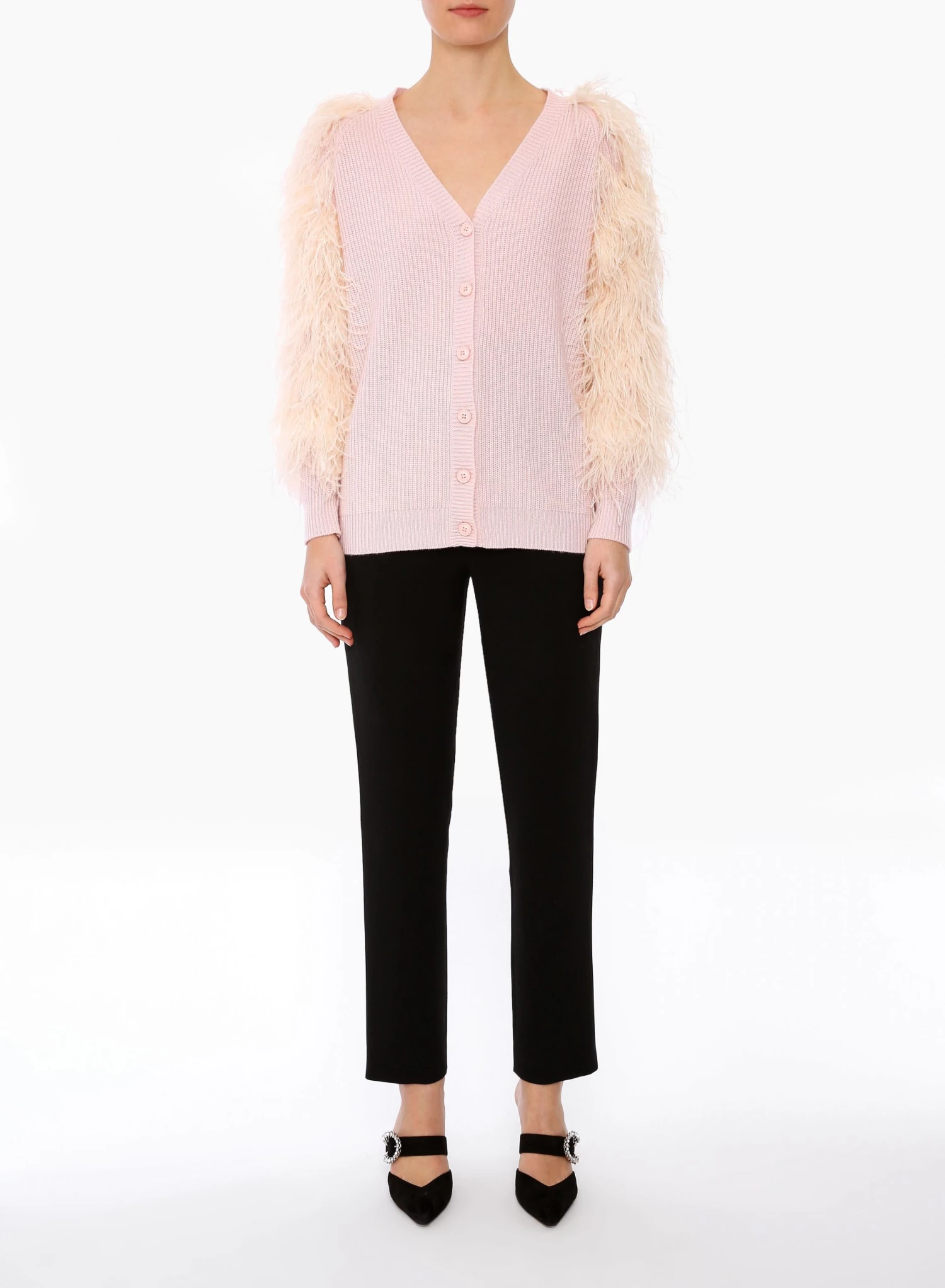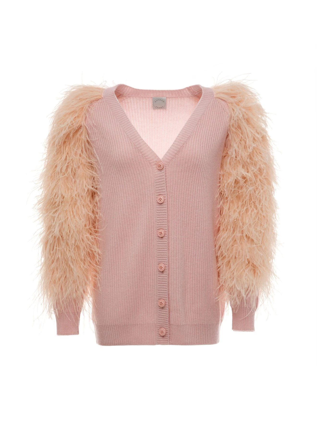 The Elin is a 100% cashmere rib button-down cardigan. The sleeves are adorned with signature ostrich feathers dyed to match the body.