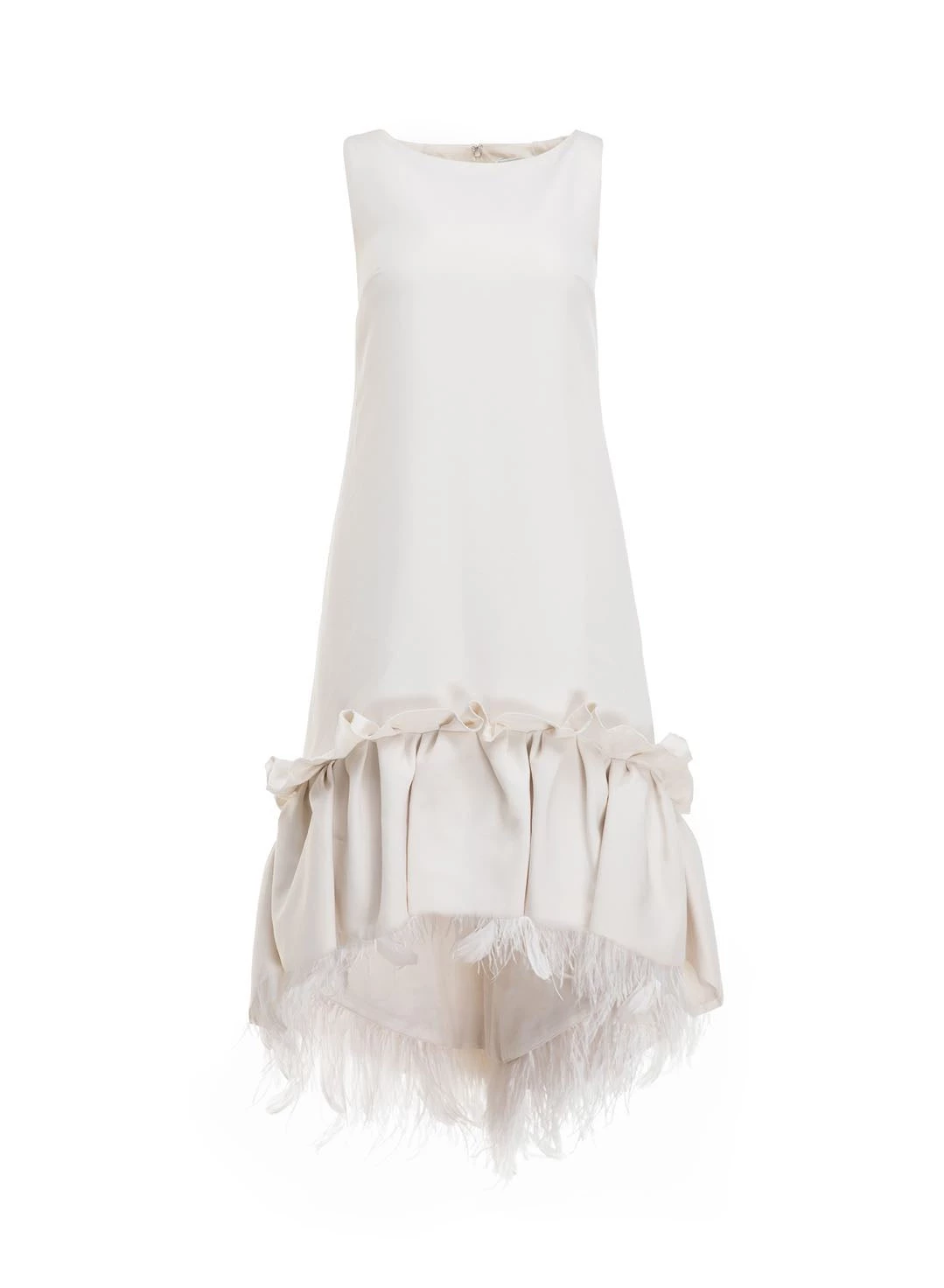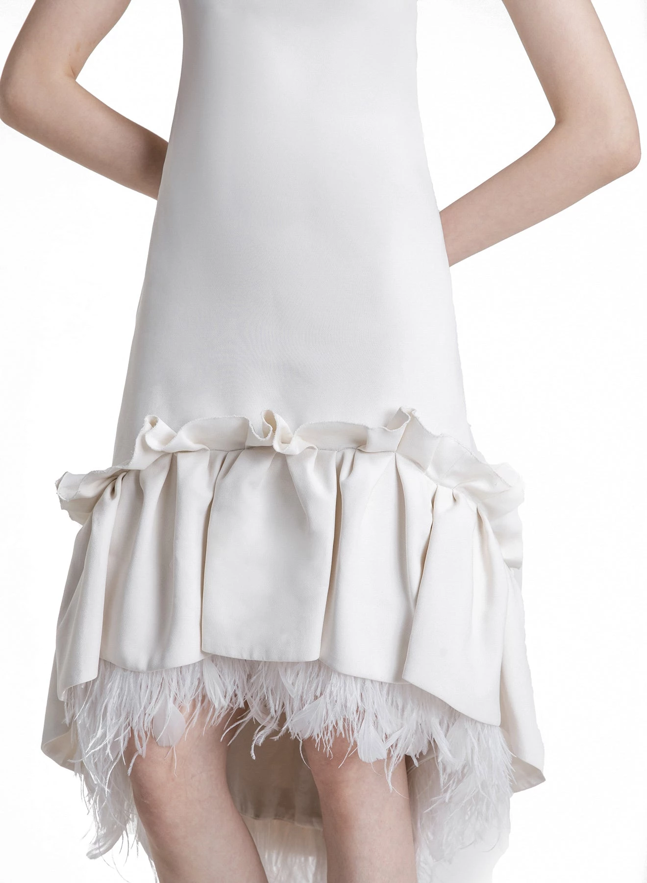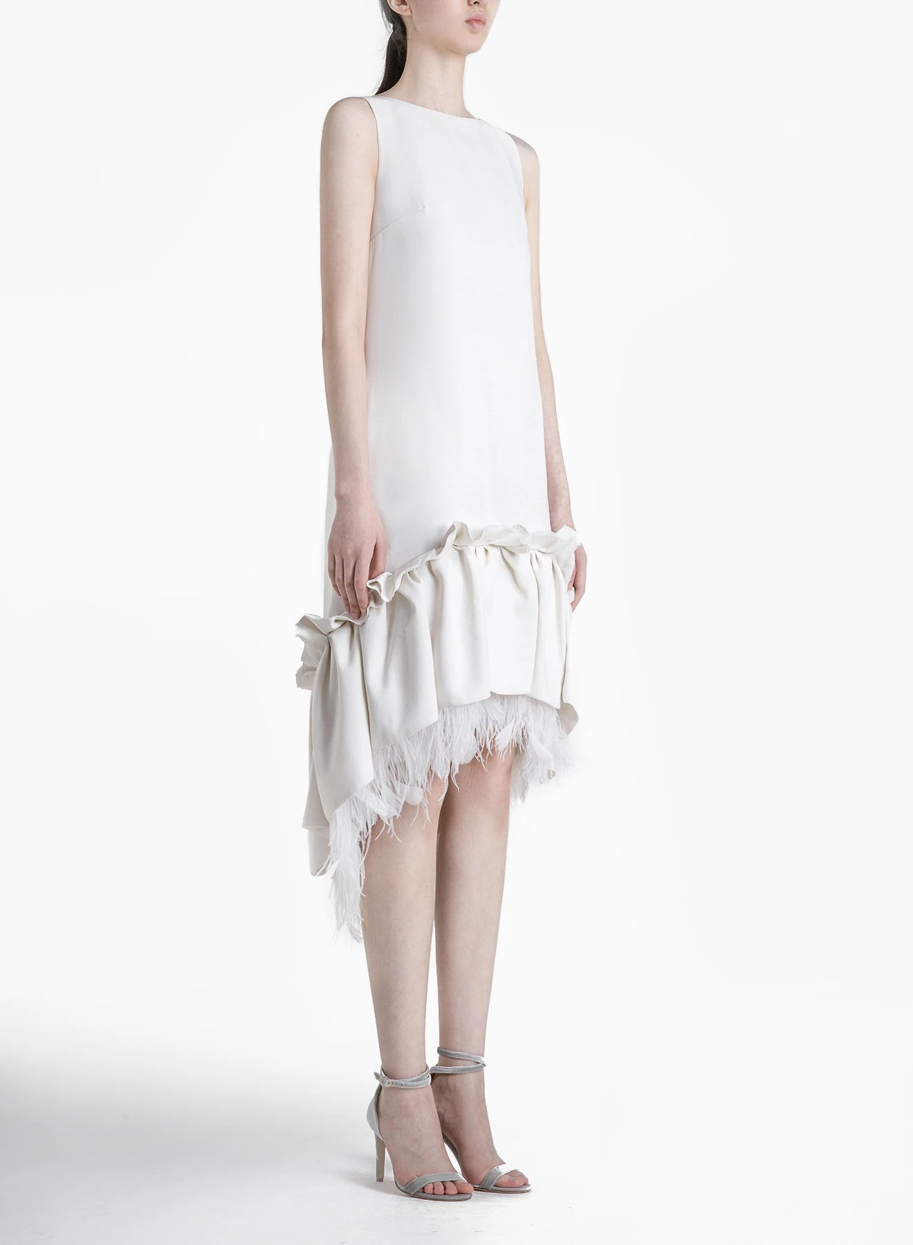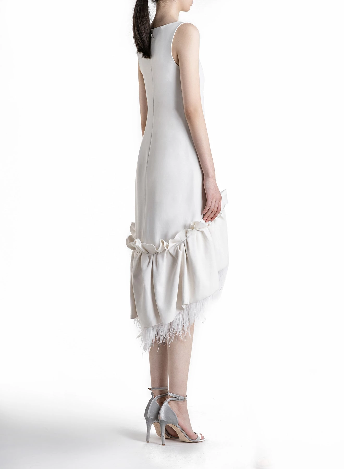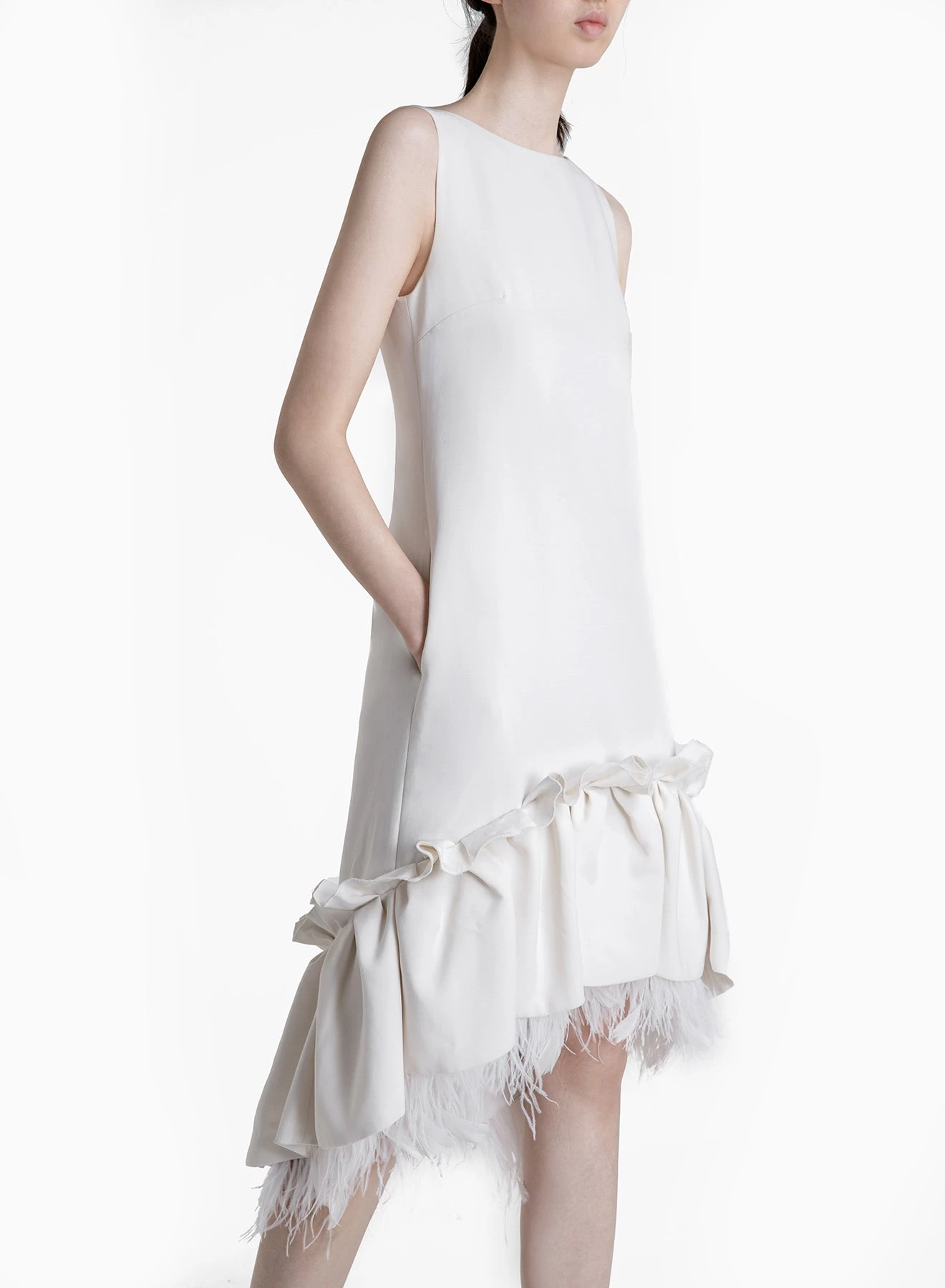 Exclusive to huishanzhang.com, the Jodie is one of HUISHAN ZHANG’s signature pieces. It’s a shift dress made out of luxurious Italian crepe and with a rich embellishment of feathers along the gathers on the flounce. The neckline is a flattering boatneck. Also available in Black.
